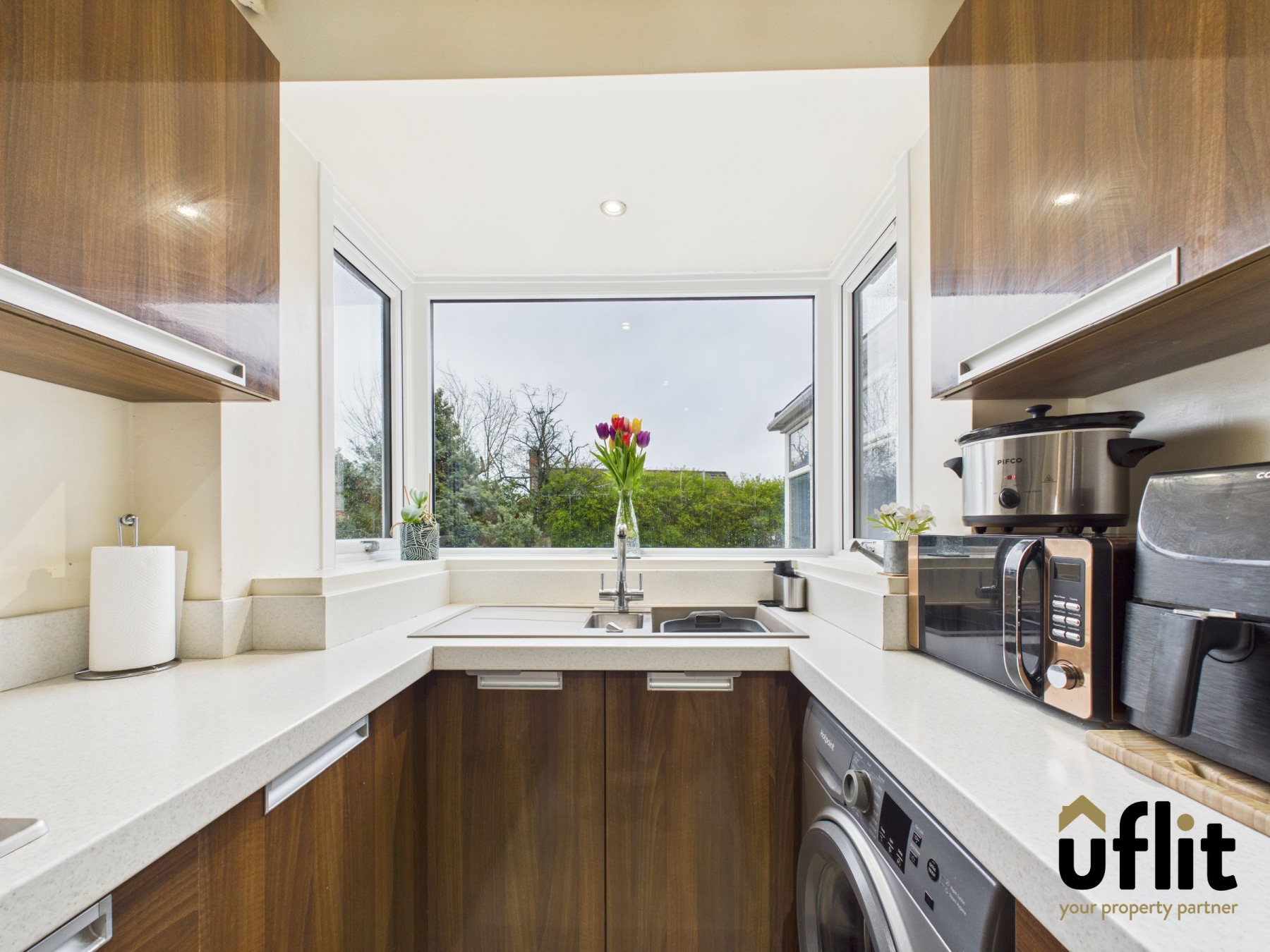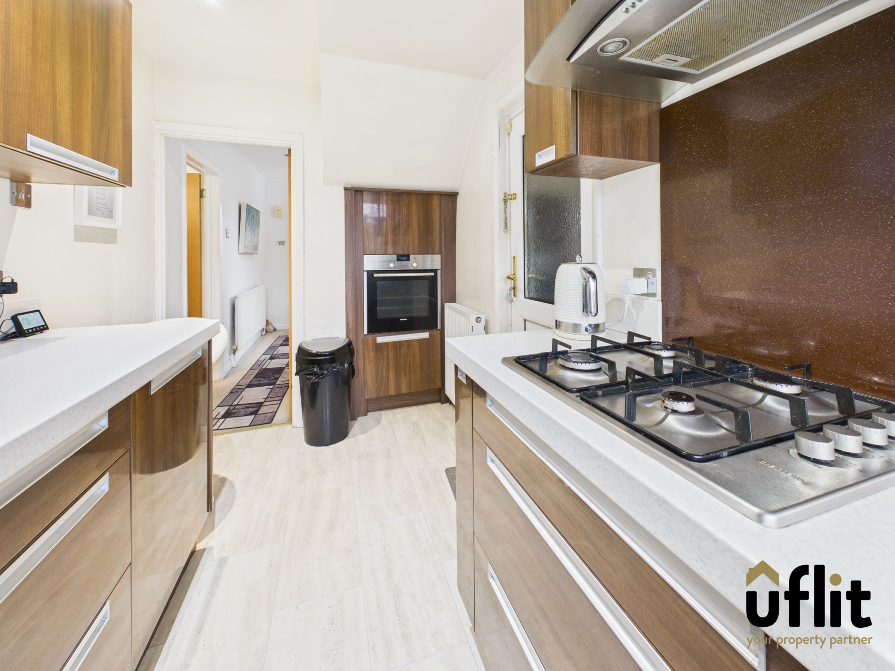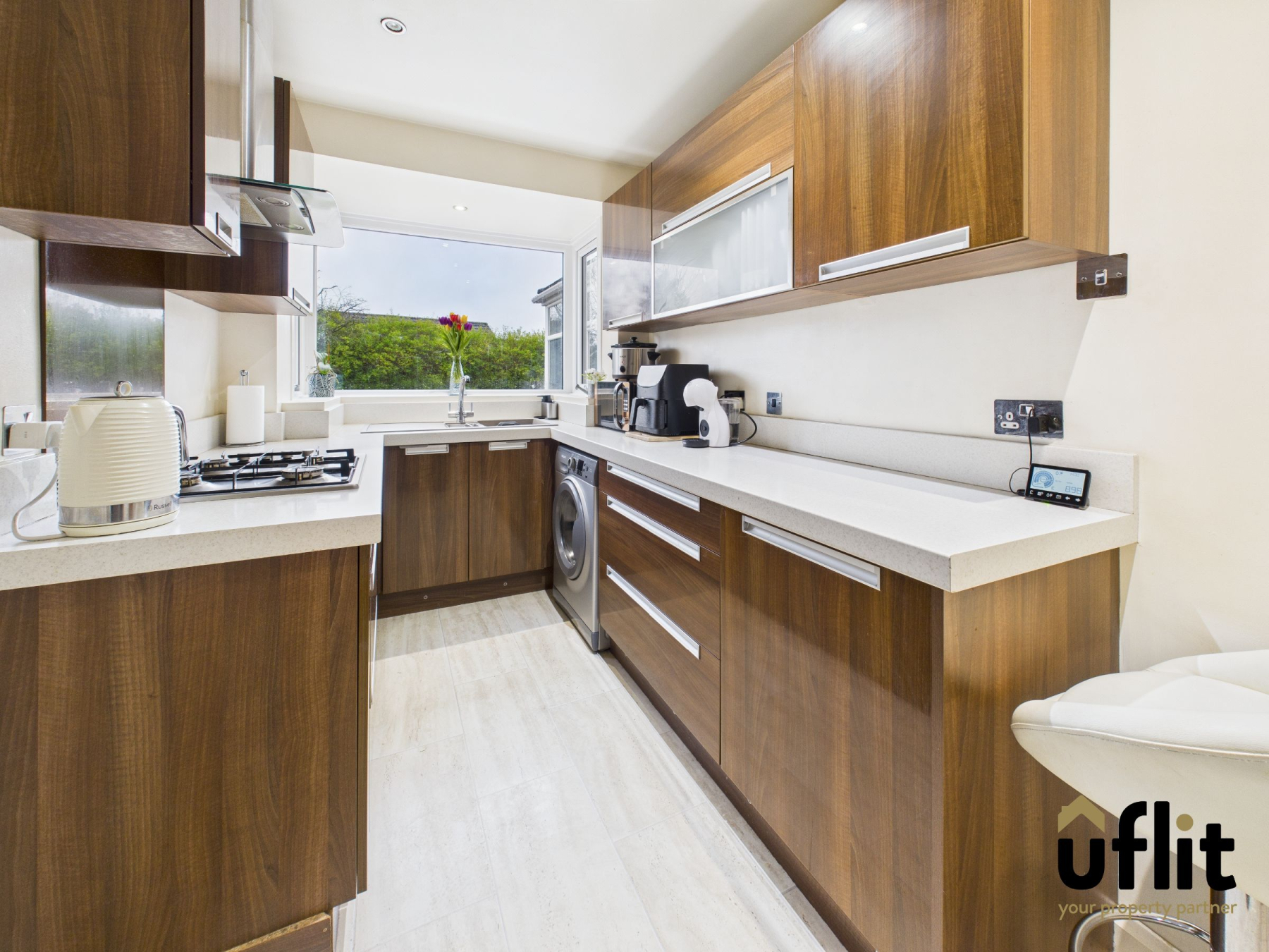 The well-appointed kitchen features tiled flooring and a range of integrated appliances including an electric oven, gas hob, extractor fan with integrated lighting, dishwasher and fridge. There is space and plumbing for a washing machine, along with stylish floor-level lighting beneath the units. A bay window overlooks the rear garden, filling the room with light and a door provides direct access to the integrated garage.