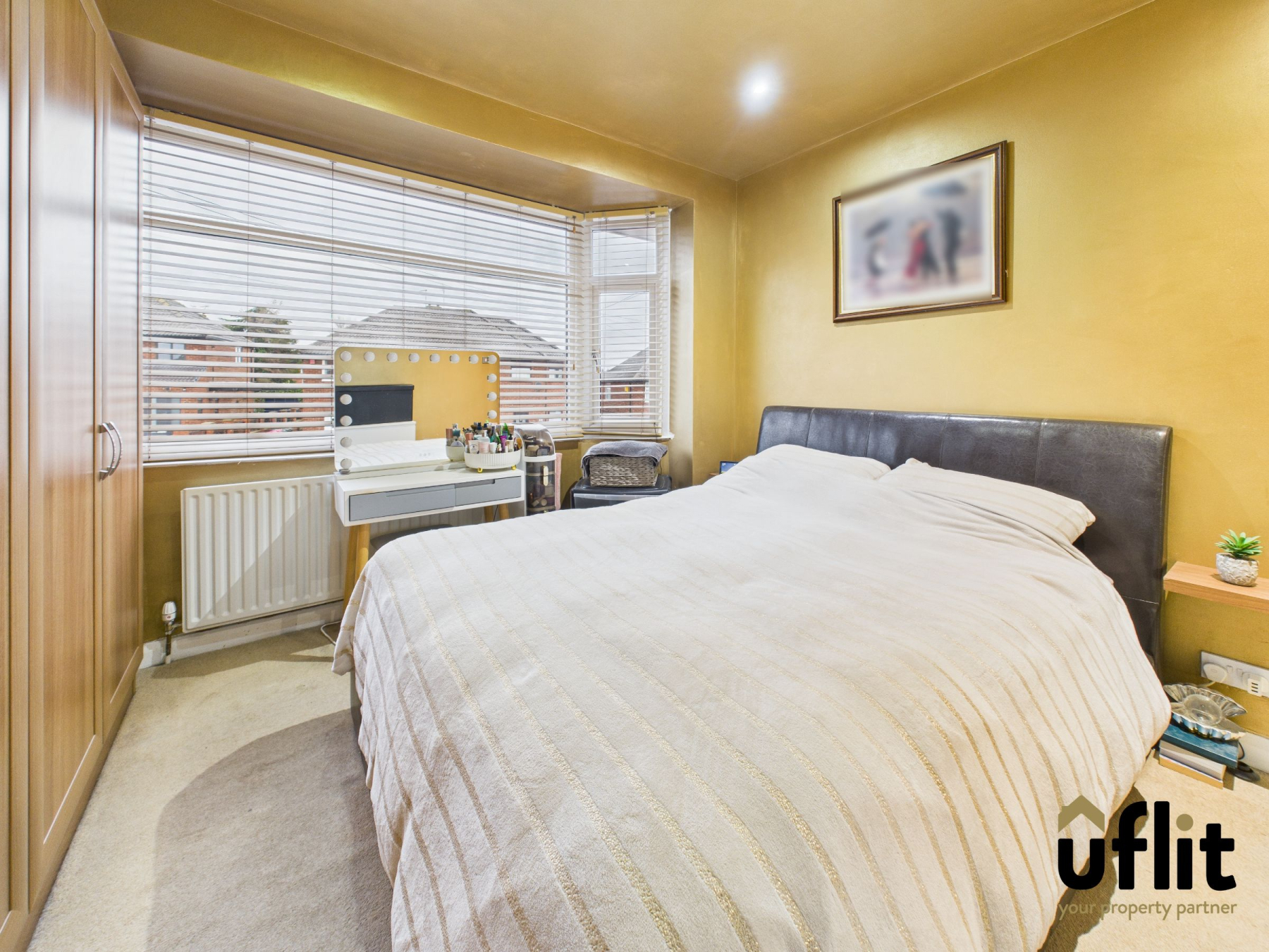 The generously sized master bedroom features carpeted flooring, a radiator, triple fitted wardrobes and a bay window to the front of the property.