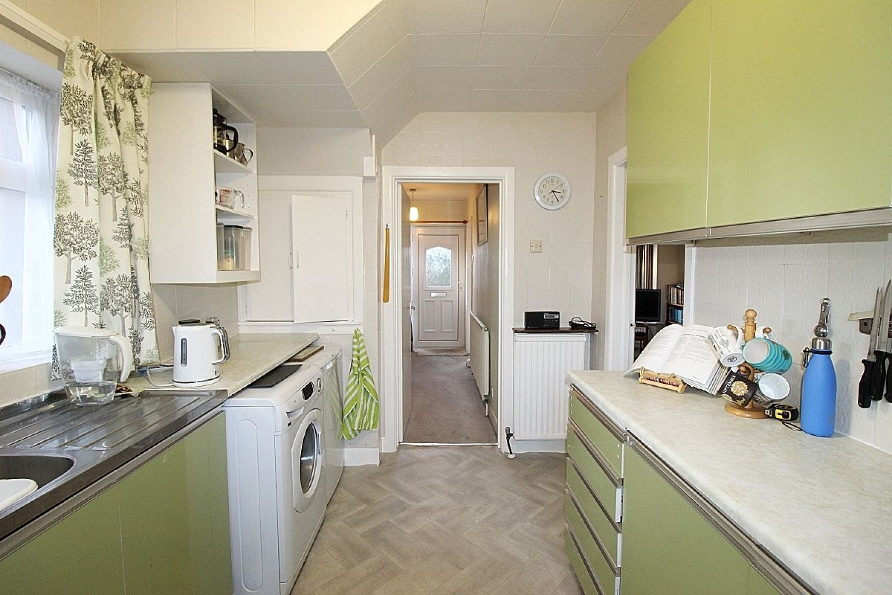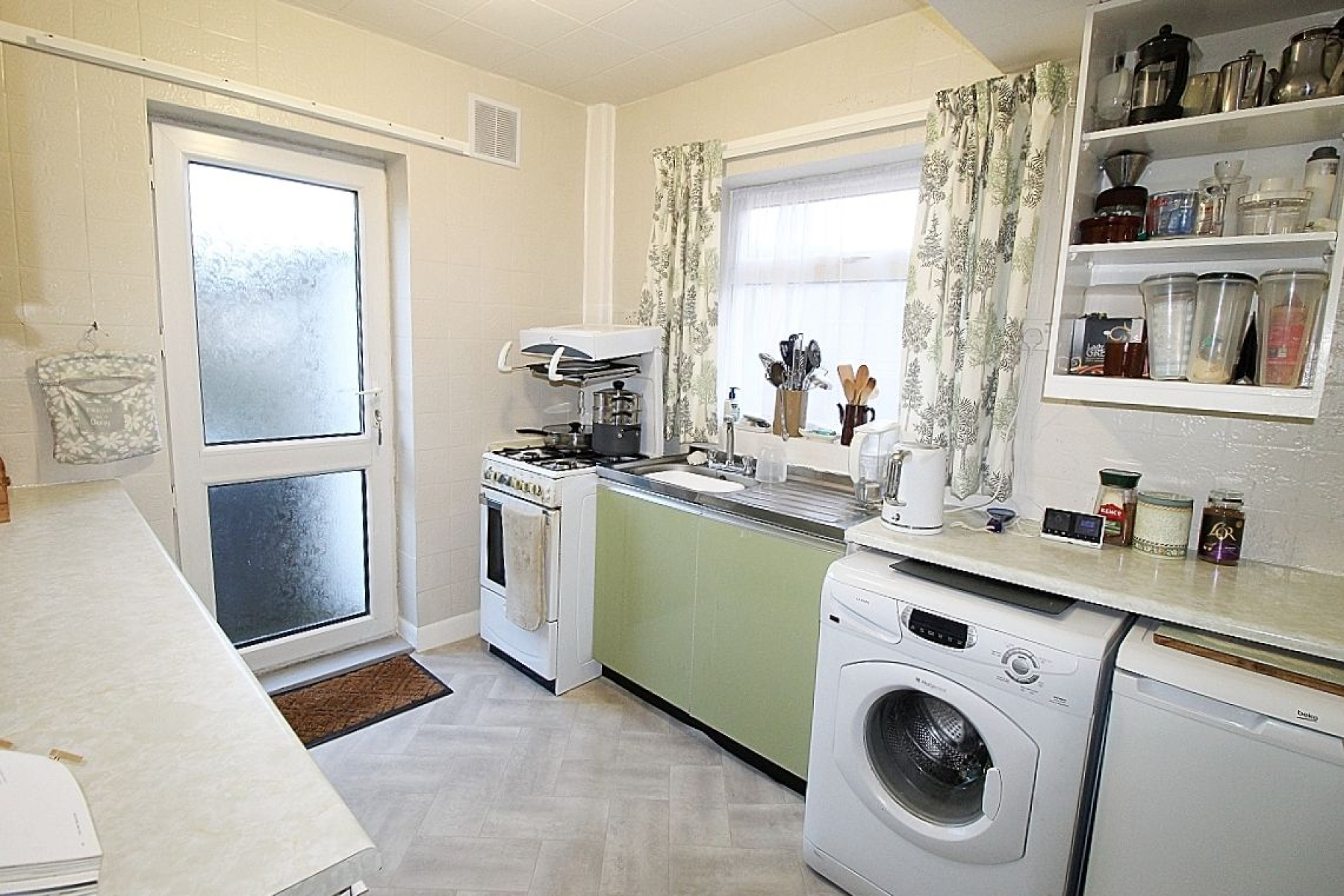 Kitchen w: 2.4m x l: 3.2m (w: 7' 10" x l: 10' 6") Featuring a range of wall and base units with complimentary work surface areas and tiled back panels. Plumbing for further utilities, vinyl flooring, radiator, a side facing upvc window and a glazed upvc door to the garden.