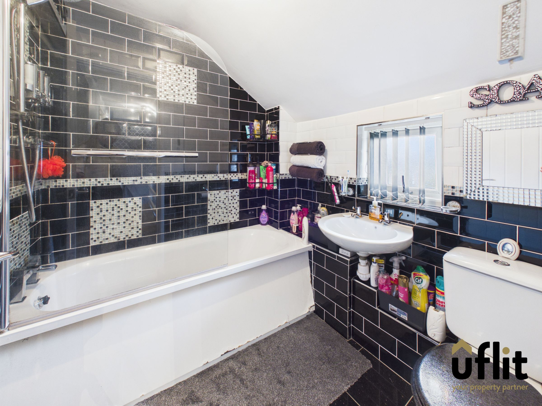 The family bathroom comprises a bath with shower over, WC and wash basin, forming a clean and contemporary suite.