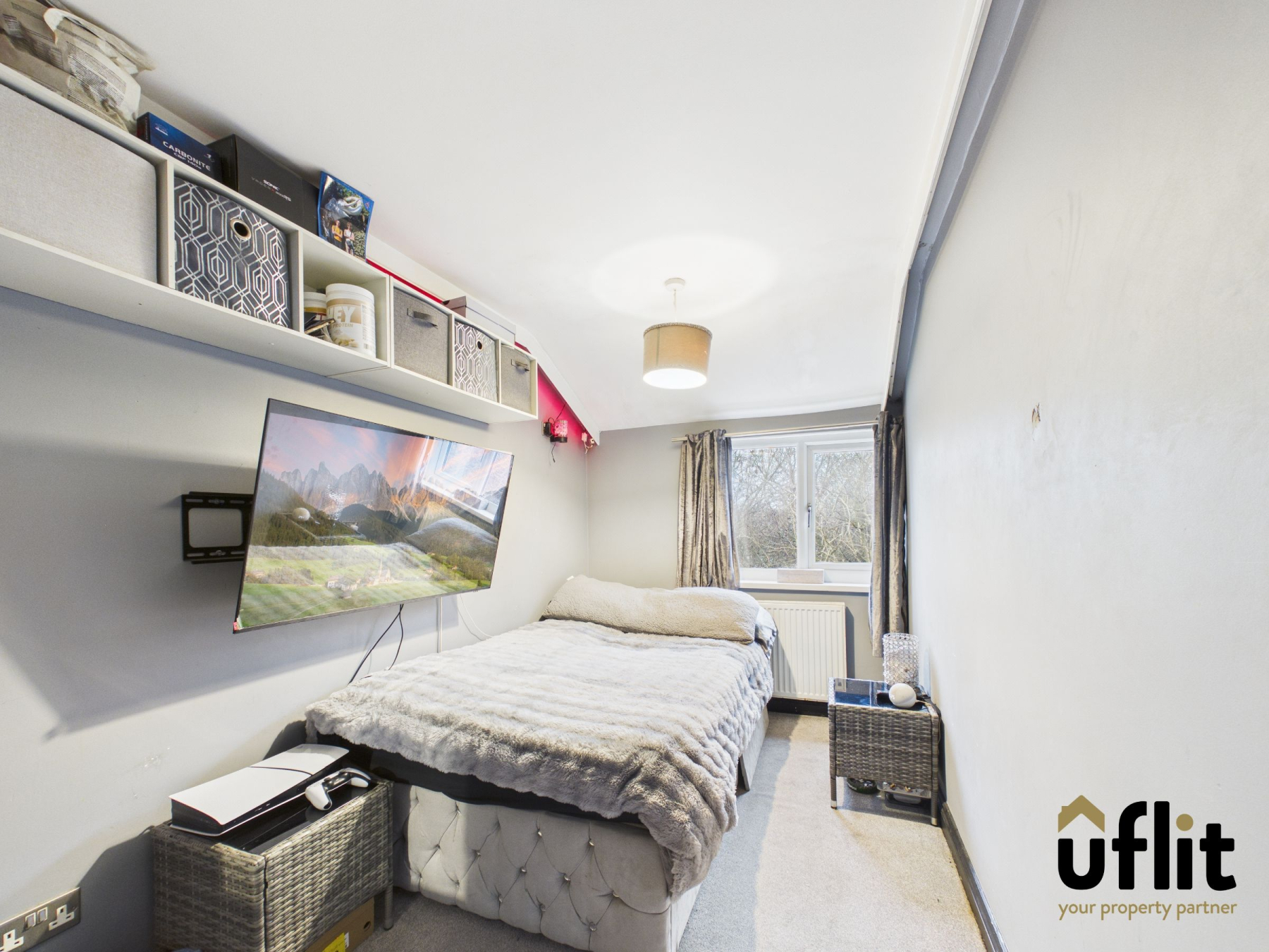 Situated to the rear of the property, Bedroom Three overlooks the garden. Currently used as a dressing room, it features fitted mirrored wardrobes, carpeted flooring and a radiator. This versatile space would suit use as a nursery, home office or single bedroom.