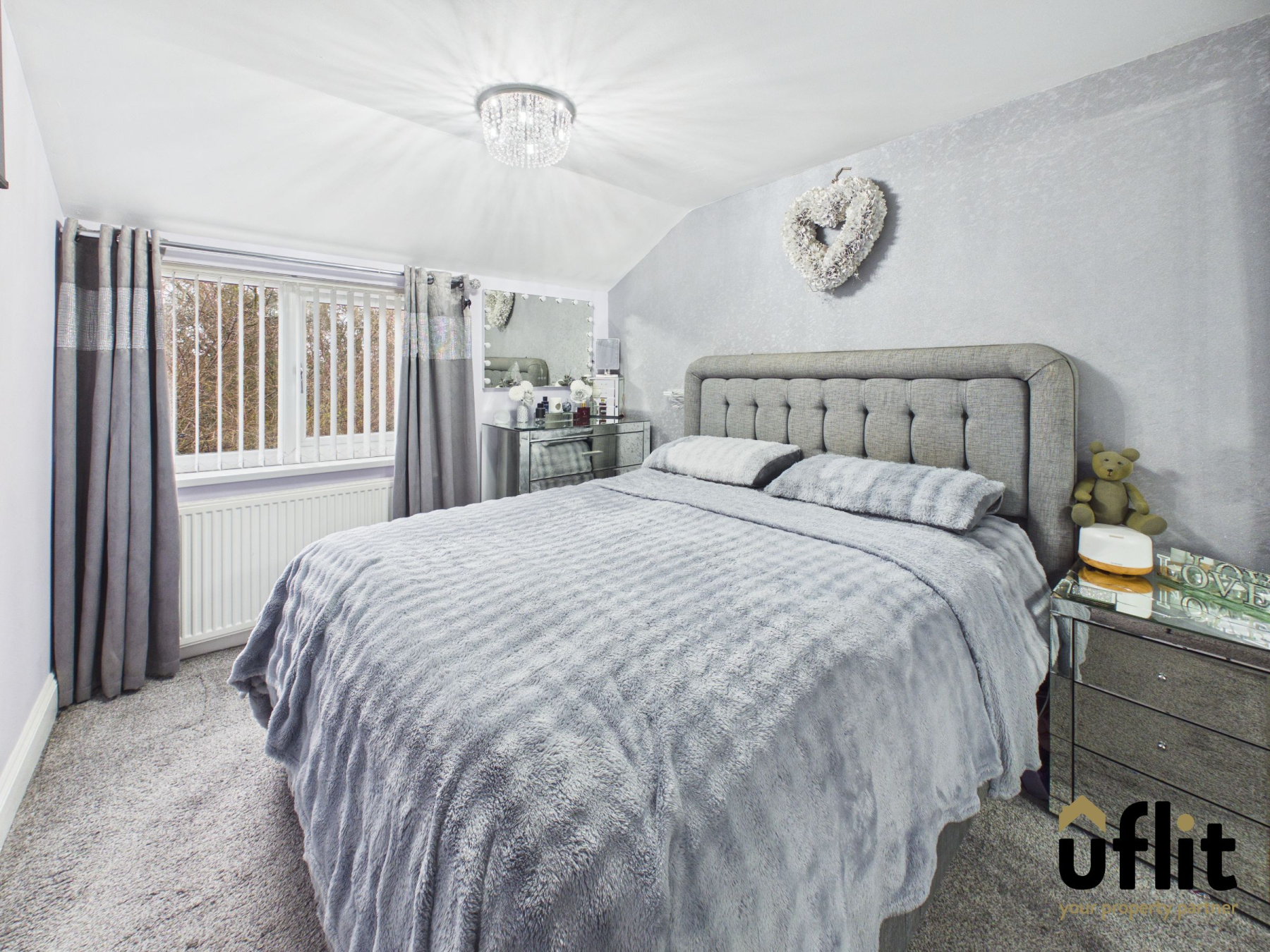 The master bedroom is a spacious double room with a rear facing window allowing for plenty of natural light. The room is finished with carpeted flooring and heated by a radiator. Fitted mirrored wardrobes provide excellent storage, while white wooden internal doors with chrome handles continue the modern aesthetic.