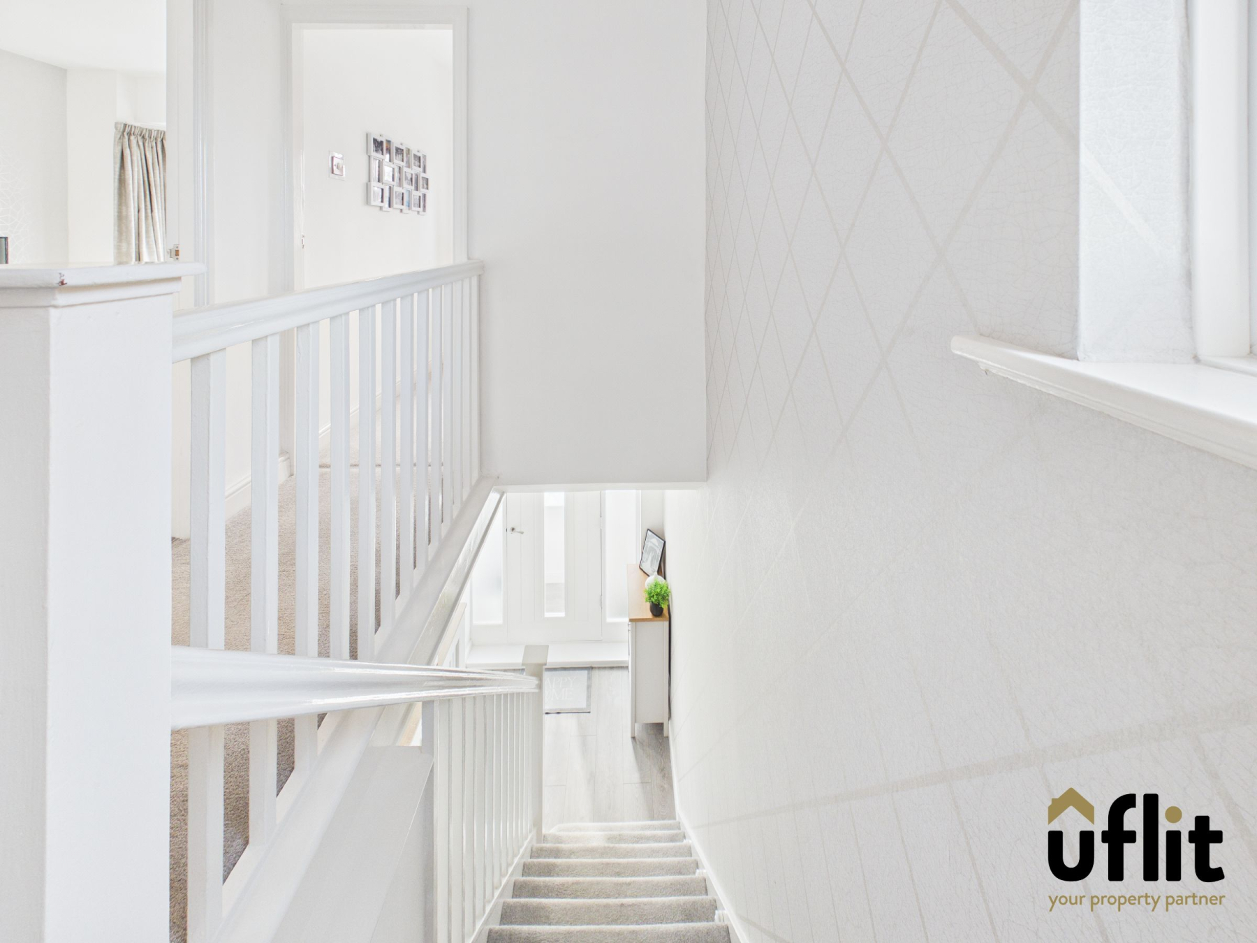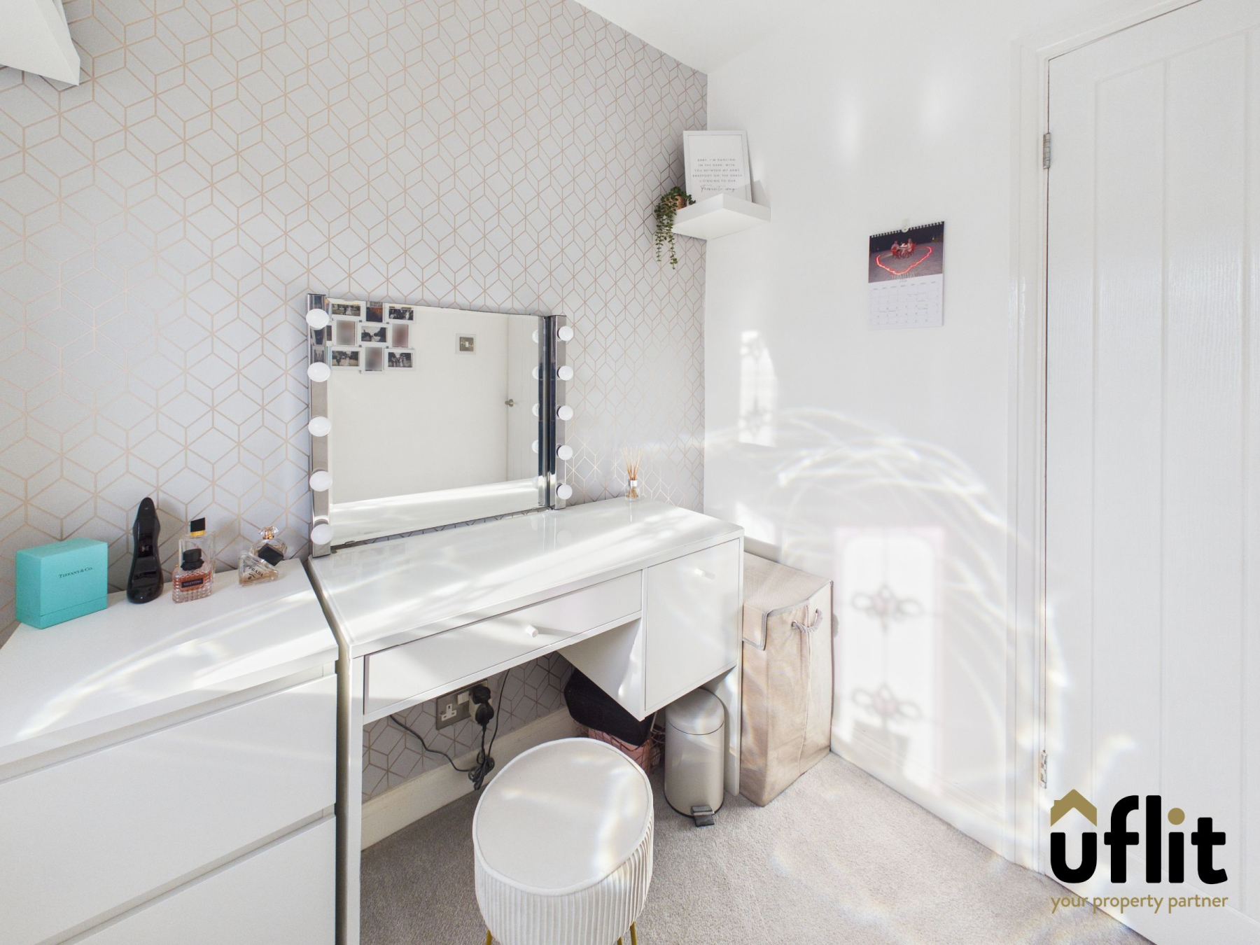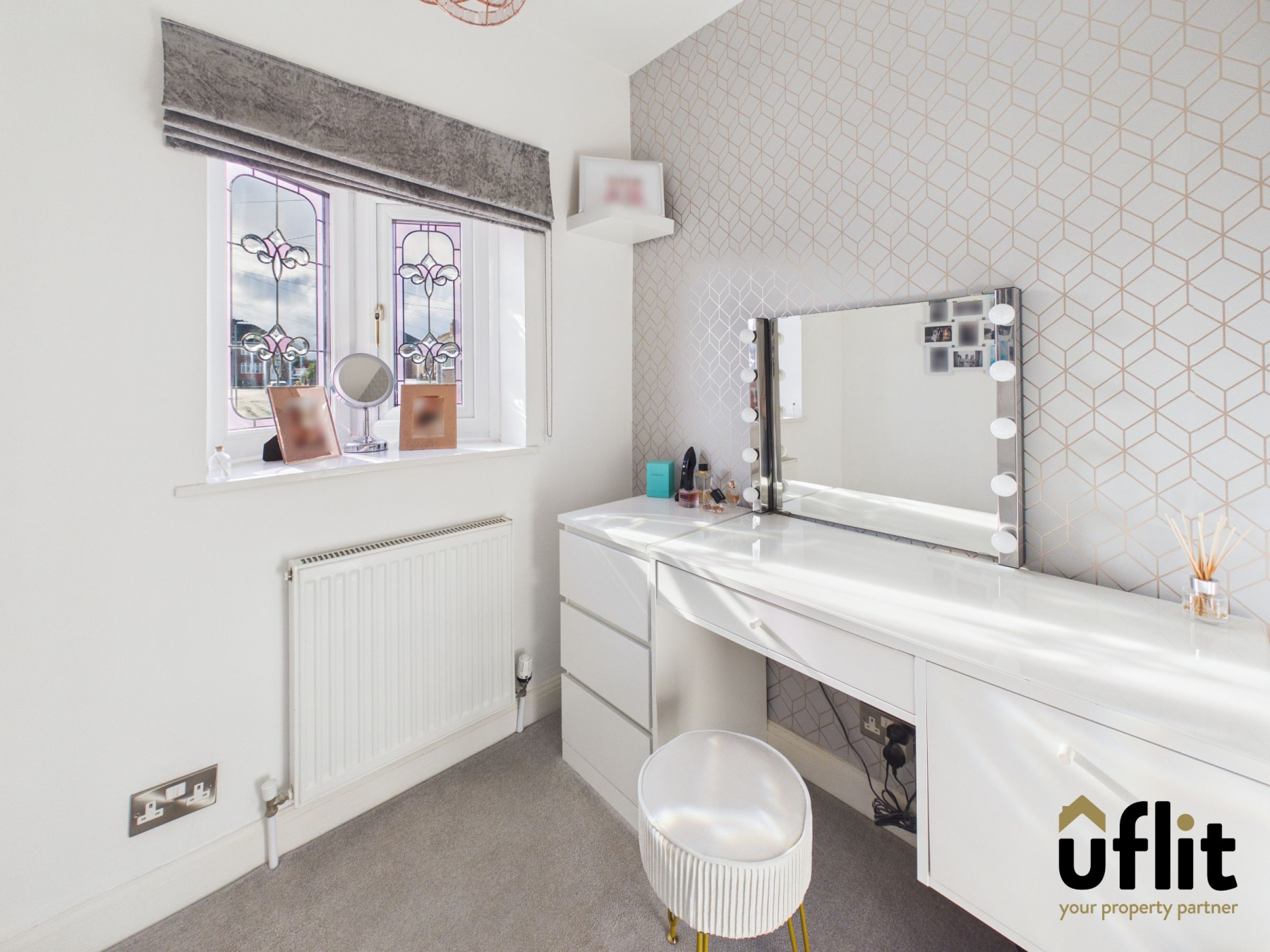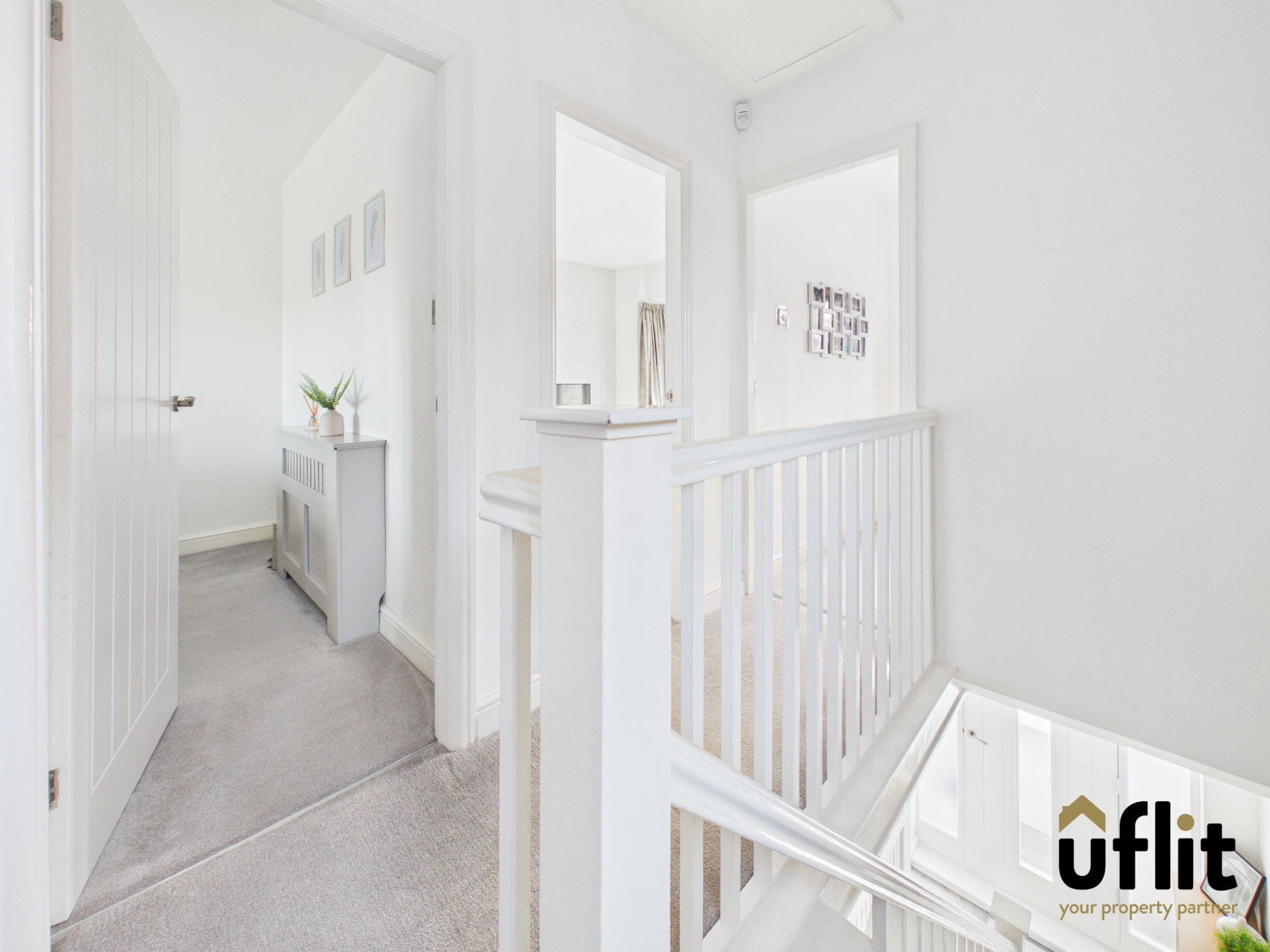 Carpeted stairs lead to the first-floor landing, which also benefits from a side-facing window at the top of the stairs, allowing natural light into the space. There is access to the loft via pull-down ladders; the loft is fully boarded and fitted with lighting, providing excellent additional storage.