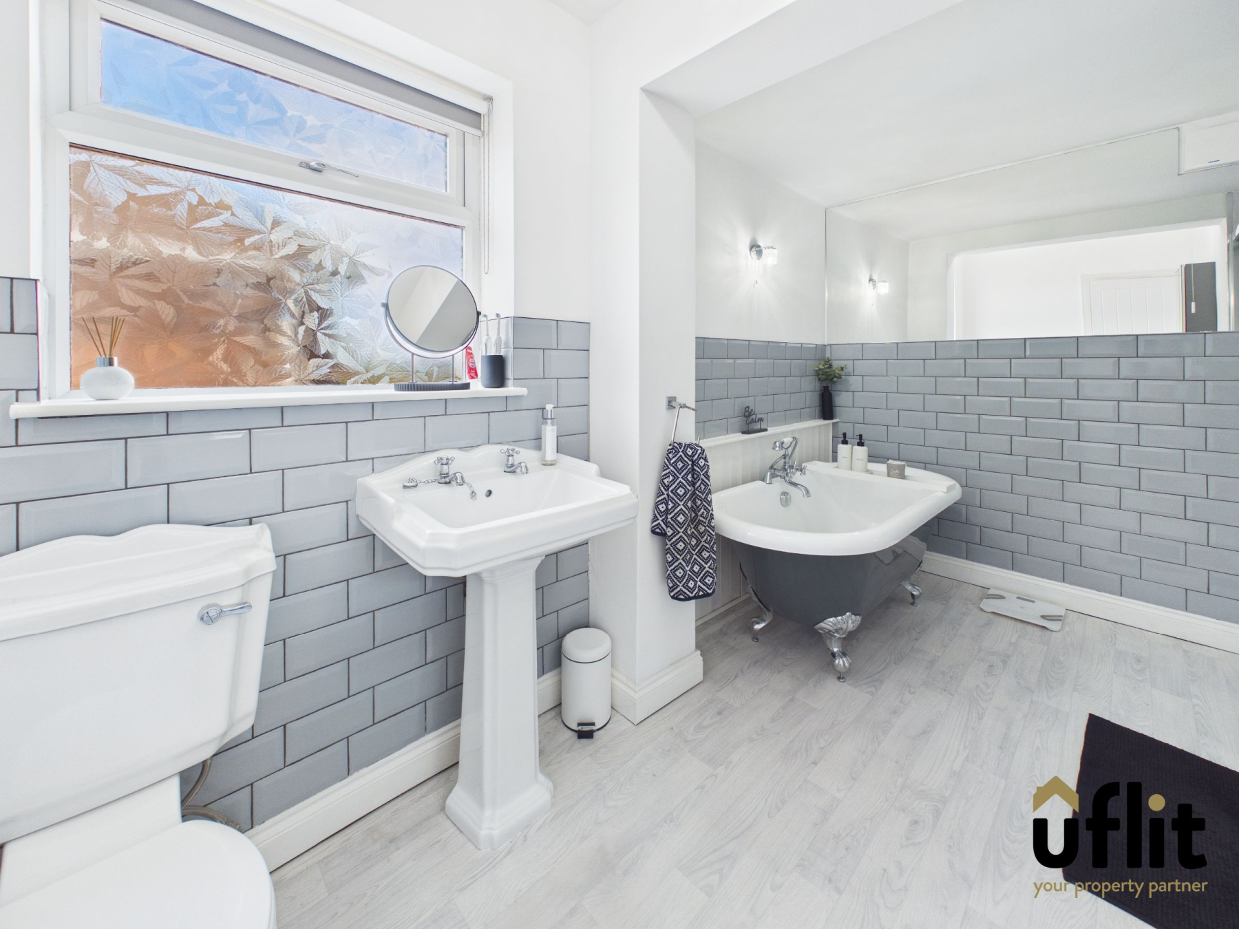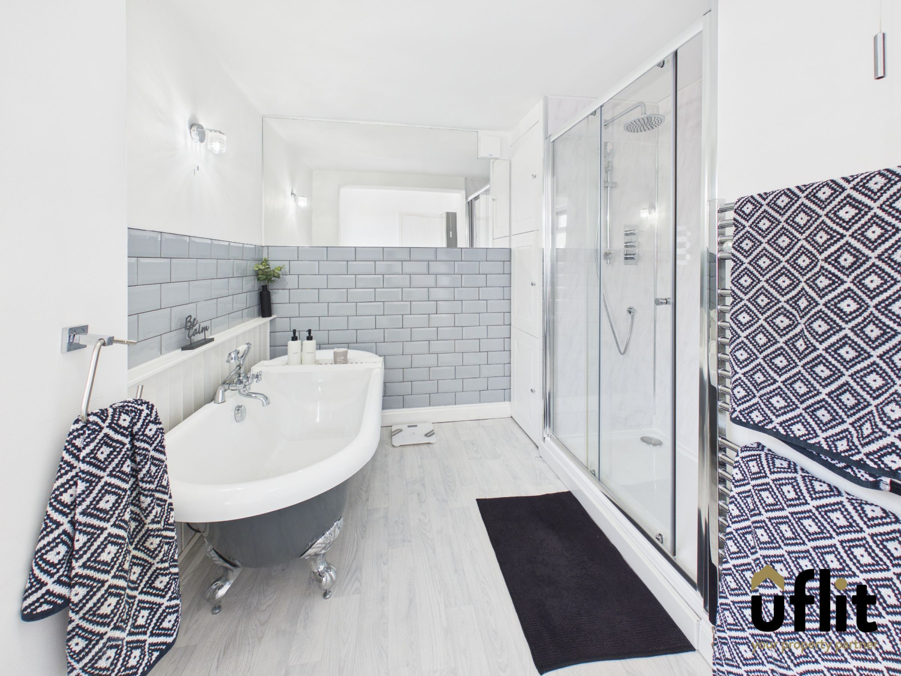 The family bathroom is finished with lino flooring and includes a radiator along with a towel radiator for additional comfort. The suite comprises a freestanding bath, a separate dual-headed shower with panelling, a wash basin and a low-level WC. The room is partially tiled and benefits from a side-facing window, allowing natural light and ventilation.