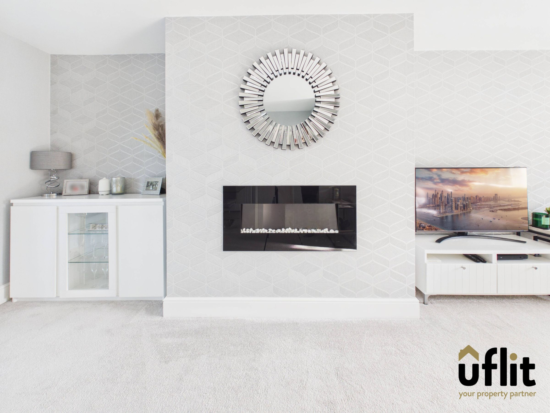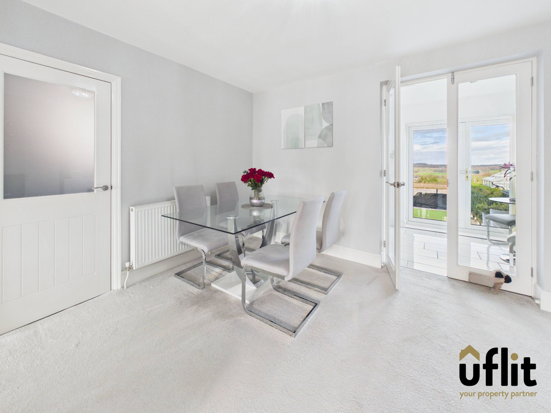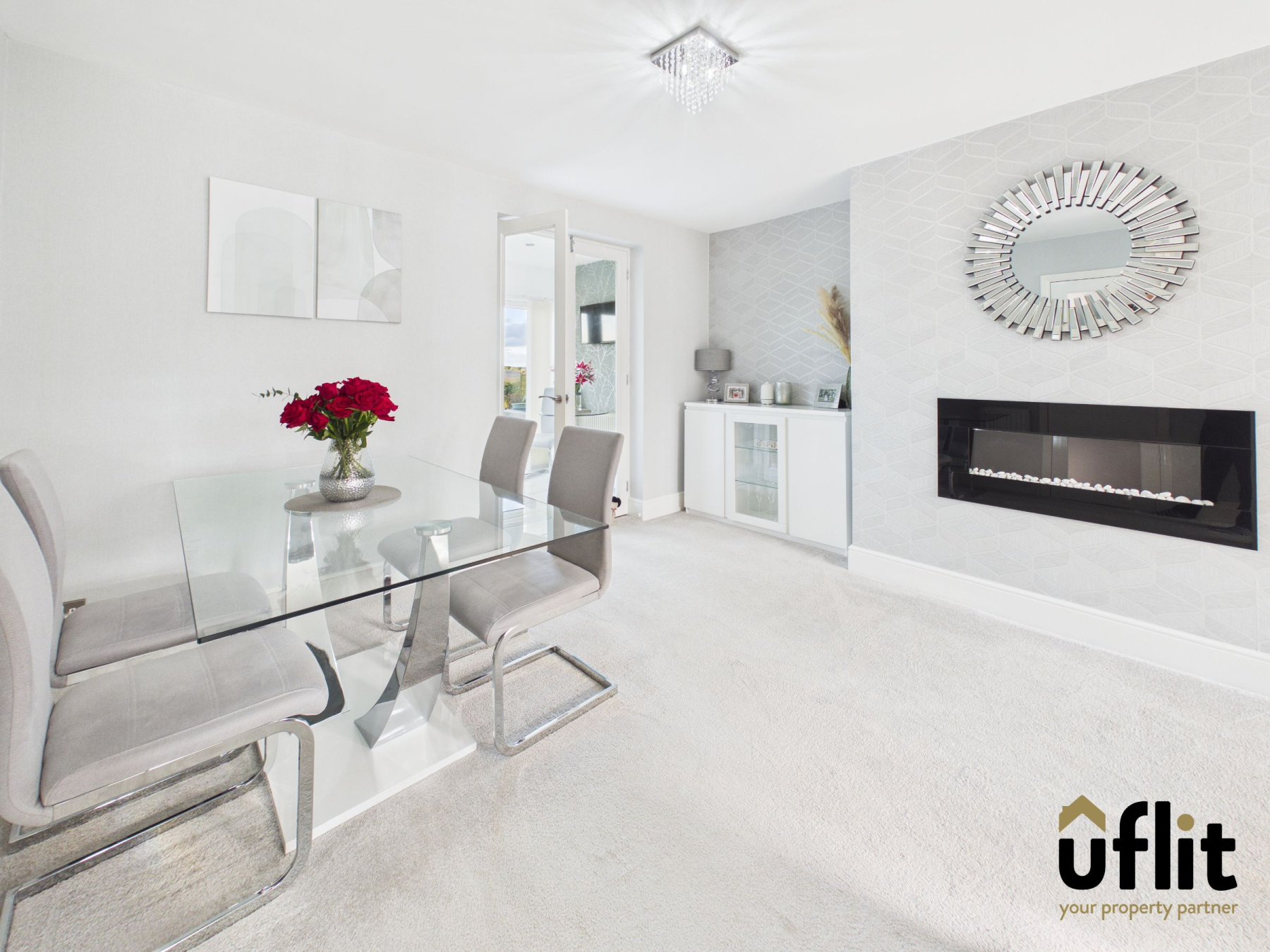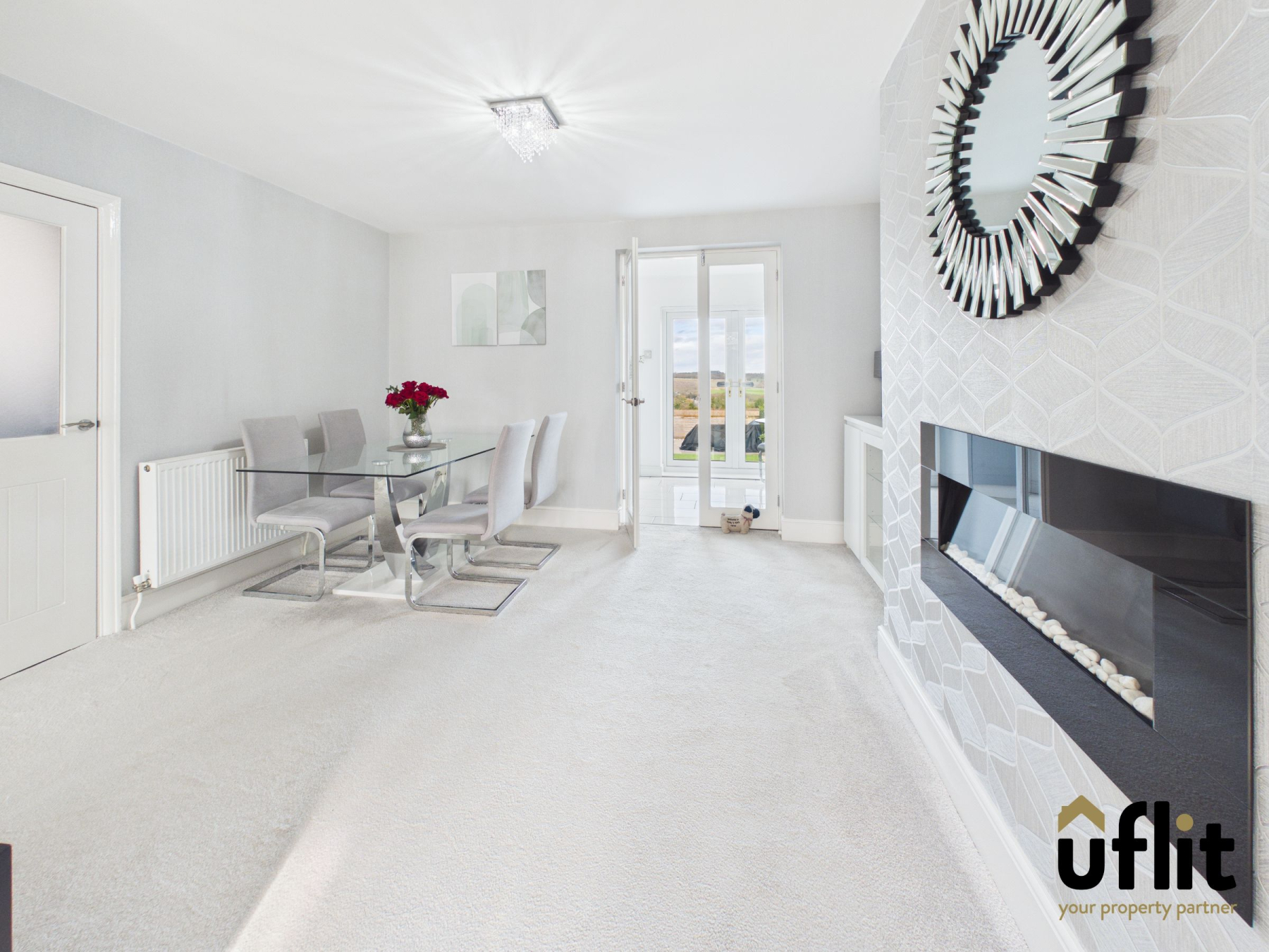 This spacious open-plan living and dining area is fitted with carpet, enhancing comfort underfoot. A bay window to the front elevation allows for plenty of natural light, while a radiator ensures the room remains cosy. An electric fire creates an attractive focal point within the lounge area. There is also a useful storage cupboard for added practicality. Double glass doors open into the kitchen/dining area, enhancing the sense of space and connectivity.