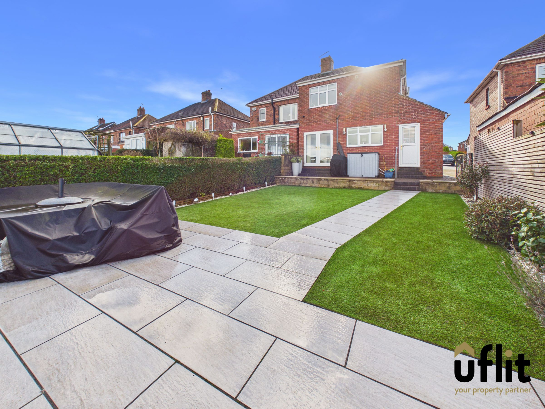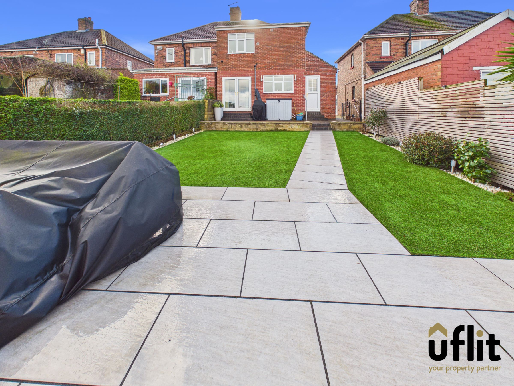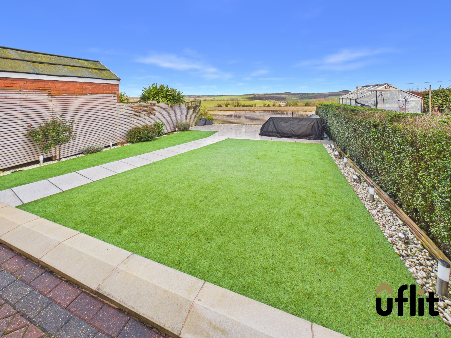 Externally, the rear garden has been landscaped to perfection. A block-paved seating area steps down to an artificial lawn, creating a low-maintenance outdoor space. Slate tiles form a stylish patio area and walkway, while decorative pebbled borders edge the garden. The space is fully enclosed, offering privacy and security and enjoys truly stunning views.