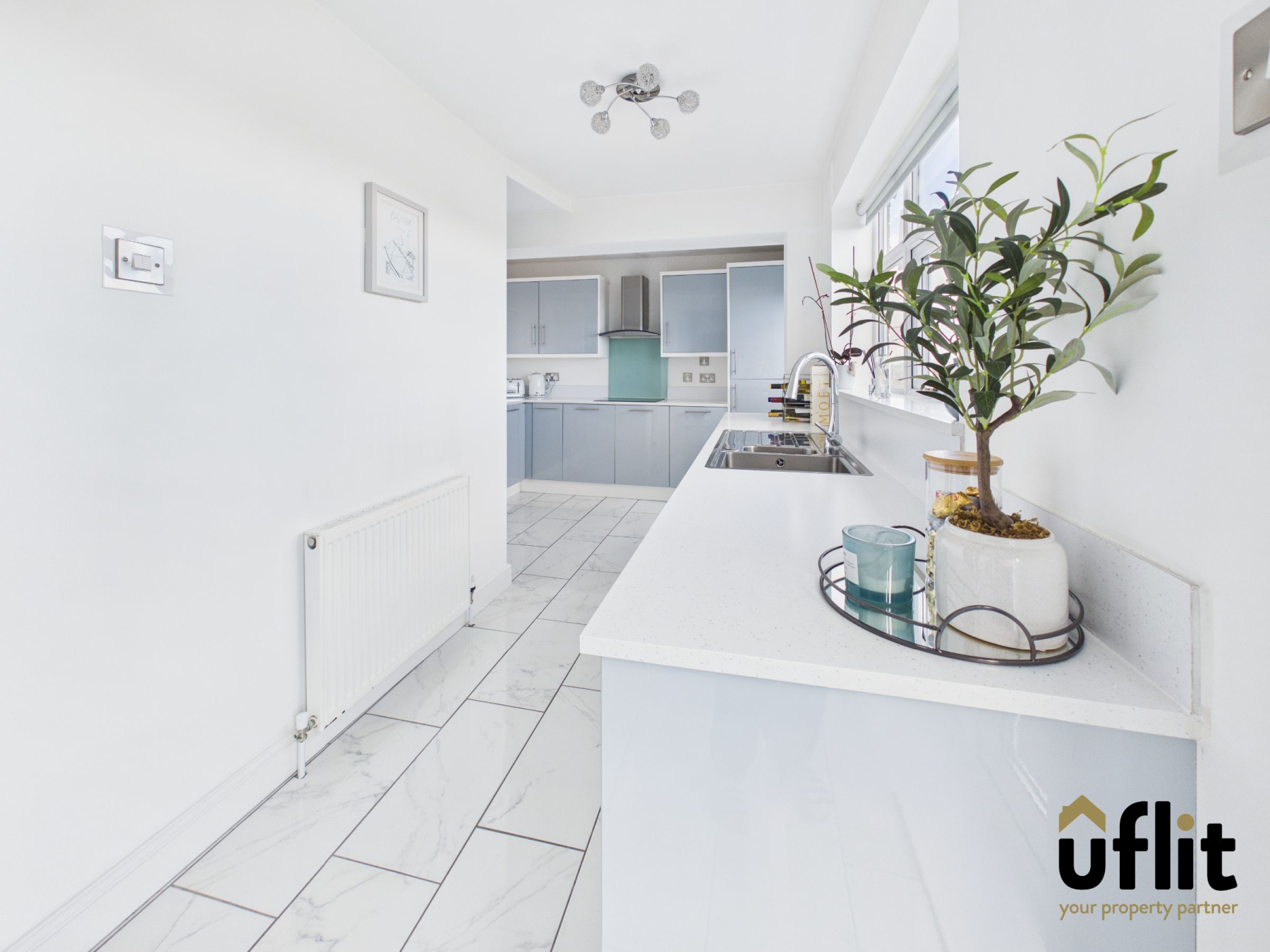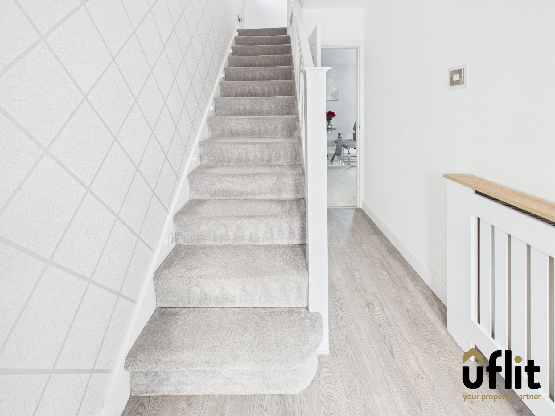 The hallway continues with wooden laminate flooring, offering durability and style. A central heating radiator provides warmth, and a door leads directly into the open-plan lounge/diner, creating a seamless flow into the main living space.
