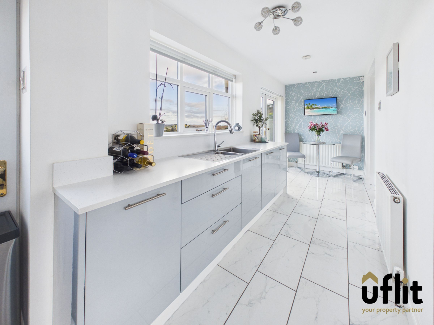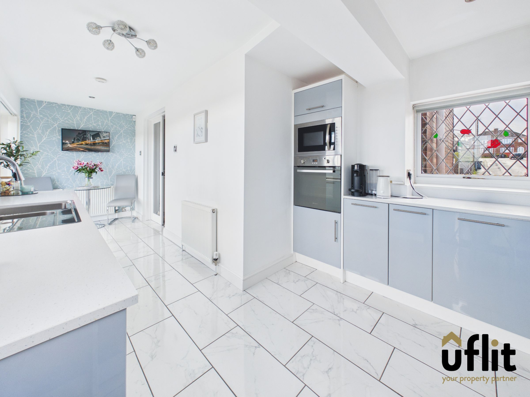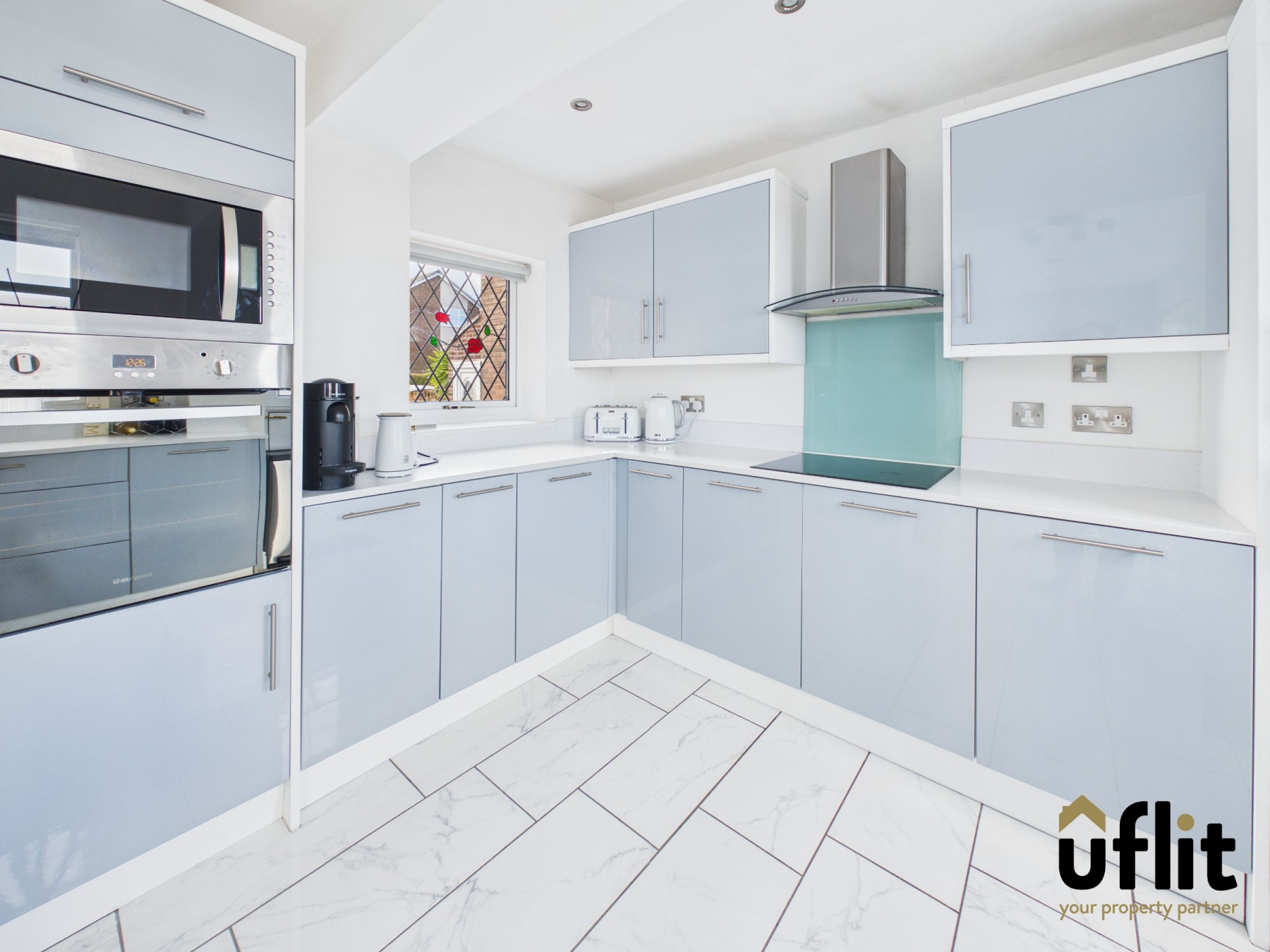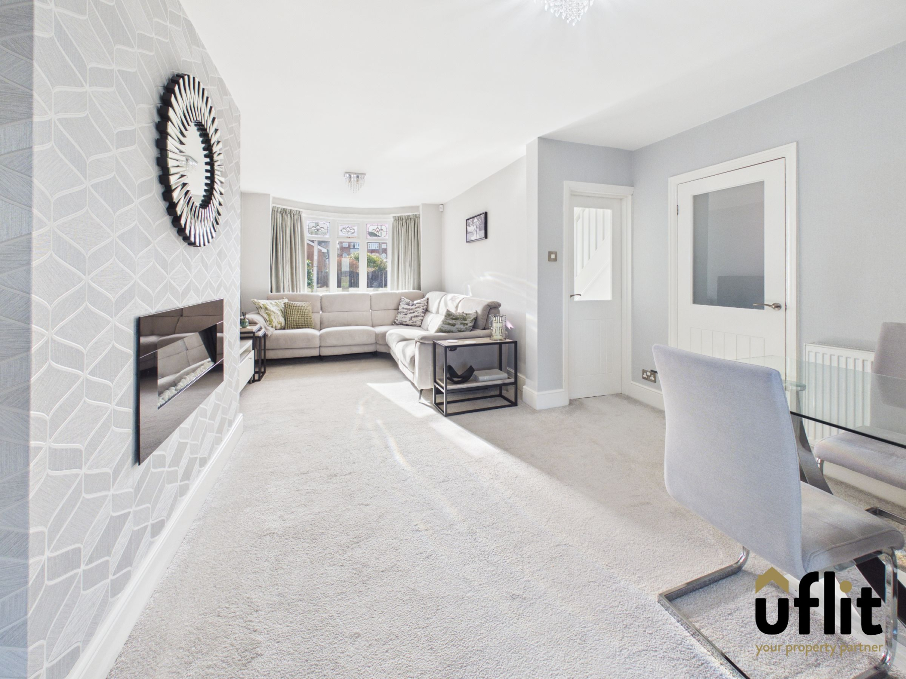 From the hallway you enter the open-plan lounge and dining area, a superbly proportioned space designed for both relaxation and entertaining. The lounge area is positioned to the front of the property and benefits from a beautiful bay window along with an electric fire that creates a focal point within the room. A useful storage cupboard adds practicality. The dining area sits seamlessly within this open-plan layout, offering ample space for family meals and social gatherings. Double glass doors lead through to the extended kitchen, enhancing the natural flow of the home.