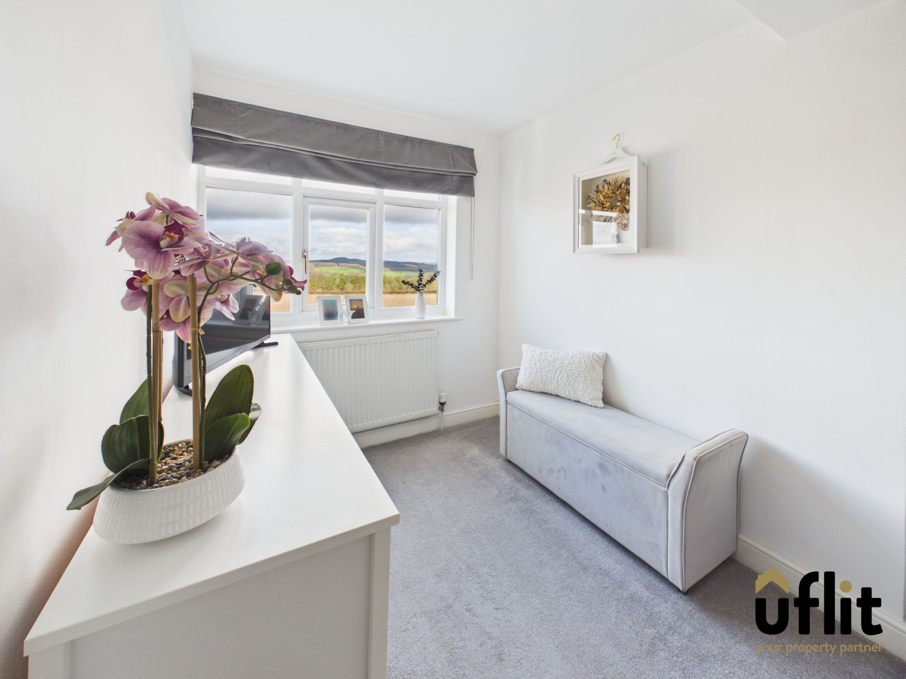 A well-proportioned double bedroom located to the rear of the property, featuring carpeted flooring and a radiator. A rear-facing window enjoys stunning views.