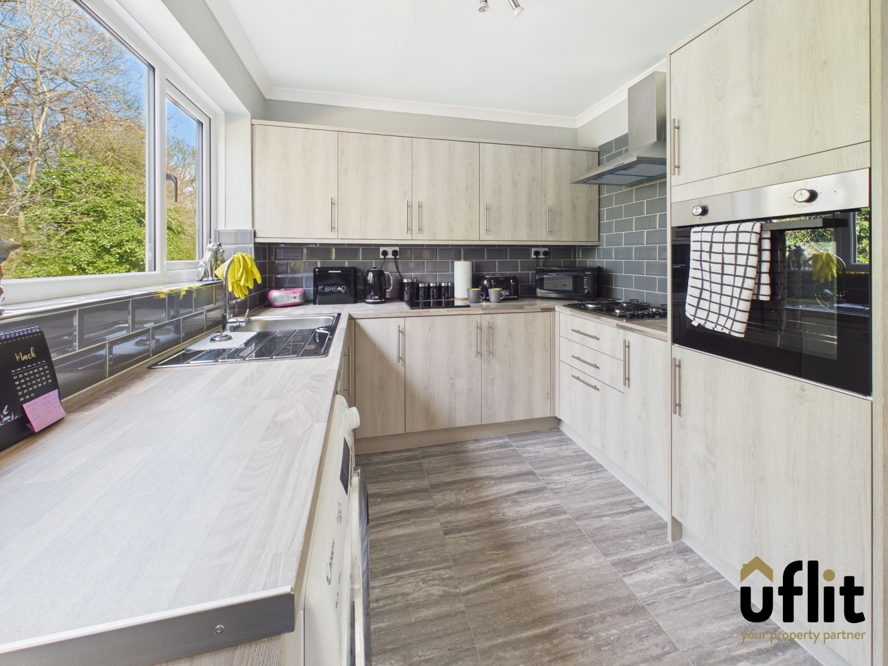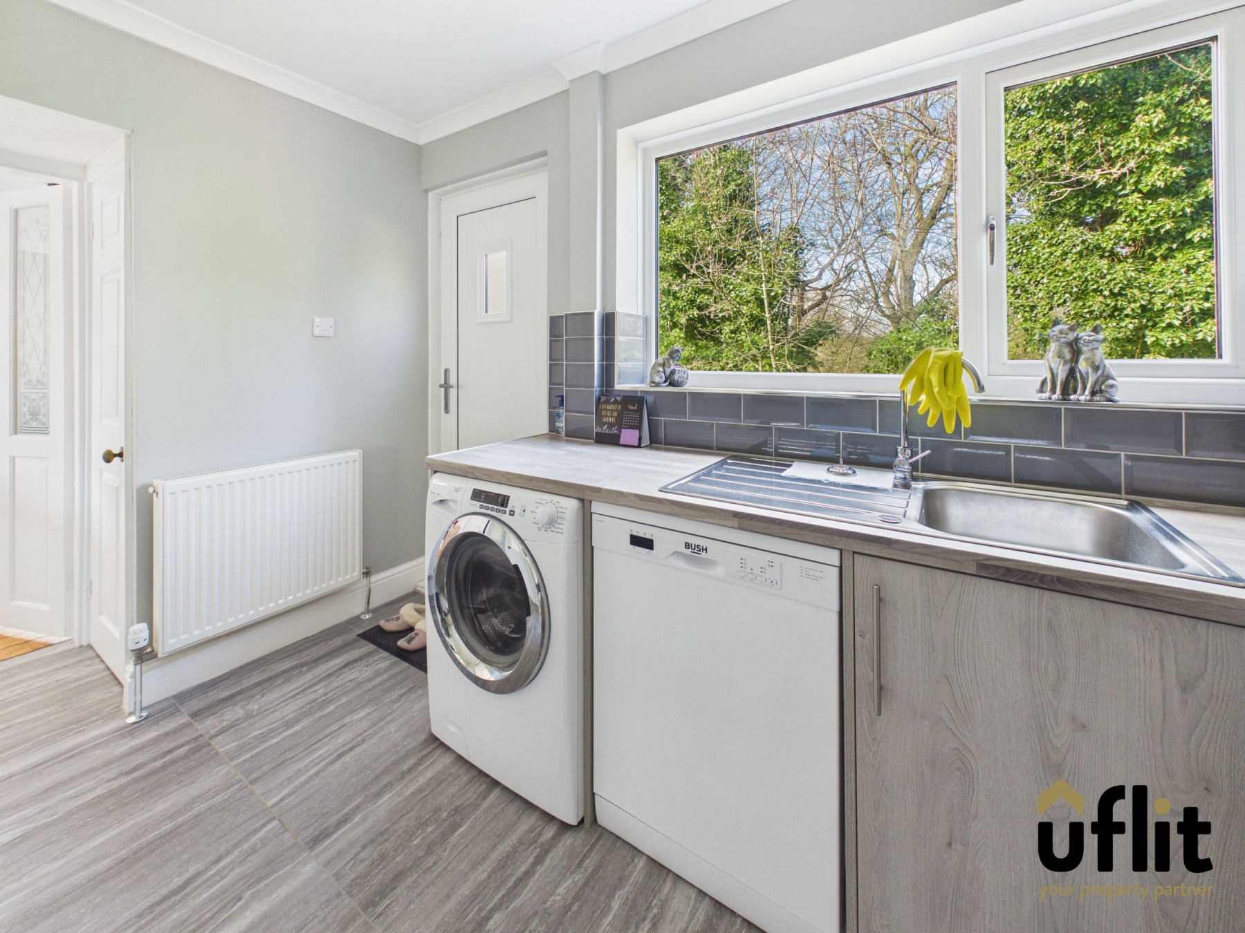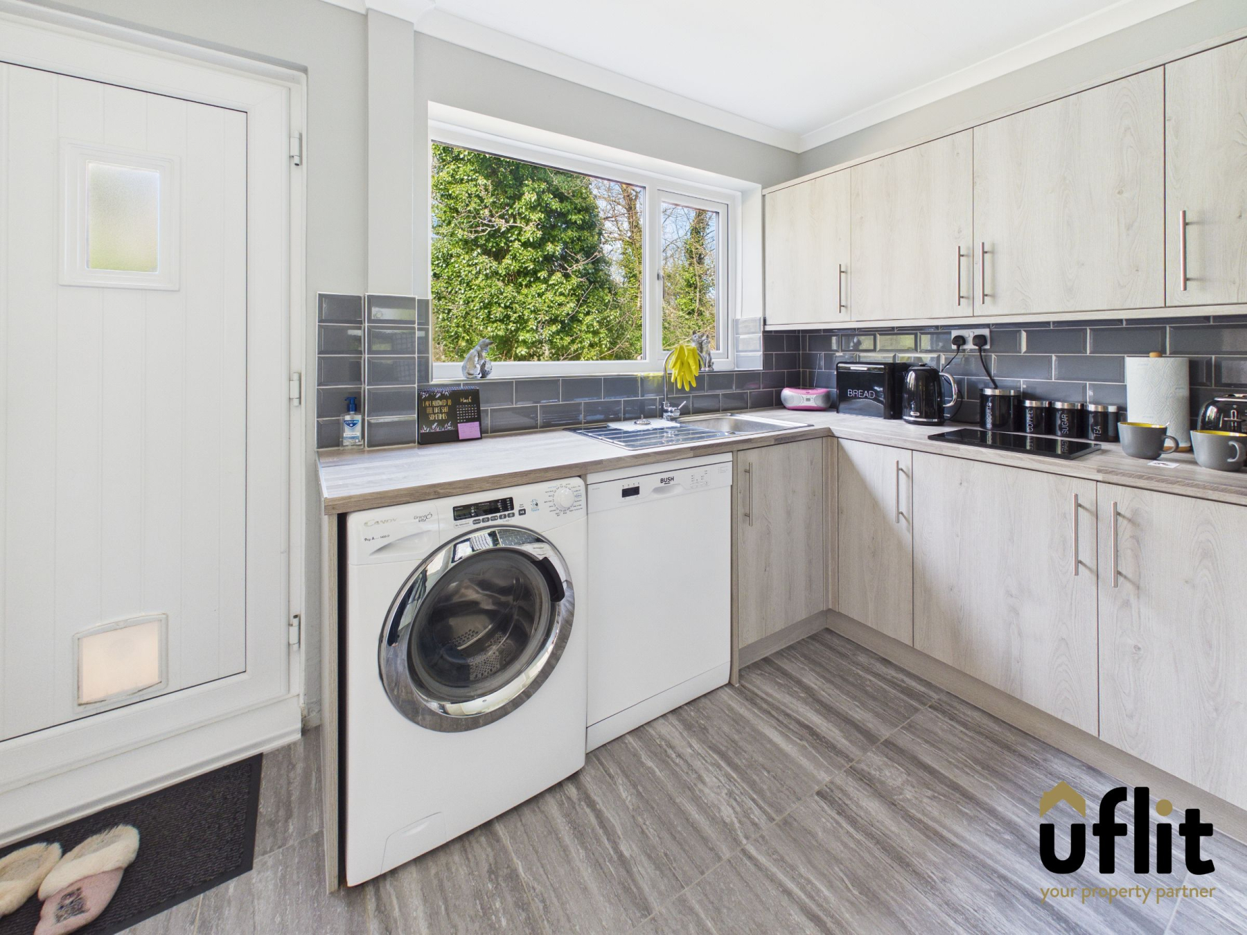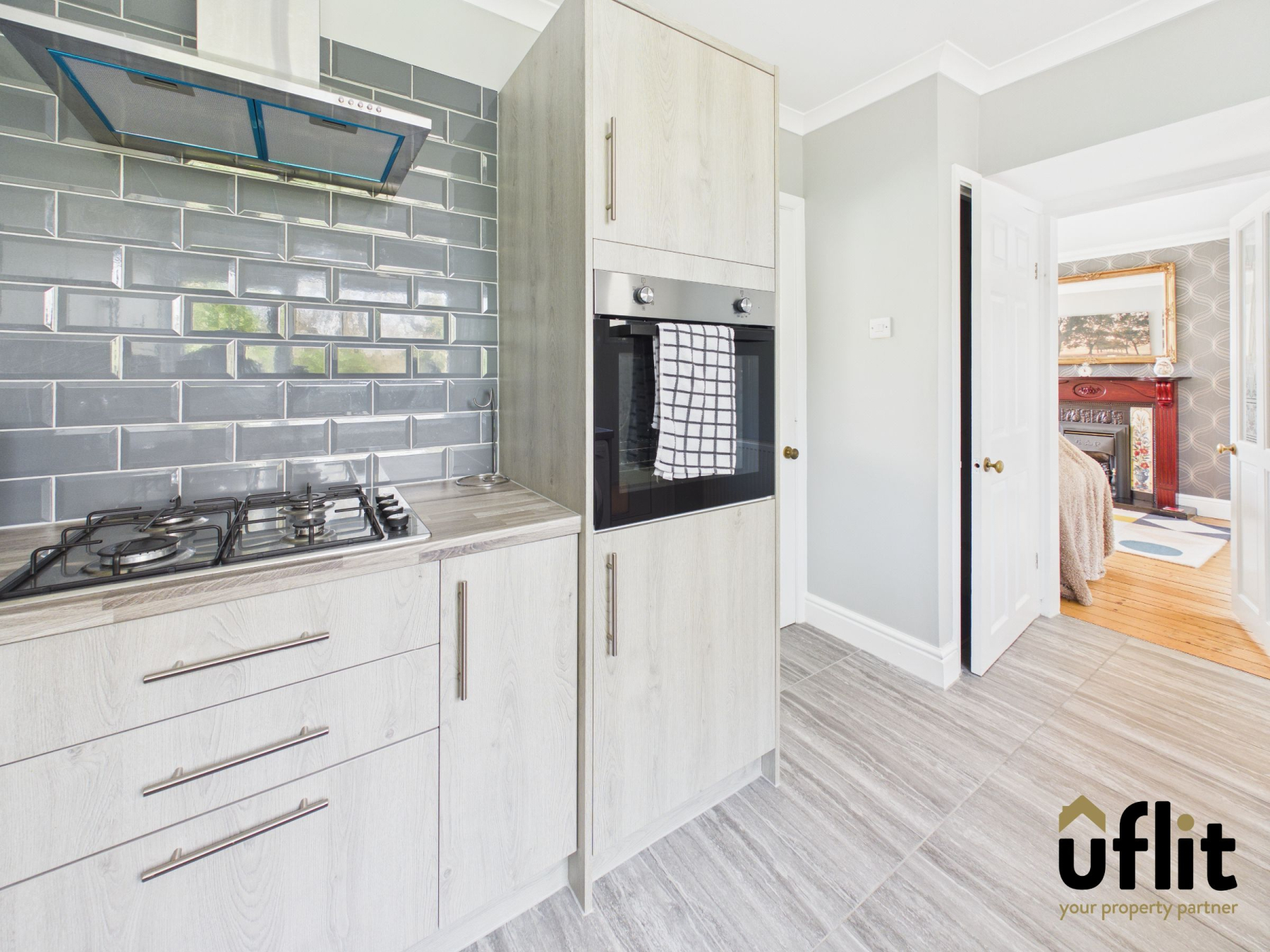 Accessed from the lounge, the kitchen is fitted with tiled flooring and partially tiled walls, offering both style and practicality. A window overlooks the rear garden and a door provides direct access outside. The kitchen is equipped with a gas hob, integrated electric oven and extractor fan, along with designated space for a washing machine and dishwasher. A useful storage cupboard and radiator complete the space.