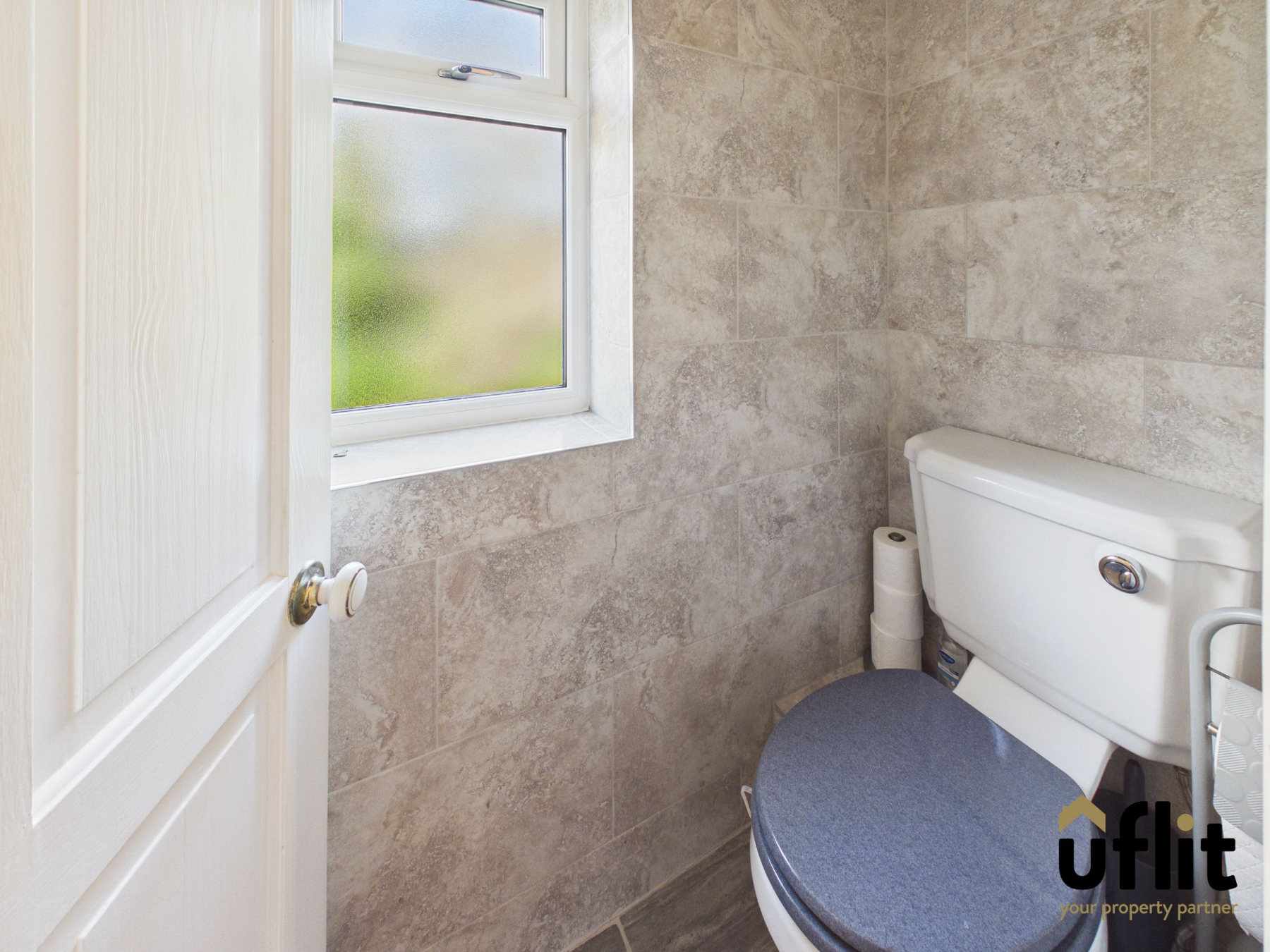 A separate WC featuring tiled flooring and walls, fitted with a low-level WC and a window to the rear.