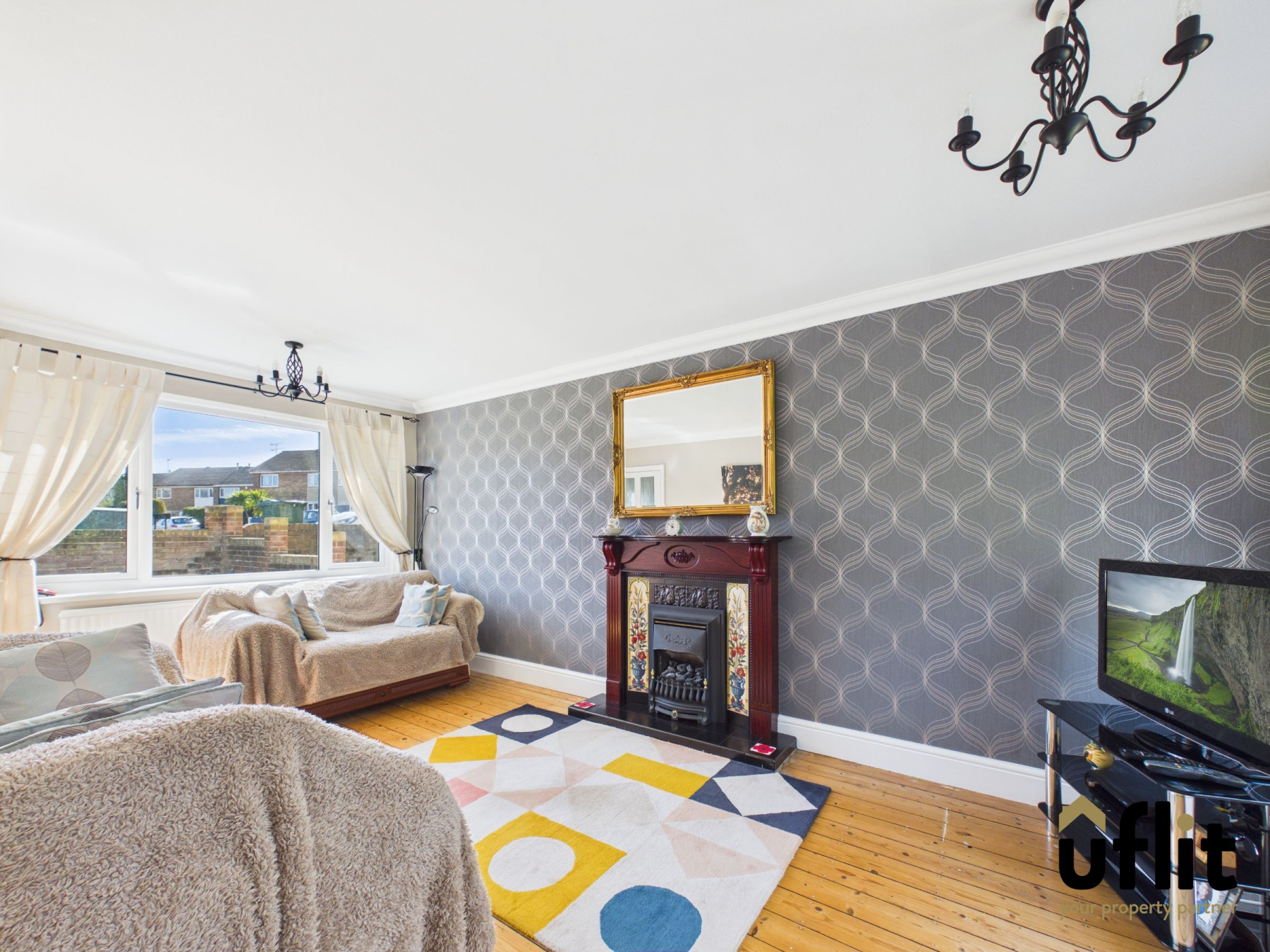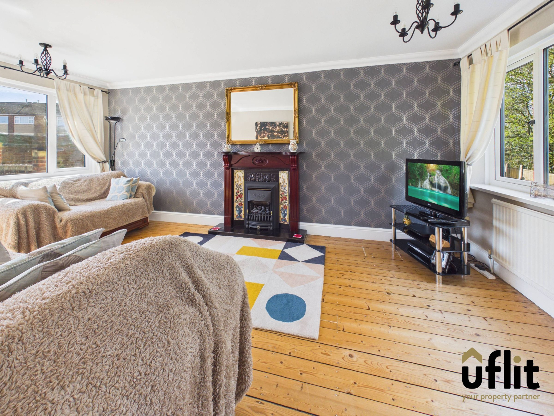 A spacious and light-filled living area accessed from the entrance hall, featuring wooden flooring and a radiator. Dual aspect windows to the front and rear allow natural light to flow through the space, while a gas fire with surround creates a central focal point, perfect for relaxing.