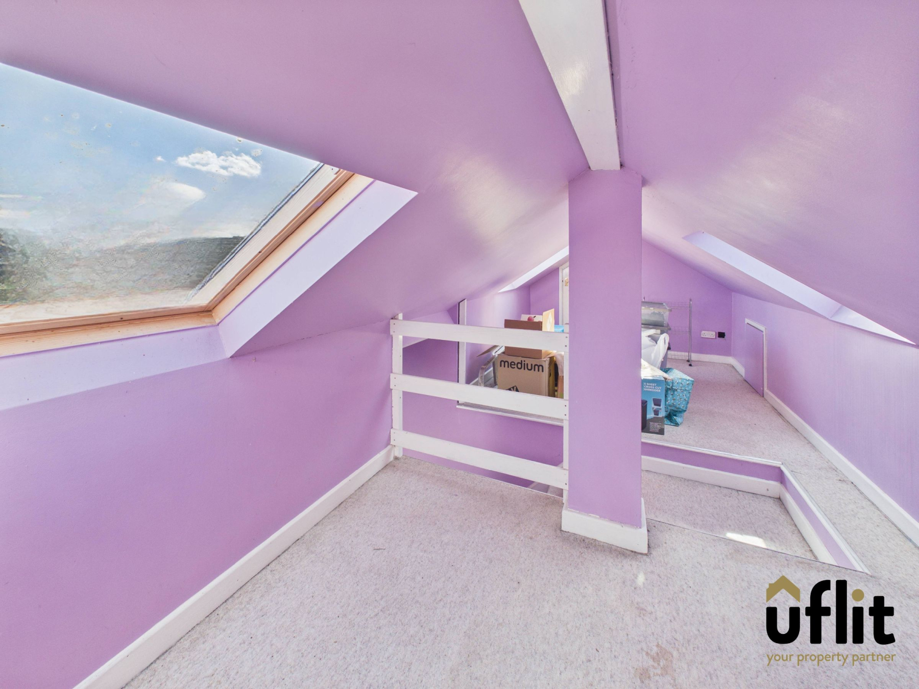 The loft space itself is fully boarded and features two Velux-style windows, creating a bright and functional additional area perfect for storage or flexible use. The bathroom is fitted with a bath and overhead shower along with a wash basin, while a separate WC adds further convenience for family living.