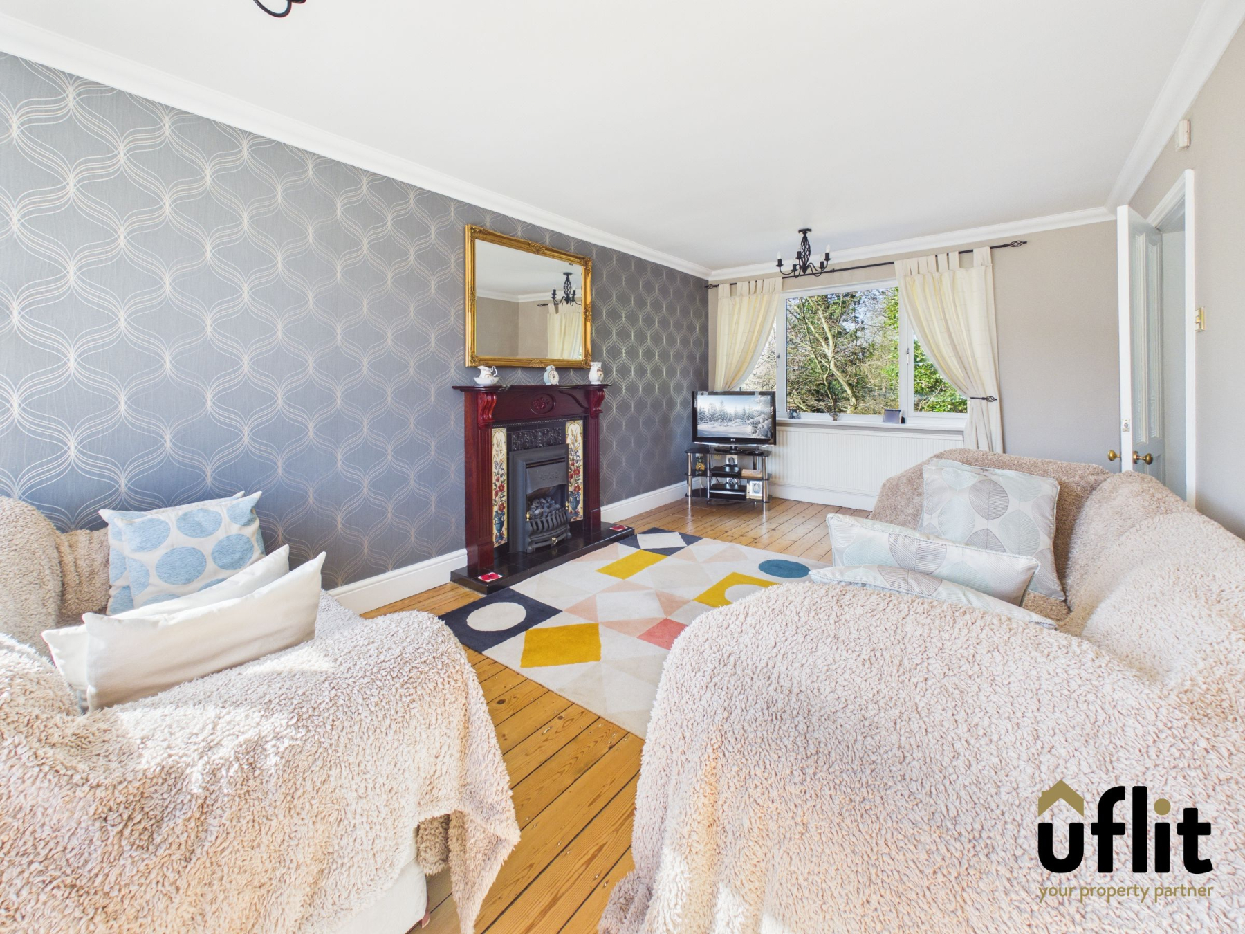 Approached via a neat front lawn and pathway leading to the entrance, you are welcomed into the home through the front door into a central entrance hall which provides access to the main living areas and stairs rising to the first floor. The lounge is a bright and airy space featuring windows to both the front and rear, allowing natural light to flood through, with a focal point fireplace creating a cosy yet open living environment. From here, the layout flows effortlessly into the kitchen, which is well-equipped with ample worktop space, integrated cooking appliances and designated areas for additional appliances, along with a useful storage cupboard and direct access to the rear garden.