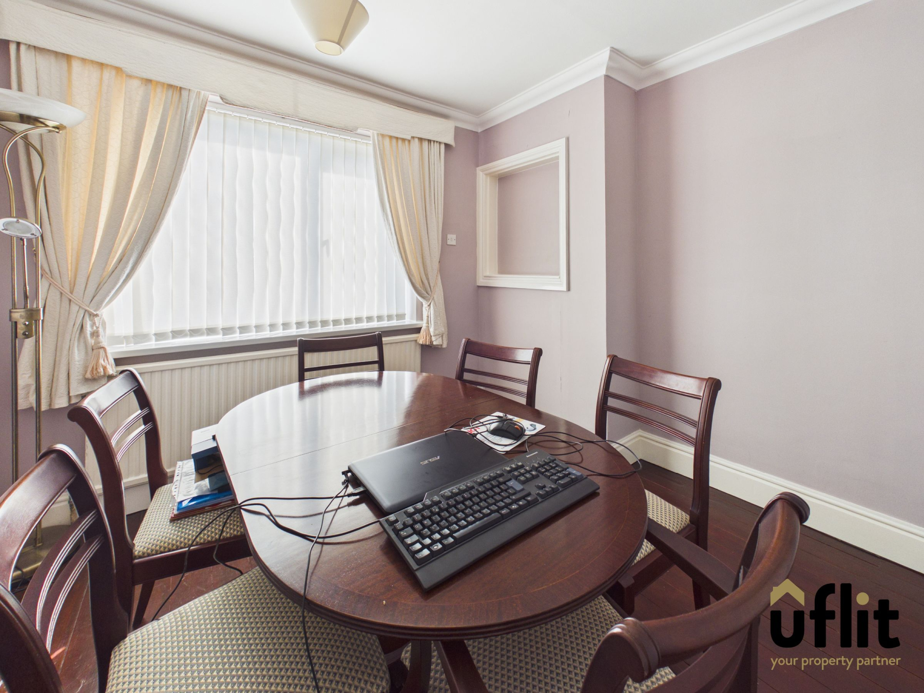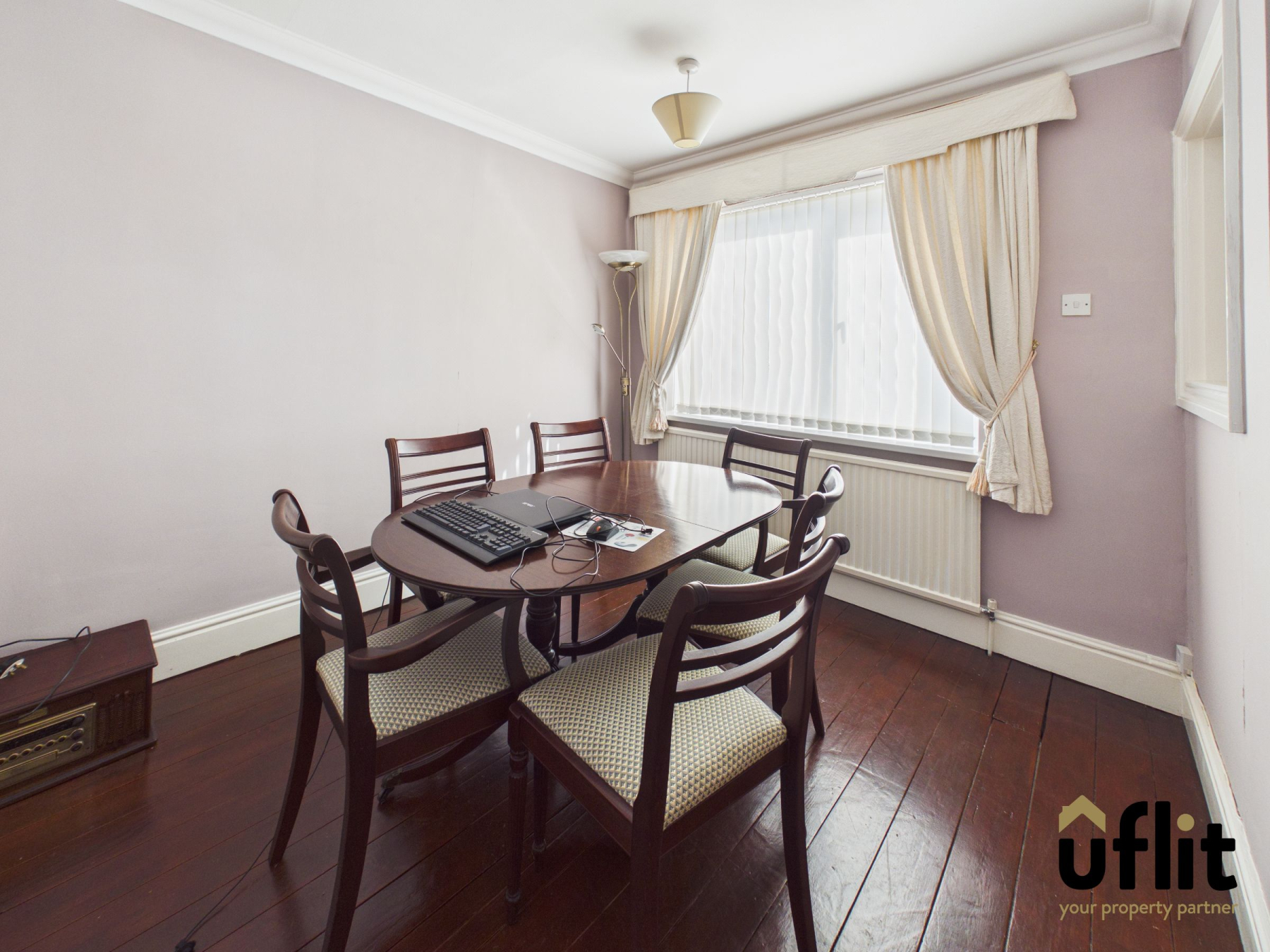 Leading from the kitchen, the dining room is positioned to the front of the property and features wooden flooring and a radiator. A window to the front elevation brings in natural light, creating an ideal space for family dining or entertaining.