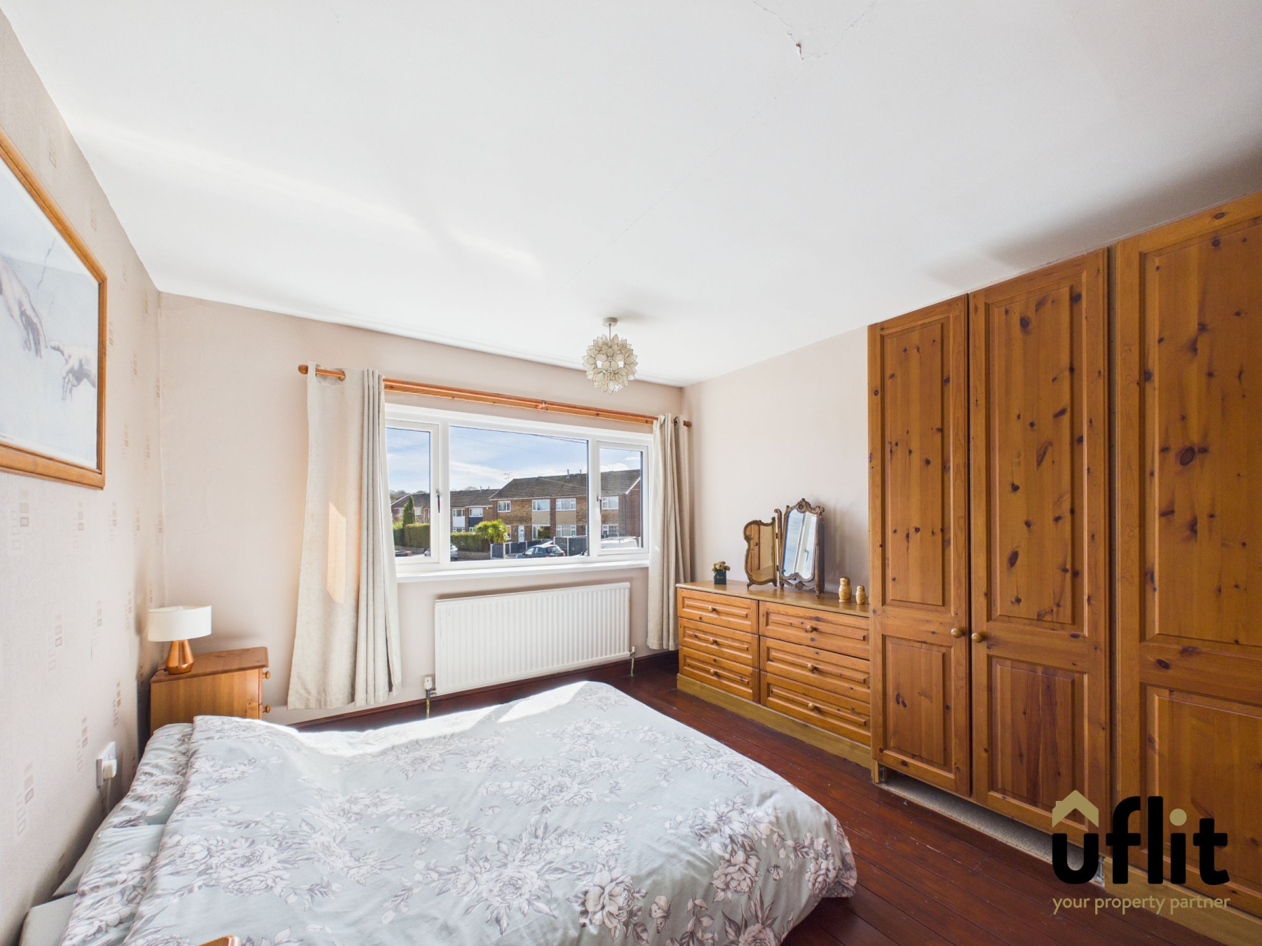 A generous double bedroom located to the front of the property, finished with wooden flooring and a radiator, with a window allowing plenty of natural light.
