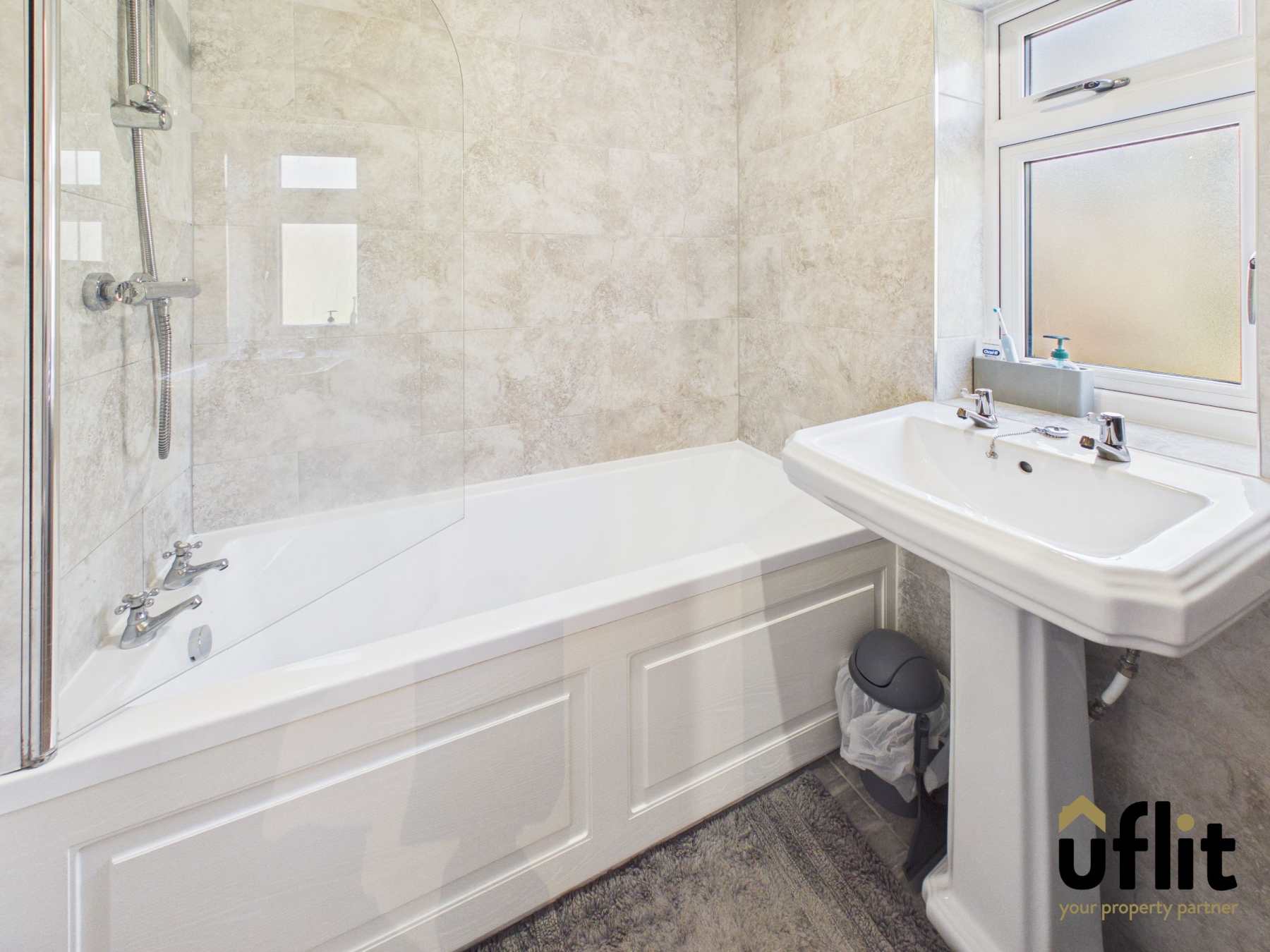 The bathroom is fitted with tiled flooring and fully tiled walls, comprising a bath with overhead shower and wash basin. A towel radiator adds comfort and a window to the rear provides ventilation and natural light.