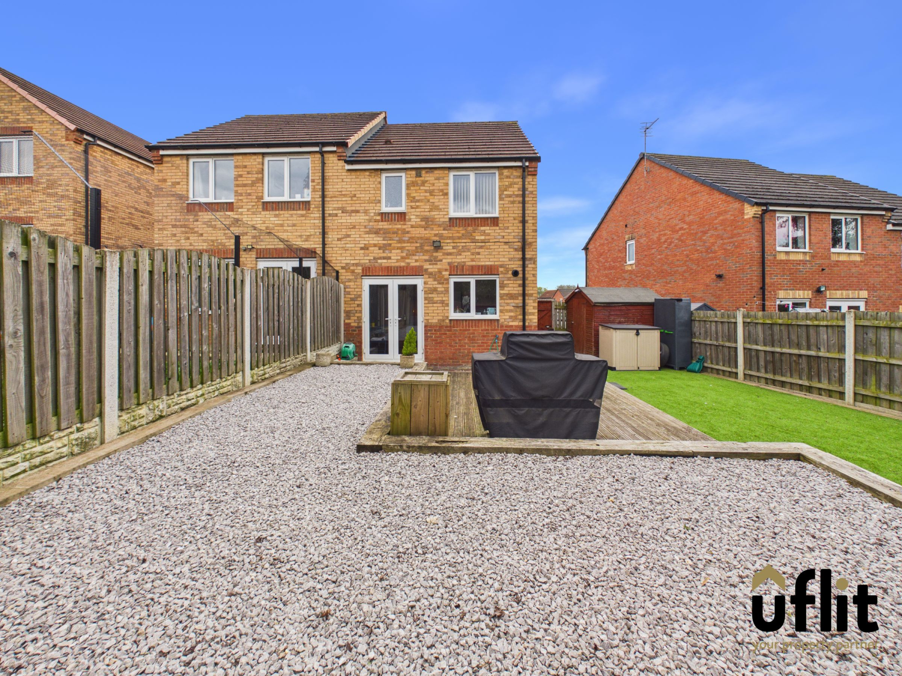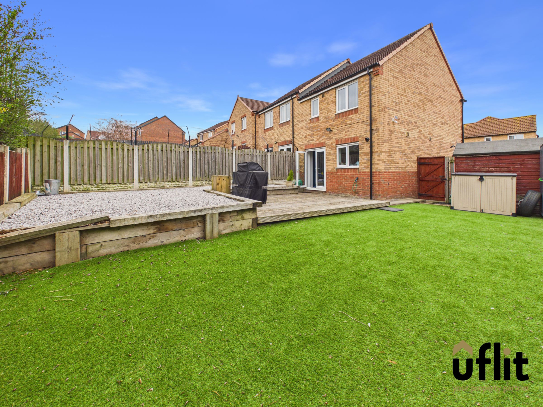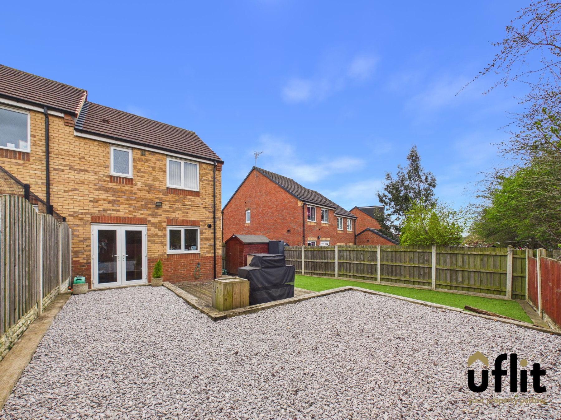The rear garden is accessed via the French doors from the kitchen/diner or through a side gate, offering a fully enclosed and low maintenance outdoor space. A patio area leads onto decking, enhanced by a pebbled border and stepping onto an artificial lawn, creating a versatile area for relaxing or entertaining. A shed provides additional storage.