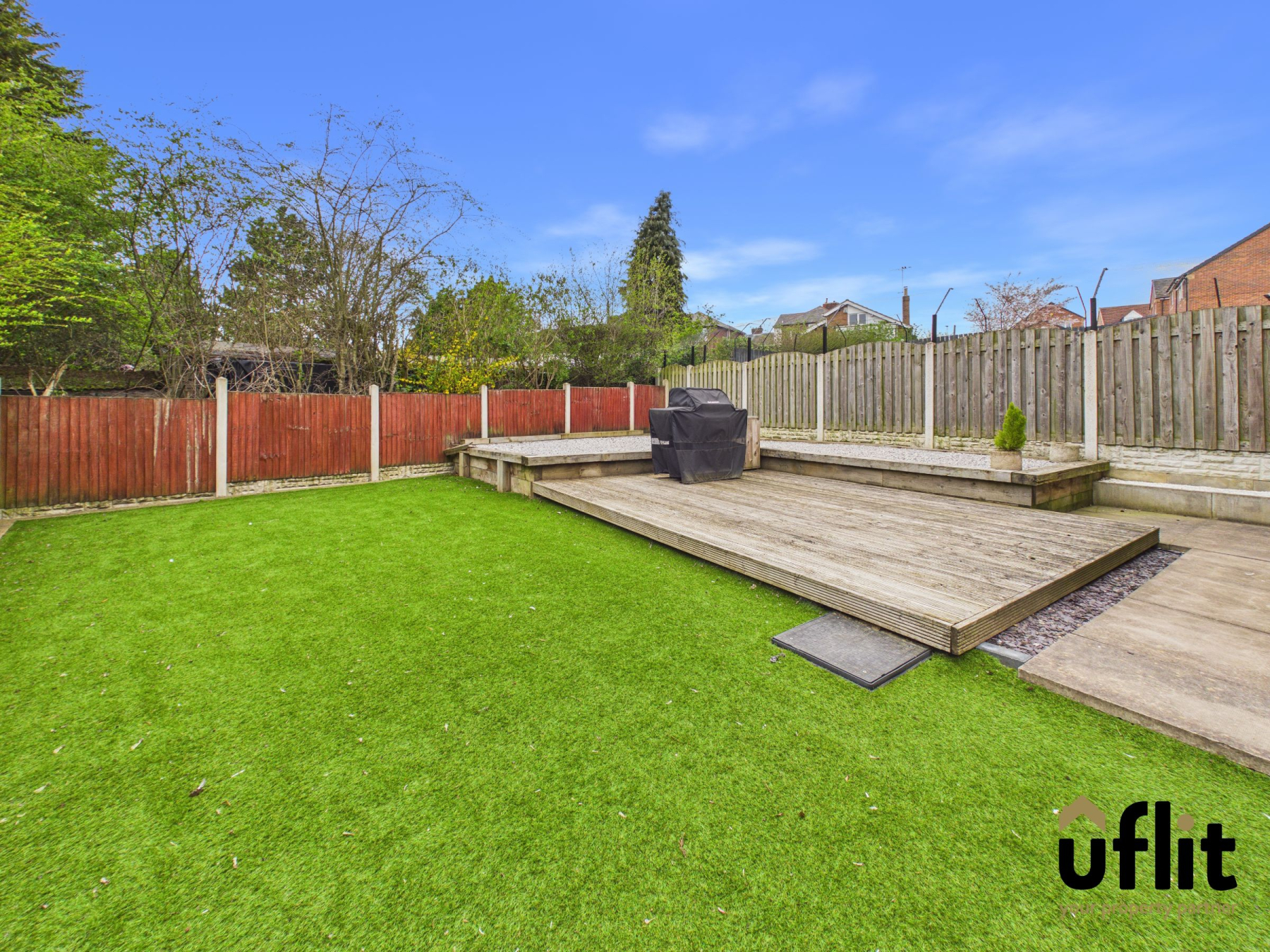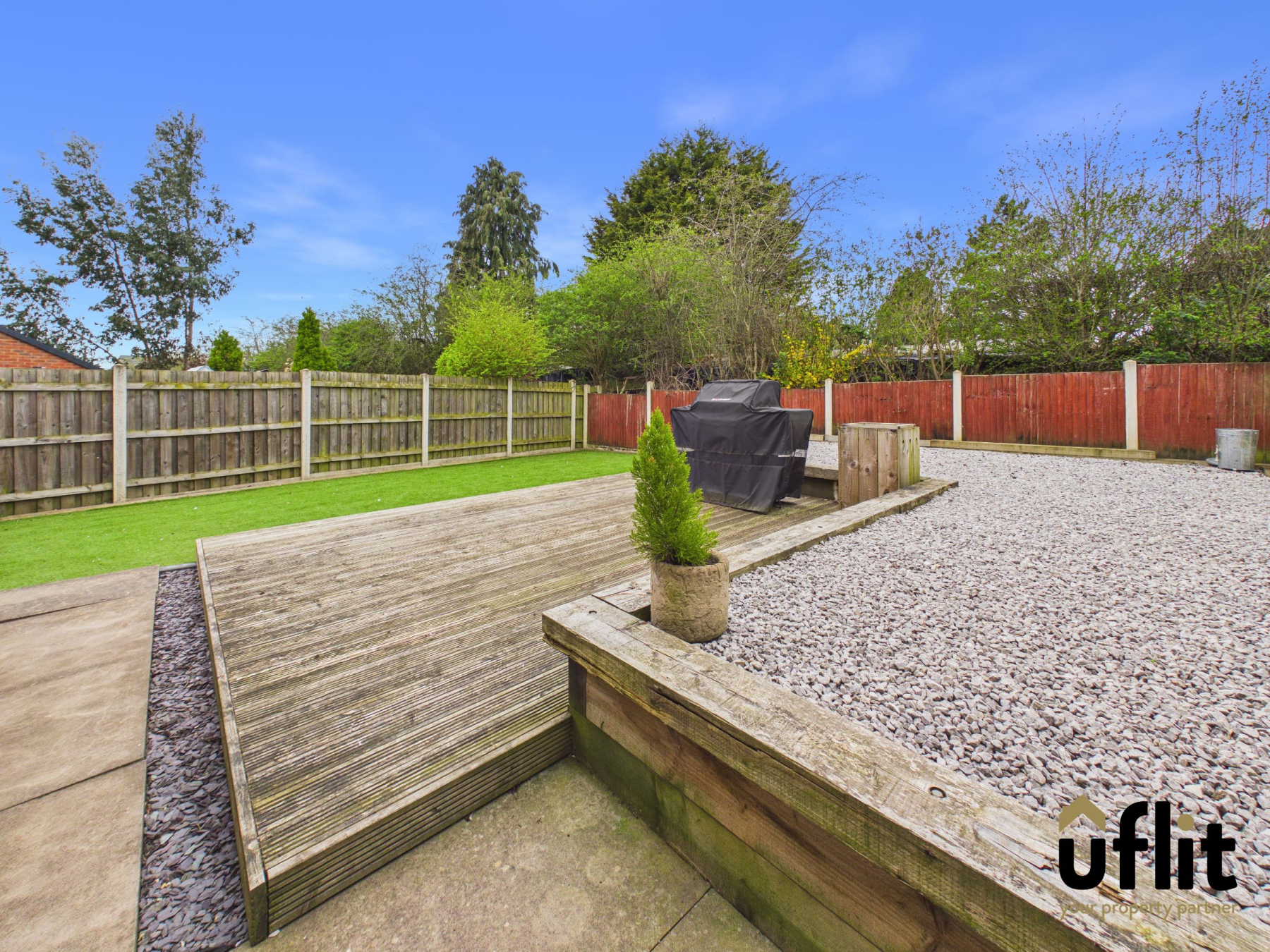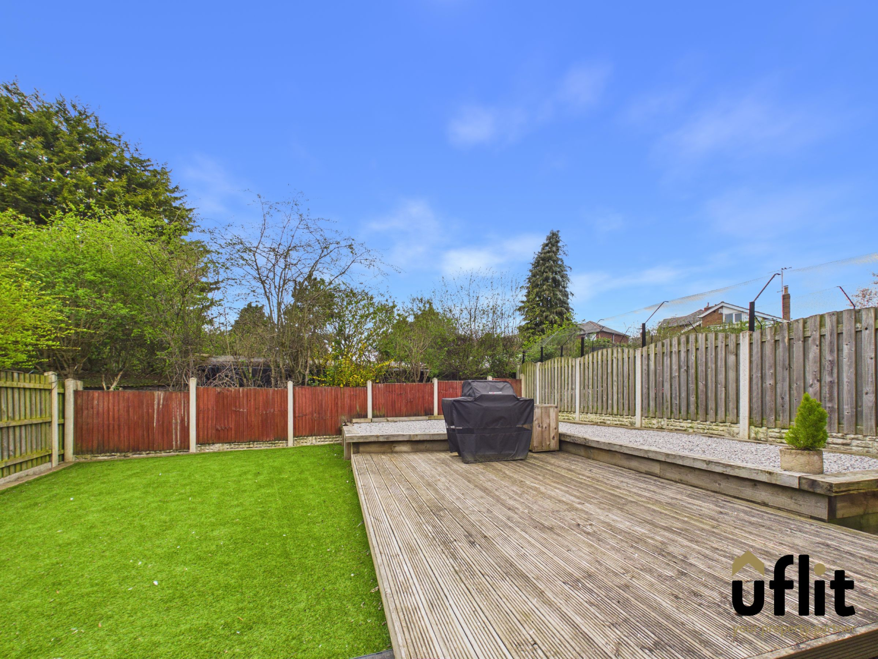 The rear garden is accessed via the French doors from the kitchen/diner or through a side gate, offering a fully enclosed and low maintenance outdoor space. A patio area leads onto decking, enhanced by a pebbled border and stepping onto an artificial lawn, creating a versatile area for relaxing or entertaining. A shed provides additional storage.
