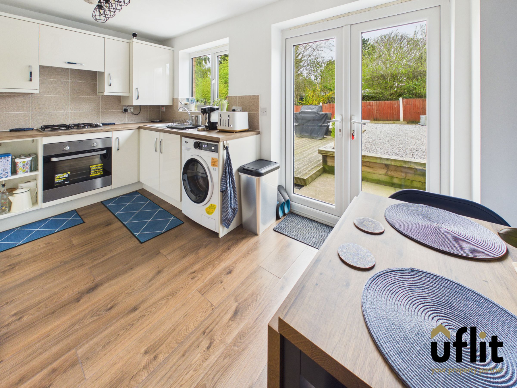 A functional and well laid out kitchen/diner fitted with wooden laminate flooring and a radiator, offering ample space for dining. The kitchen includes an integrated gas hob and electric oven, with additional space for a fridge freezer and washing machine. A rear facing window and French doors open out onto the garden, enhancing the sense of space and light, with partially tiled walls adding a practical finish.