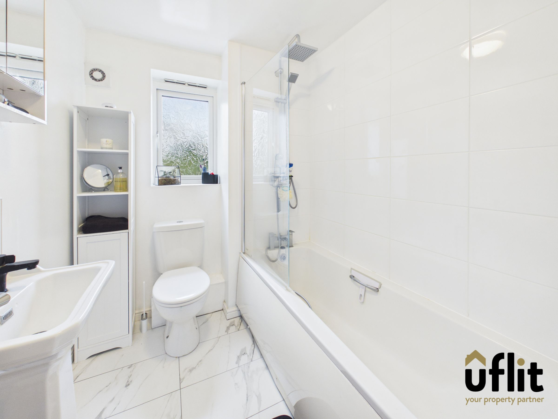 The bathroom is fitted with tiled flooring and a radiator, comprising a bath with dual overhead shower, wash basin and WC. A rear facing window provides natural light and ventilation, with partially tiled walls completing the space.