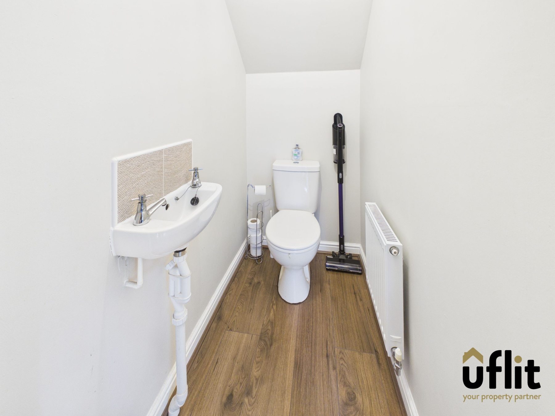 Conveniently located, the downstairs WC is fitted with wooden laminate flooring and a radiator, comprising a wash basin and low level WC , with partially tiled walls for ease of maintenance.
