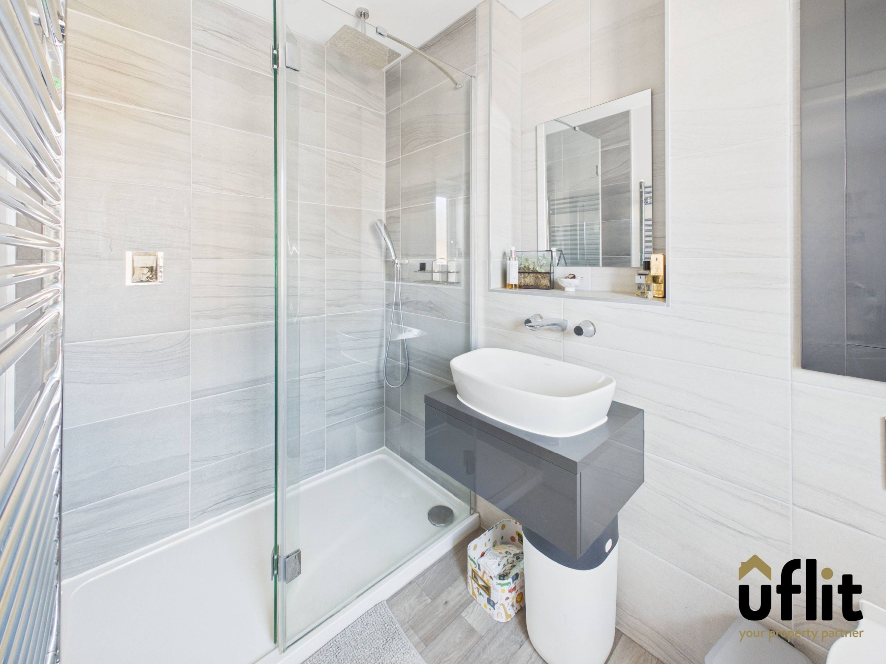 The ensuite is finished to a modern standard with LVT flooring and fully tiled walls. It comprises a floating wash basin, low level WC and a dual head shower. Additional features include a towel radiator, spotlights and a rear facing window.
