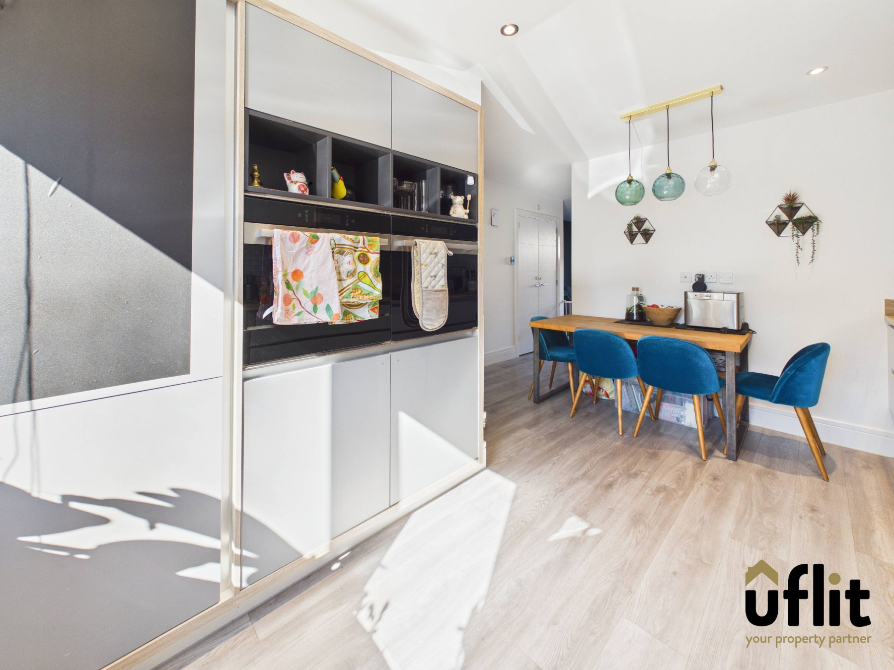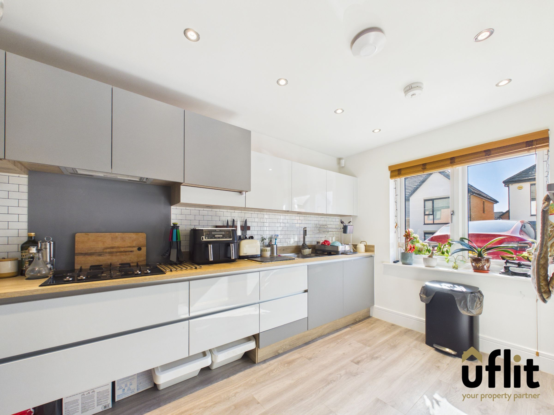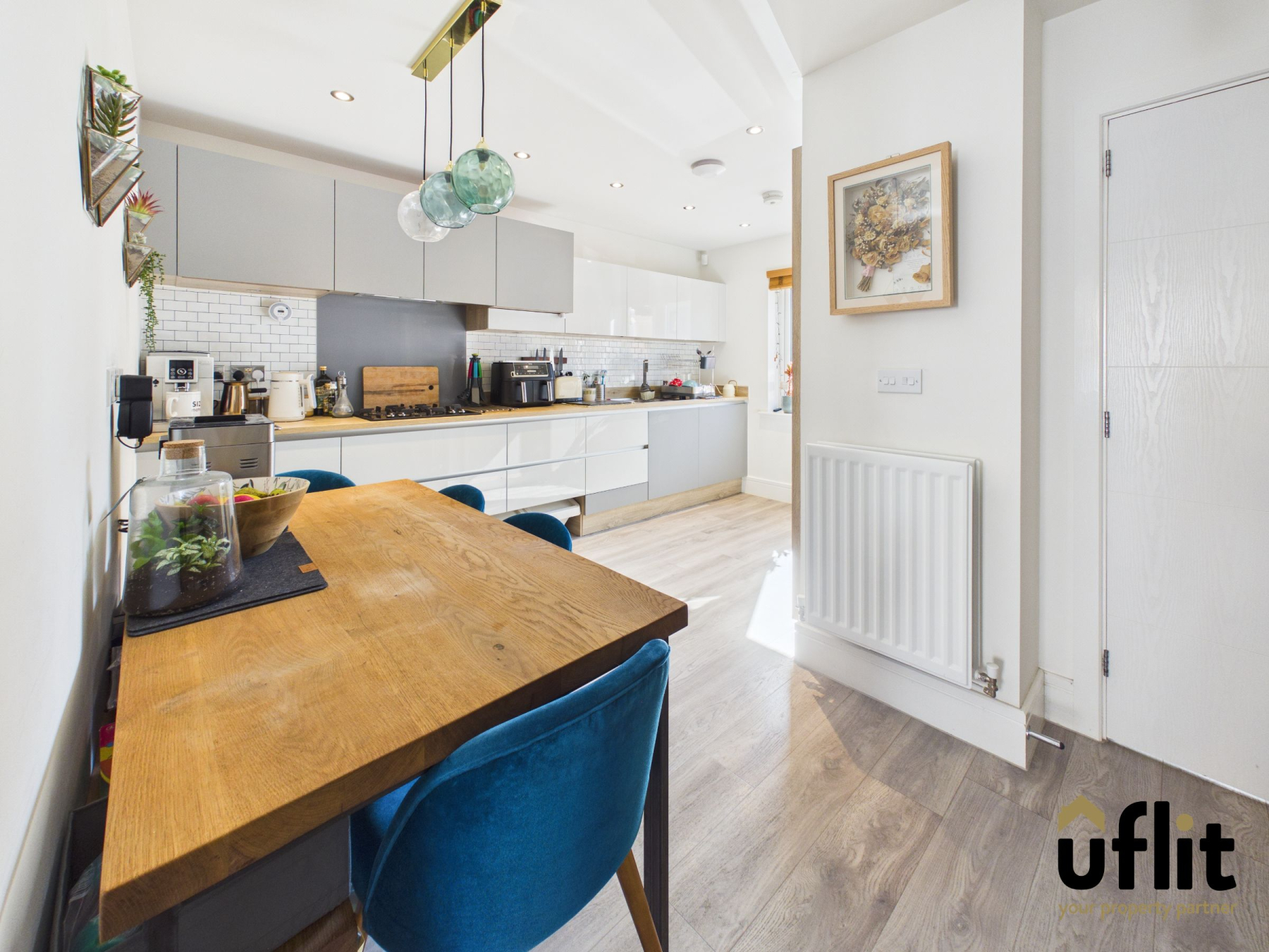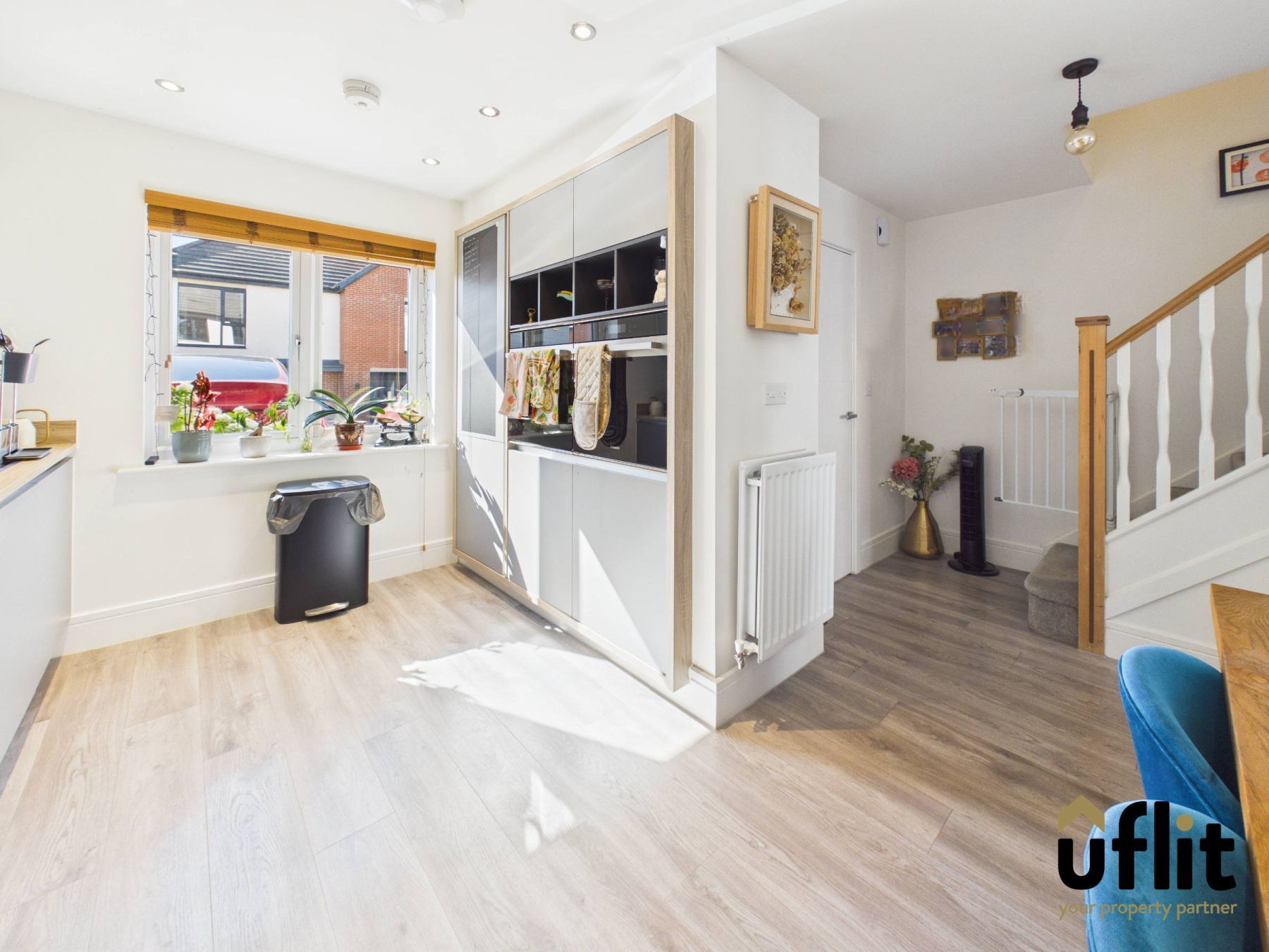 The stylish kitchen diner is positioned with the kitchen area to the front of the property and features LVT flooring, partial wall tiling and a radiator. It is fitted with a range of integrated appliances including an oven, microwave, gas hob, dishwasher, fridge and freezer. Spotlights and plinth lighting enhance the contemporary finish, while ample space is provided for dining, making it the true heart of the home.