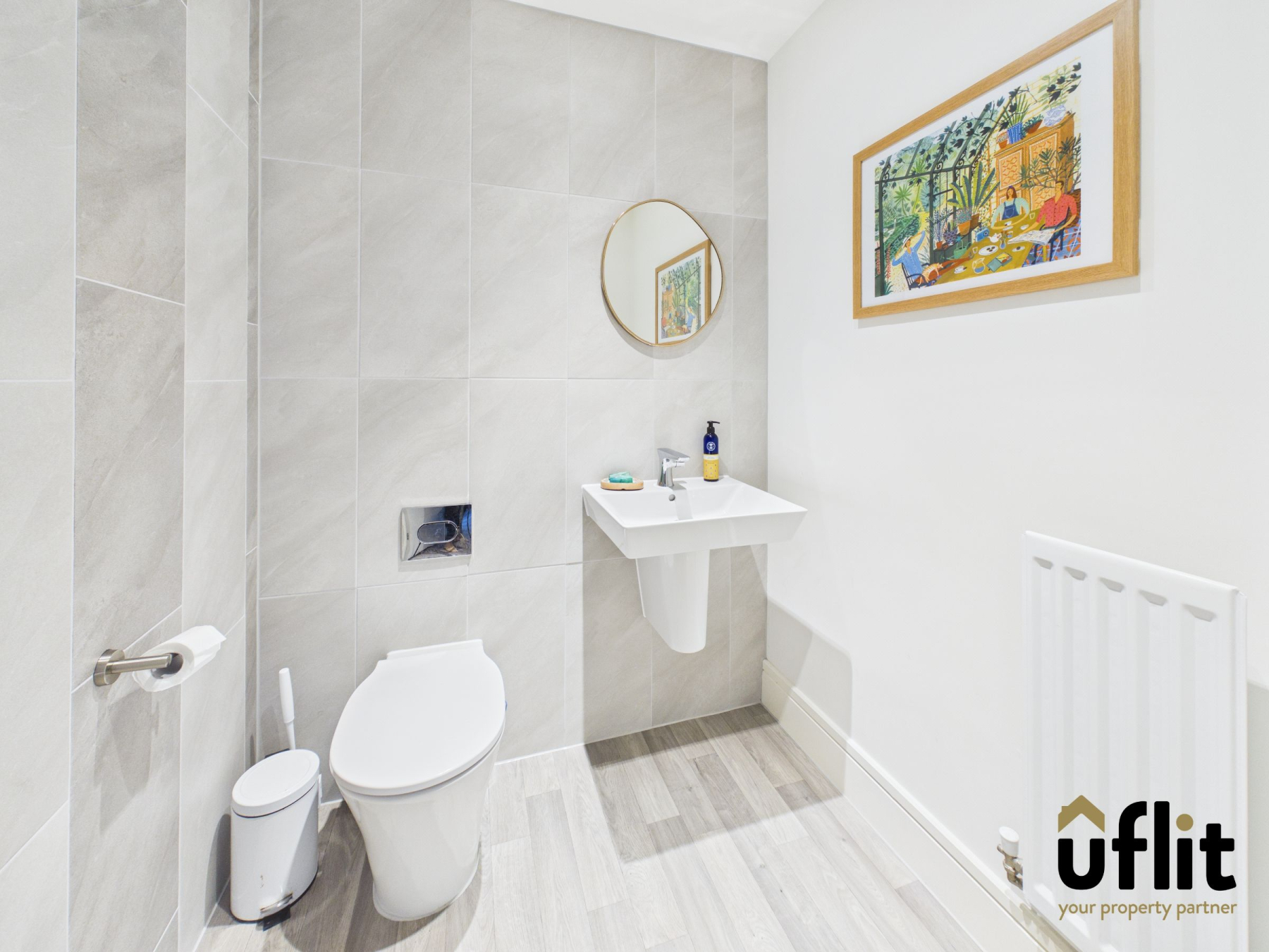 Accessed from the hallway, the downstairs WC is finished with LVT flooring and partial tiling. It features a low-level WC, a modern floating wash basin, radiator and spotlights, creating a sleek and functional space.