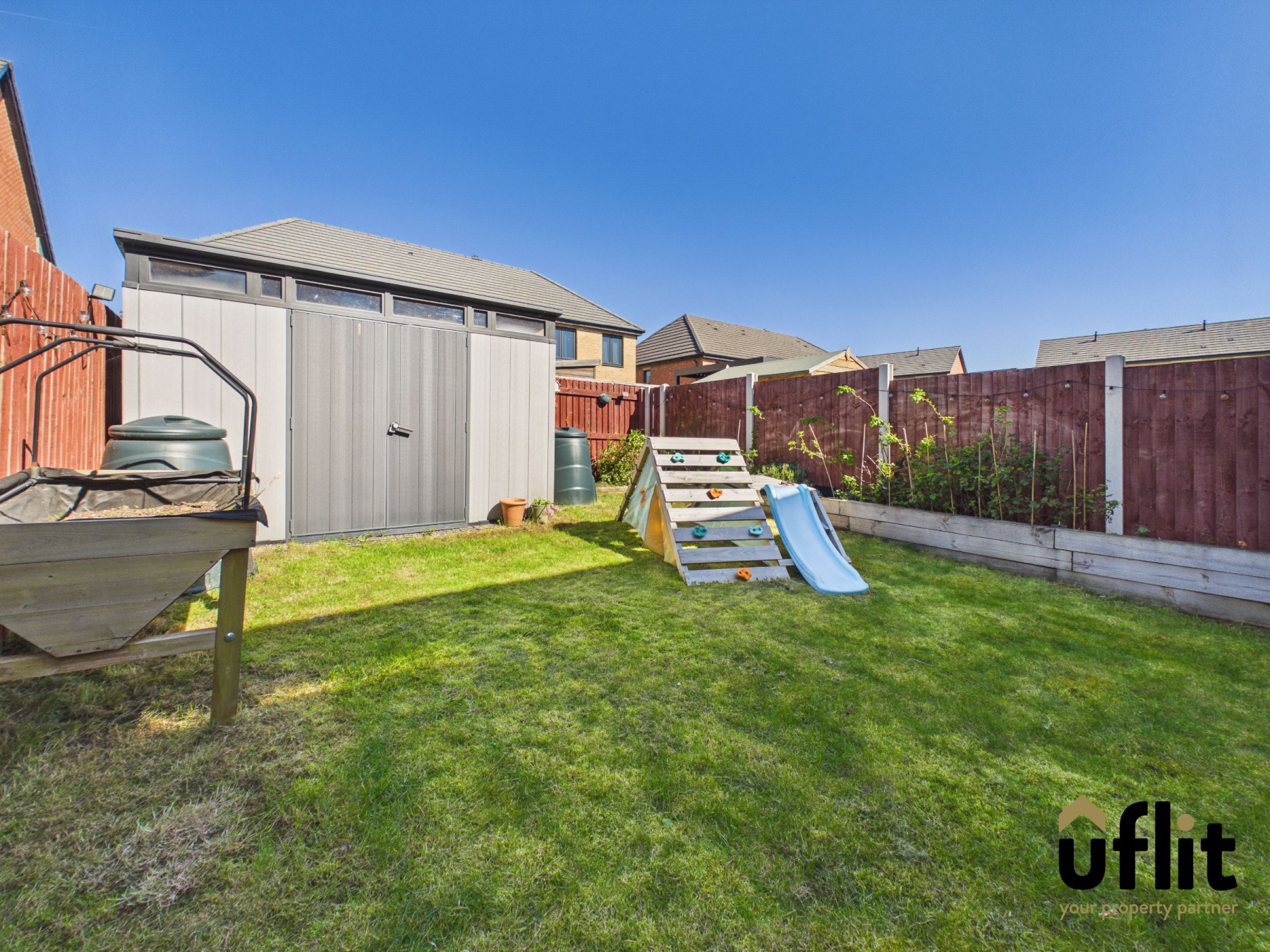Externally, the property continues to impress. The rear garden can be accessed directly from the lounge via the bi-fold doors, opening onto a patio area perfect for outdoor seating and entertaining. Beyond this lies a well-maintained lawn, enclosed for security, with borders featuring established shrubbery. A shed provides additional outdoor storage and there is convenient side access via a gate.
