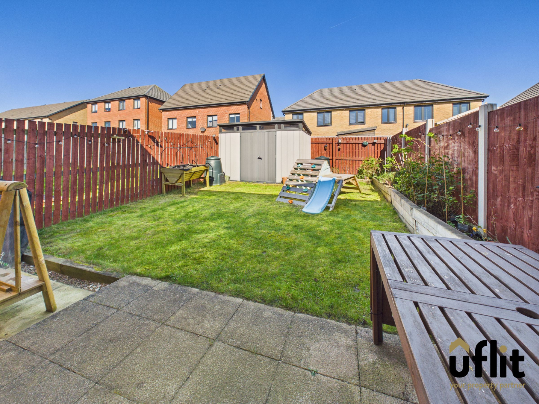 To the rear, bi-fold doors from the lounge open onto a patio area, ideal for outdoor seating and entertaining. The garden is mainly laid to lawn, fully enclosed for security, with borders featuring established shrubbery. A shed provides additional storage, and there is convenient side access via a gate.