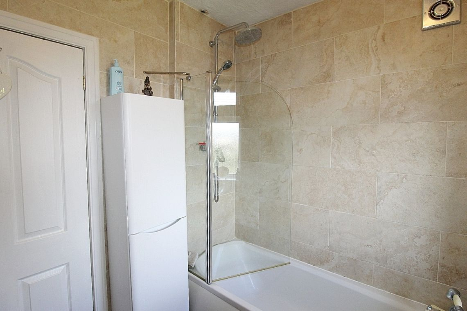 A modern bathroom benefitting from a paneled bath with overhead shower and screen, further mixer tap shower, wash hand basin and a low level wc. Fully tiled walls with contrasting flooring, heated towel rail and a rear facing upvc window.
