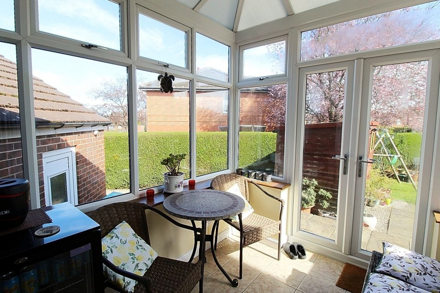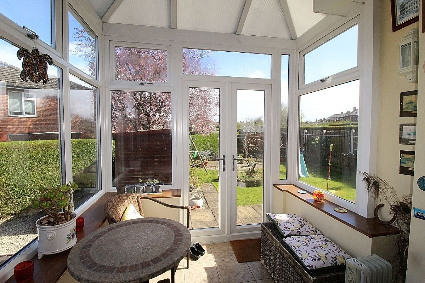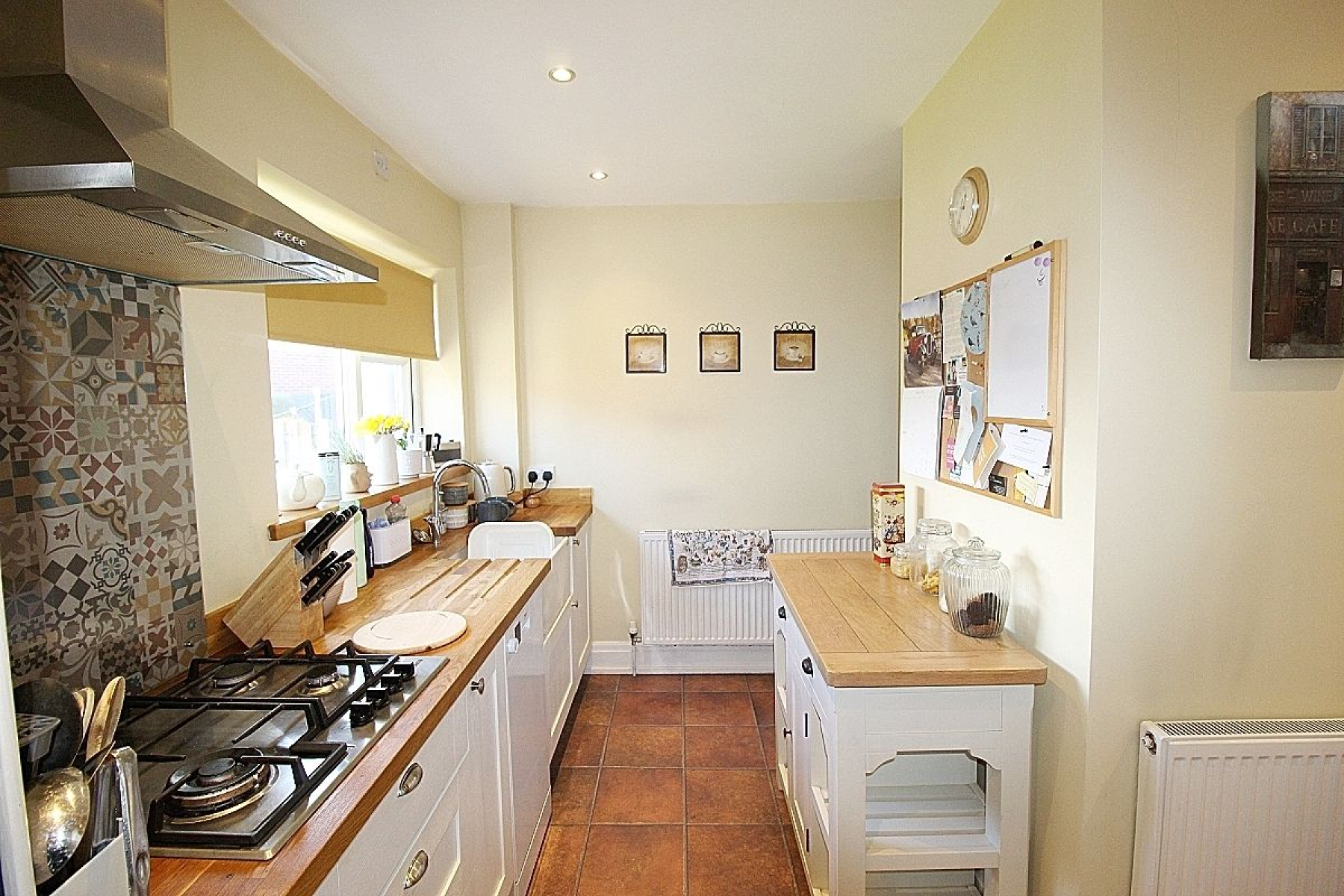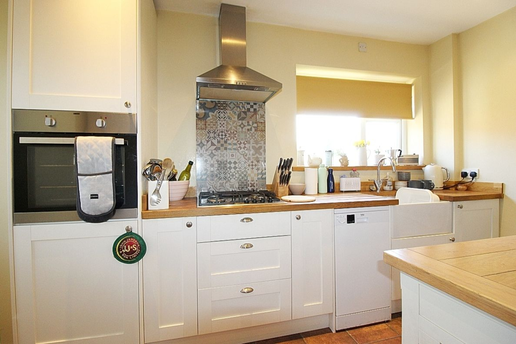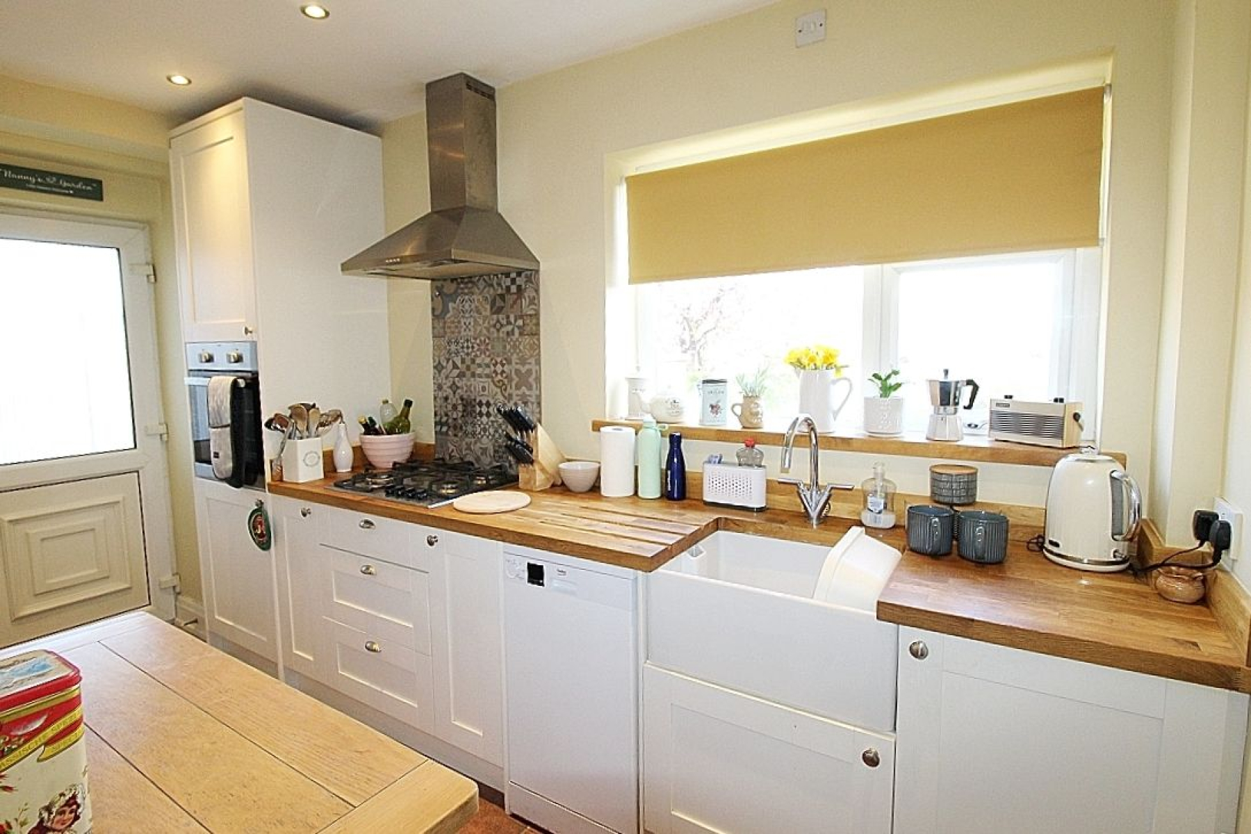An extended modern breakfast kitchen featuring a large range of wall and base units with complimentary solid woodwork surface areas, under counter ceramic sink and matching upstands. Appliances to include a built in electric oven, gas hob with bespoke glass back panel, extractor fan and dishwasher. A rear facing upvc window allows light along with a side facing upvc door to the conservatory, laminate flooring, two radiators add warmth, a door gives access to understairs storage cupboard and a feature sun tunnel further illuminates.