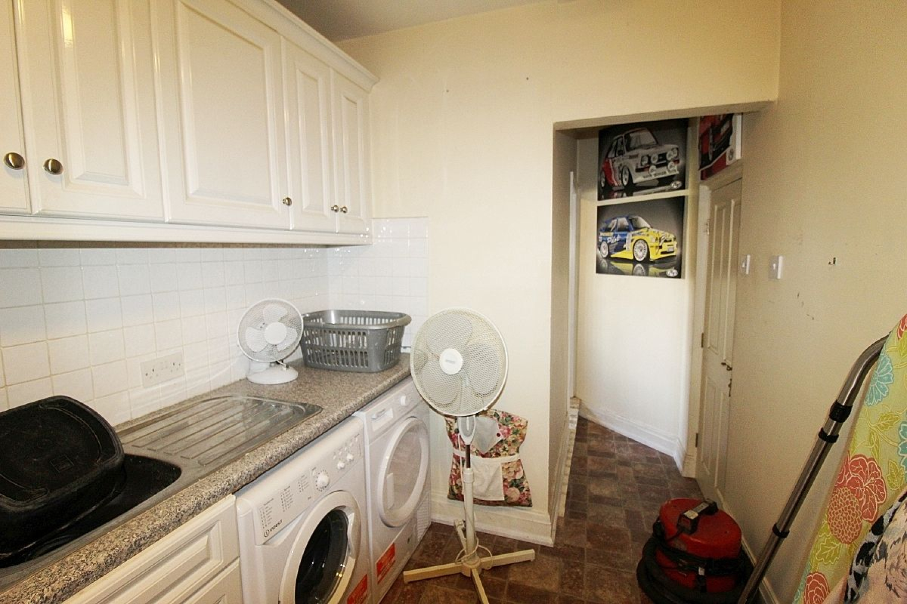 A large utility cloakroom benefitting from a range of wall and base units with complimentary work surface areas, counter top sink and plumbing for utilities, vinyl flooring, radiator and doors to the double garage and office.