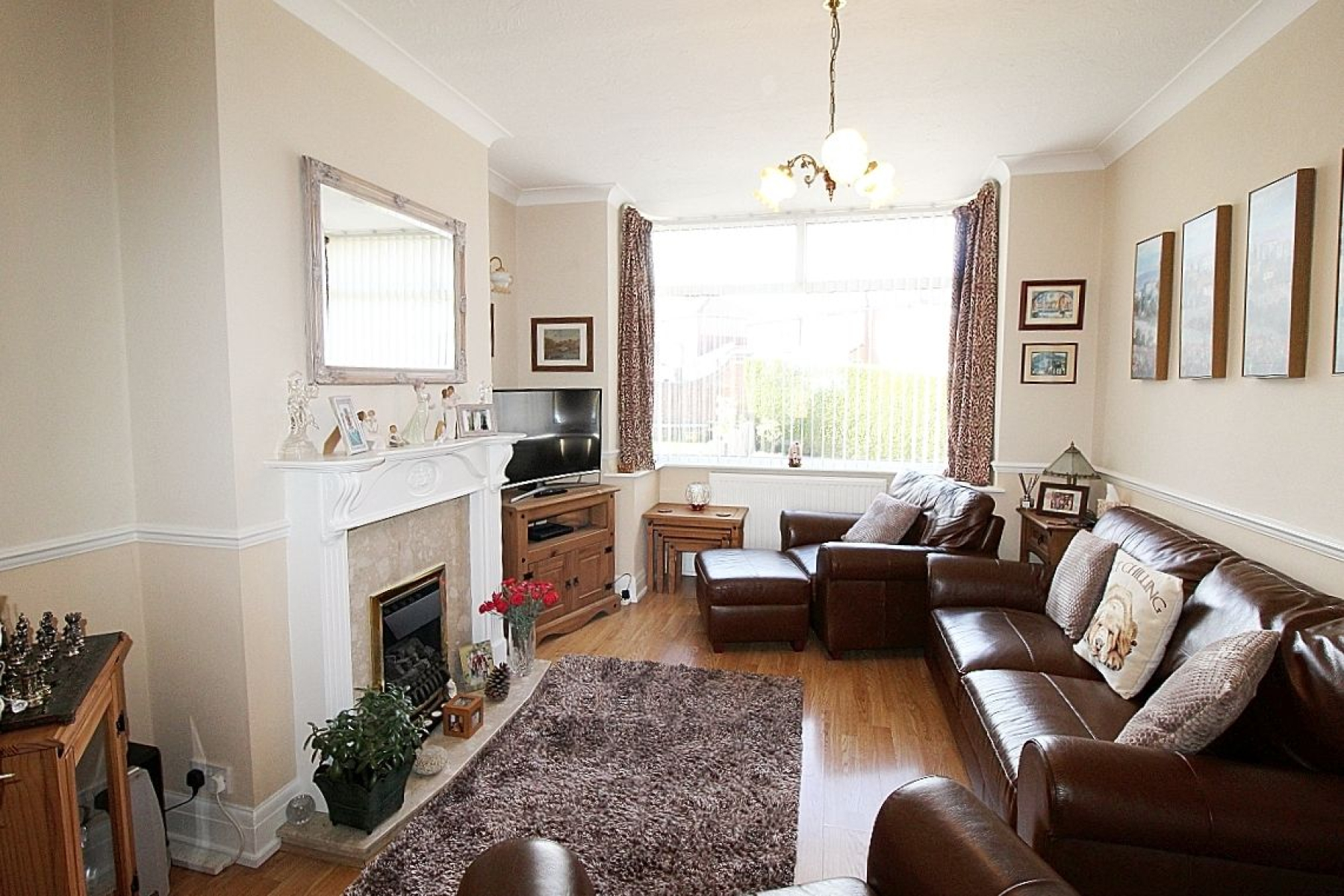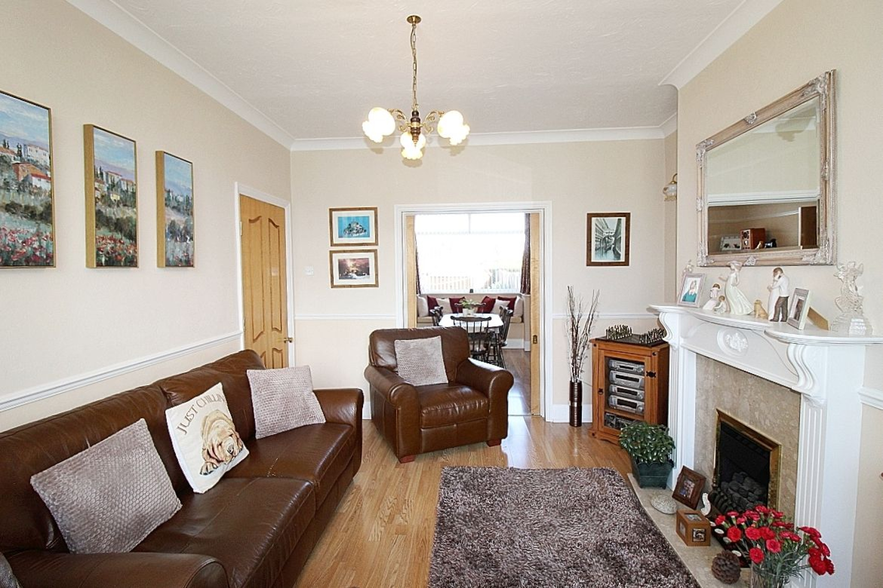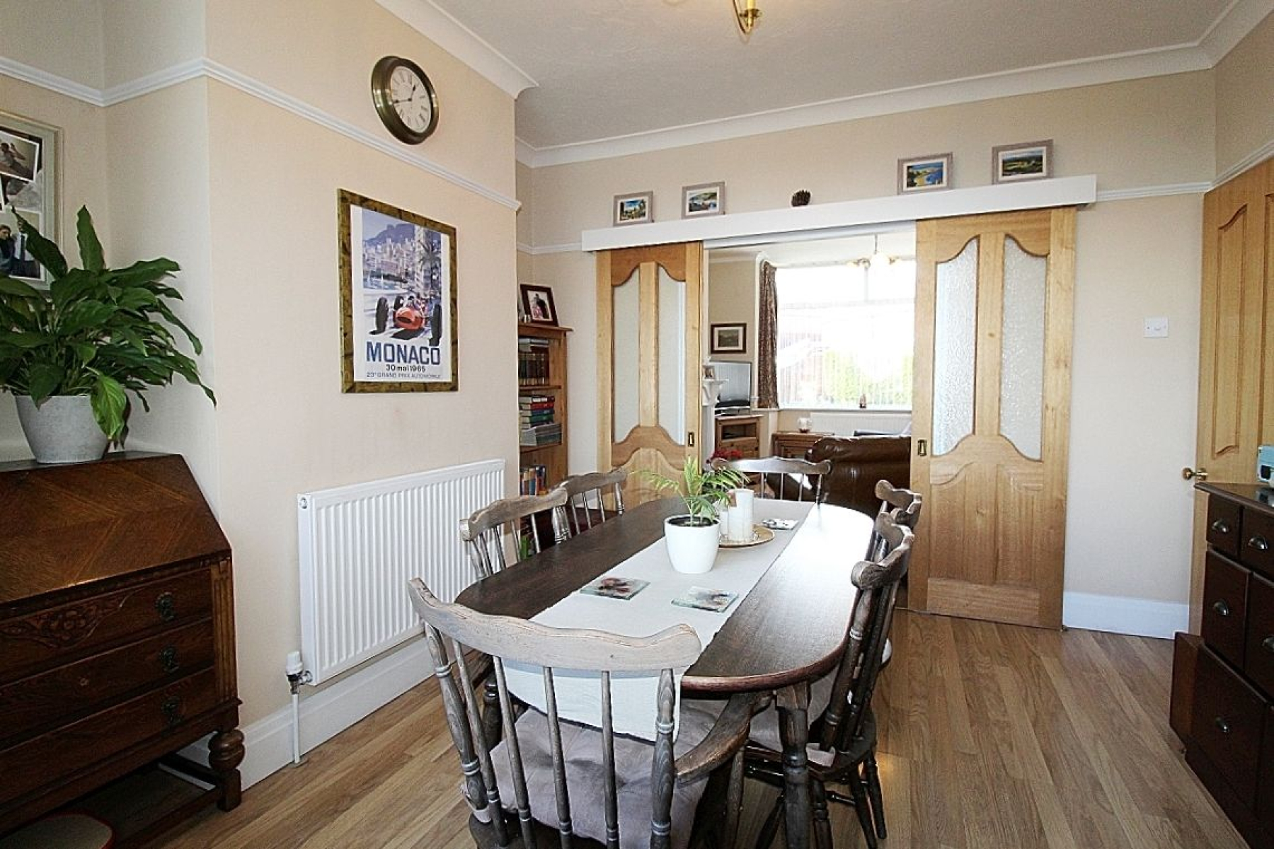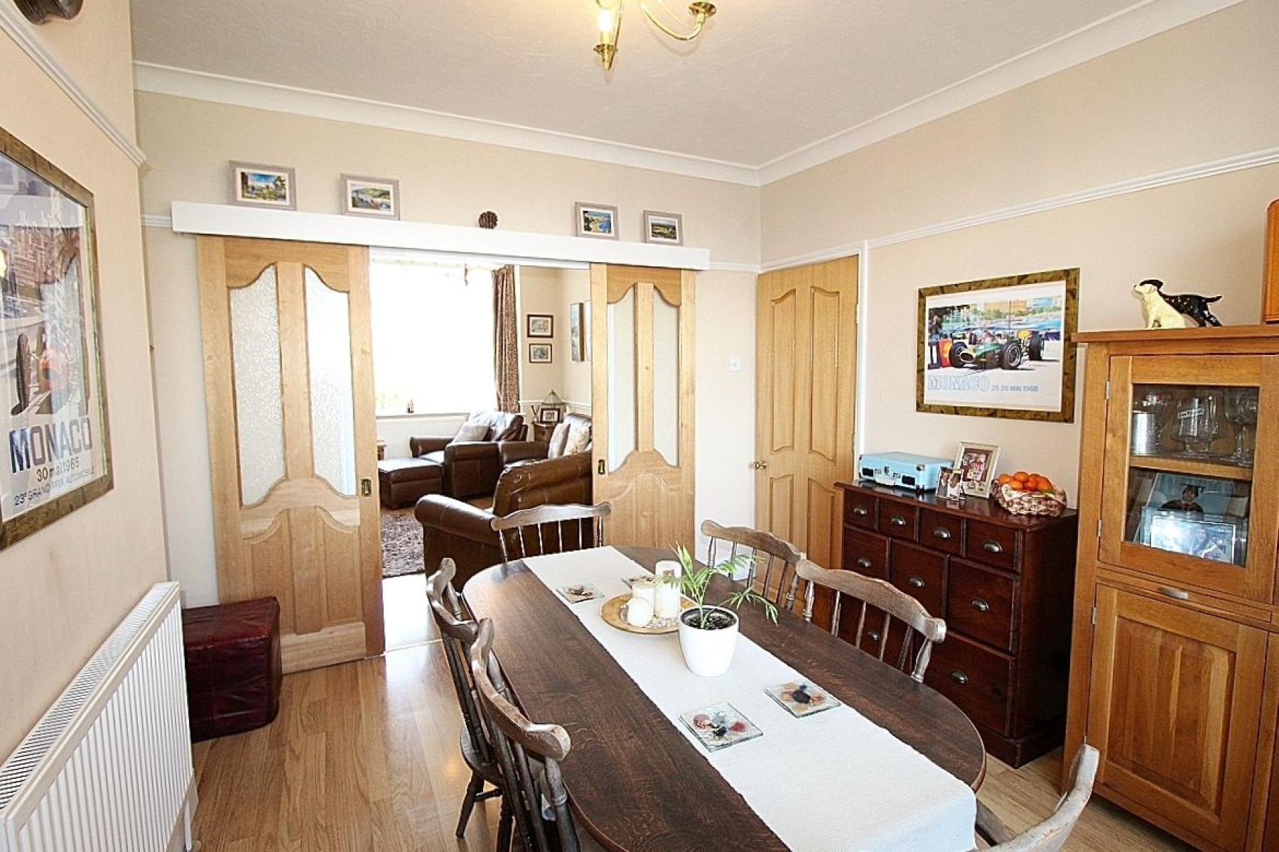 A spacious beautifully presented living area with laminate flooring flowing throughout and a stunning focal feature fire surround with inset fire and marble façade adopts the chimney breast. A front facing upvc bay window allows an abundance of light to flow through to the offset dining area accessed via solid wood sliding doors with glazed panels and a radiator adds warmth.