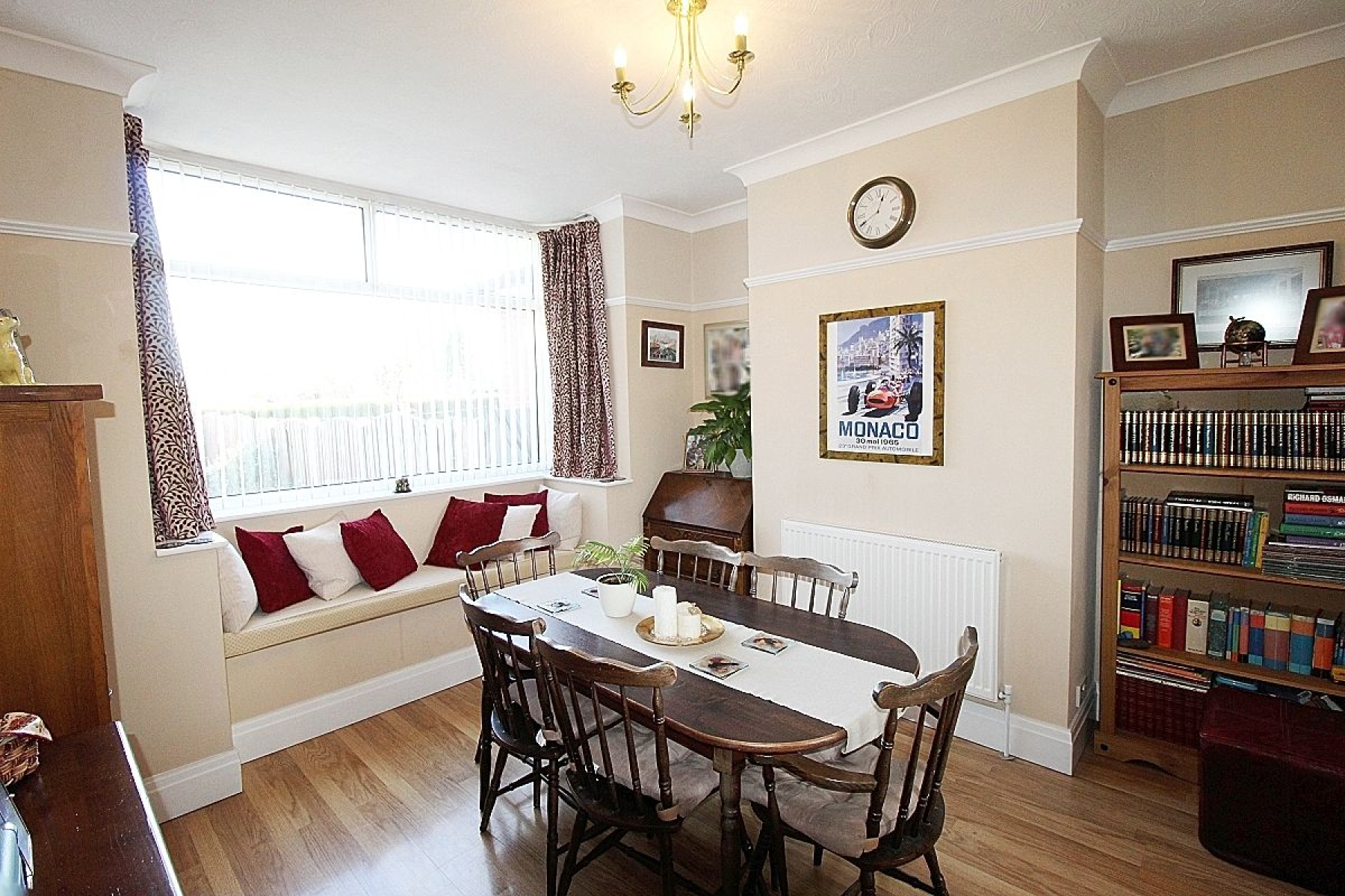 A further bay windowed reception room with bespoke seating, a continuation of the laminate flooring, radiator and a solid wood door to the kitchen