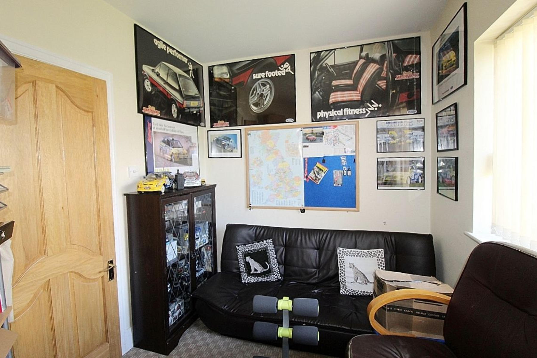 A quirky office ideal for remote working withy carpeted flooring, radiator and a upvc window.