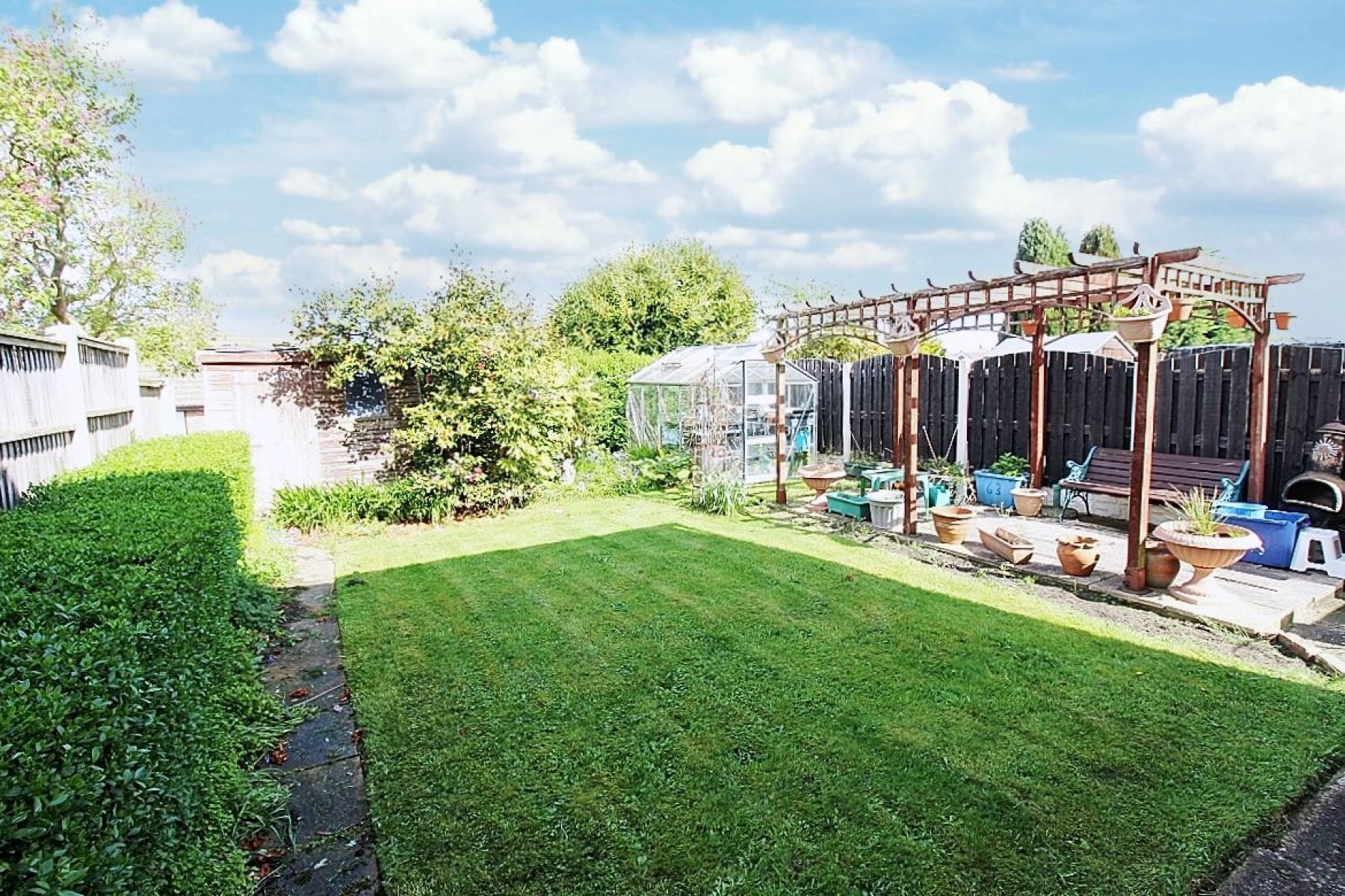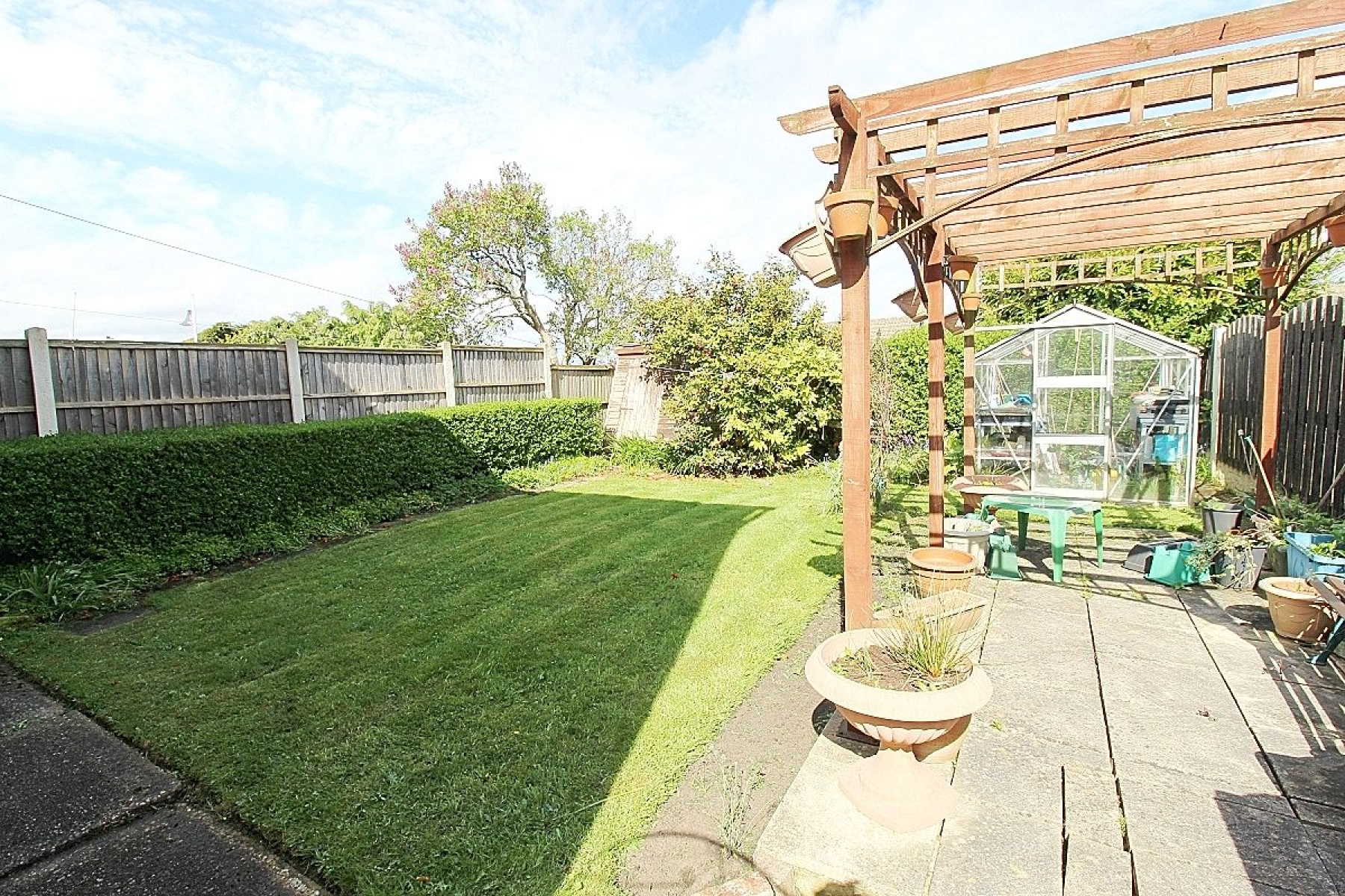 Outside An open aspect frontage predominantly lawned and a driveway provides ample off-road parking. Gated access to the rear which benefits from a paved patio sheltered by a pergola leading to a lawned garden with manicured borders and a garden shed and greenhouse.