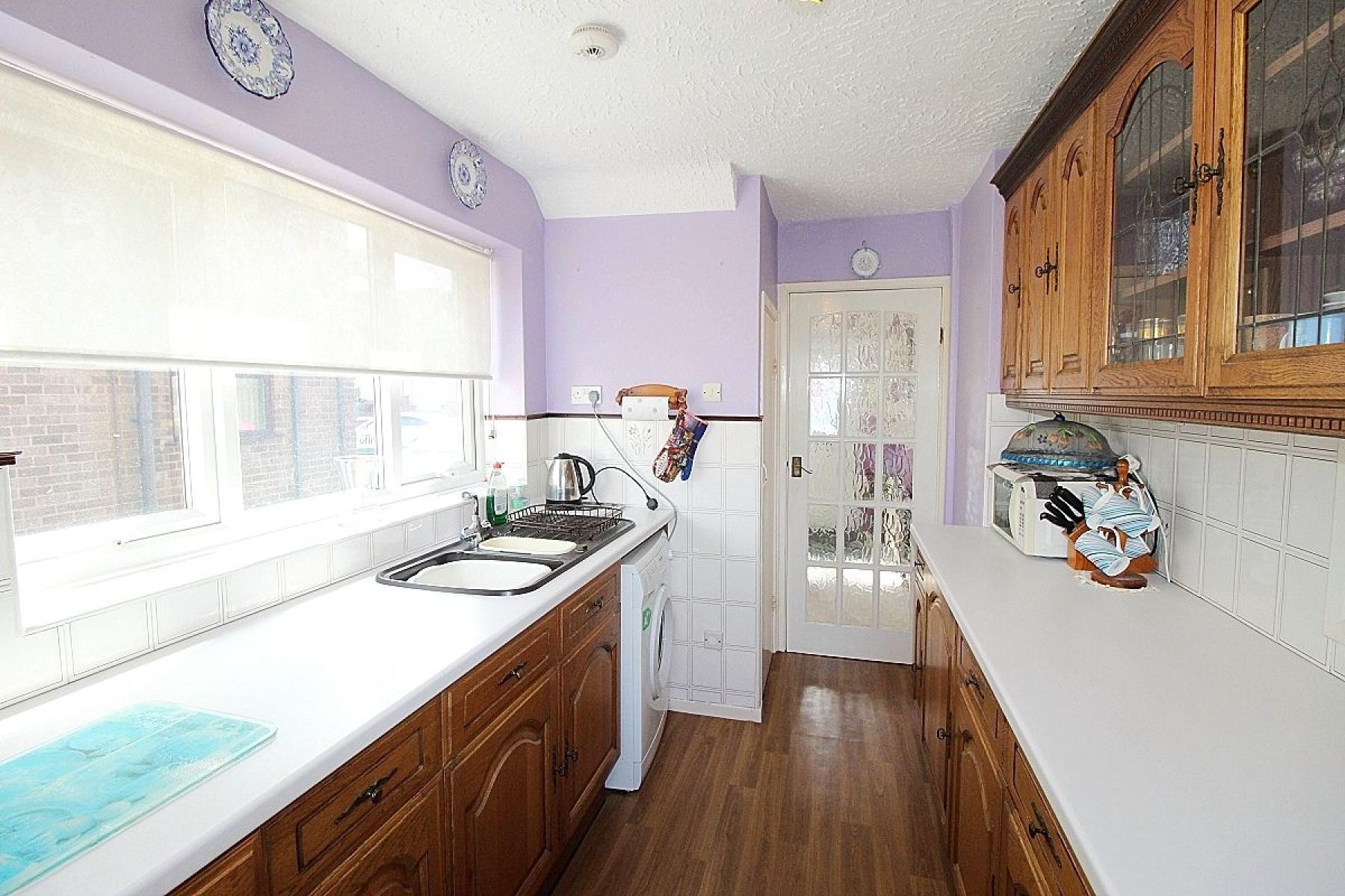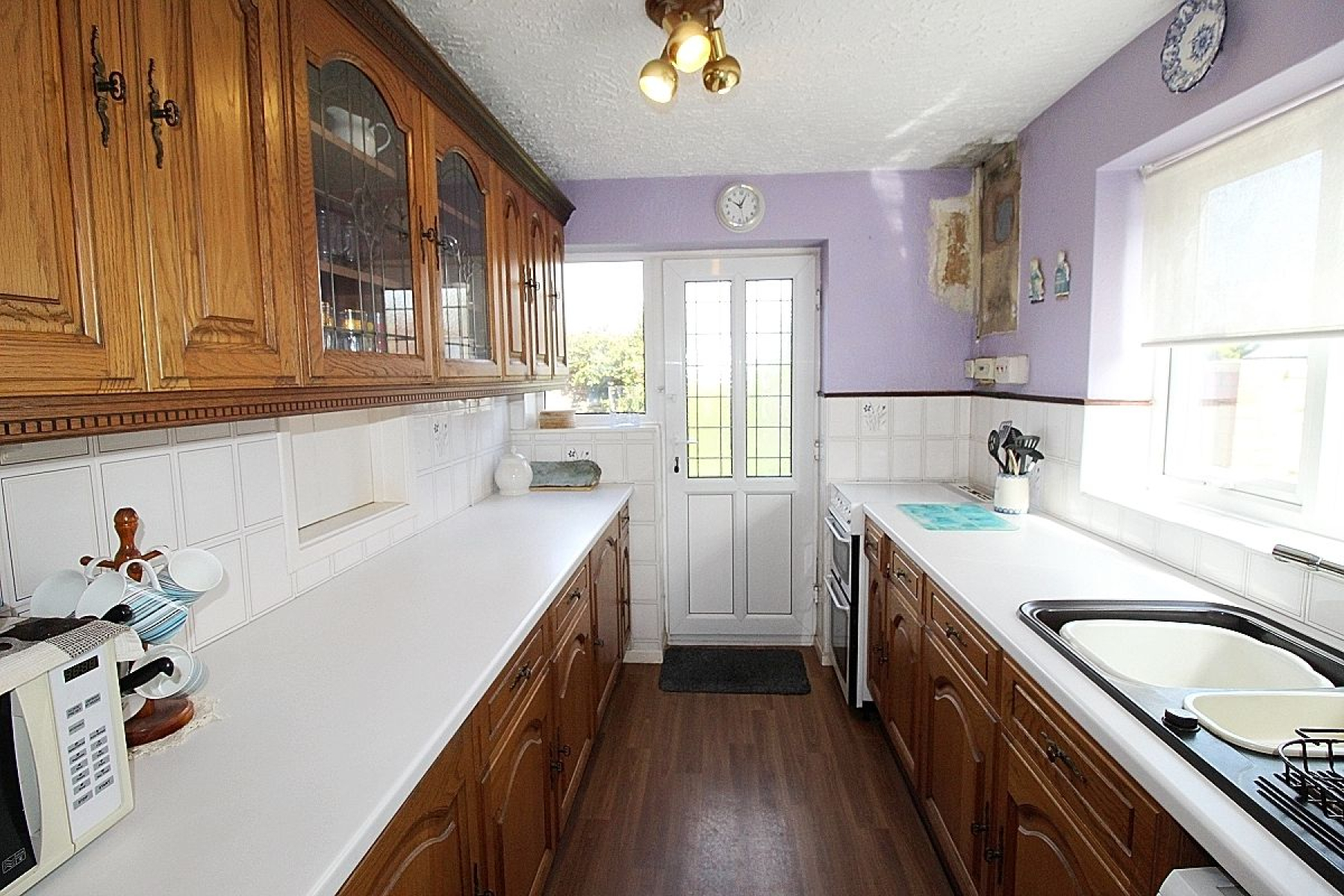 Kitchen w: 2.3m x l: 3m (w: 7' 7" x l: 9' 10") Featuring a range of wall and base units with complimentary worksurface areas, tiled back panels and contrasting vinyl flooring. Appliances to include an inset oven and plumbing for further utilities. A side facing upvc window allows light, a glazed upvc door with glazed side panel gives access to the rear garden and a built-in storage cupboard.