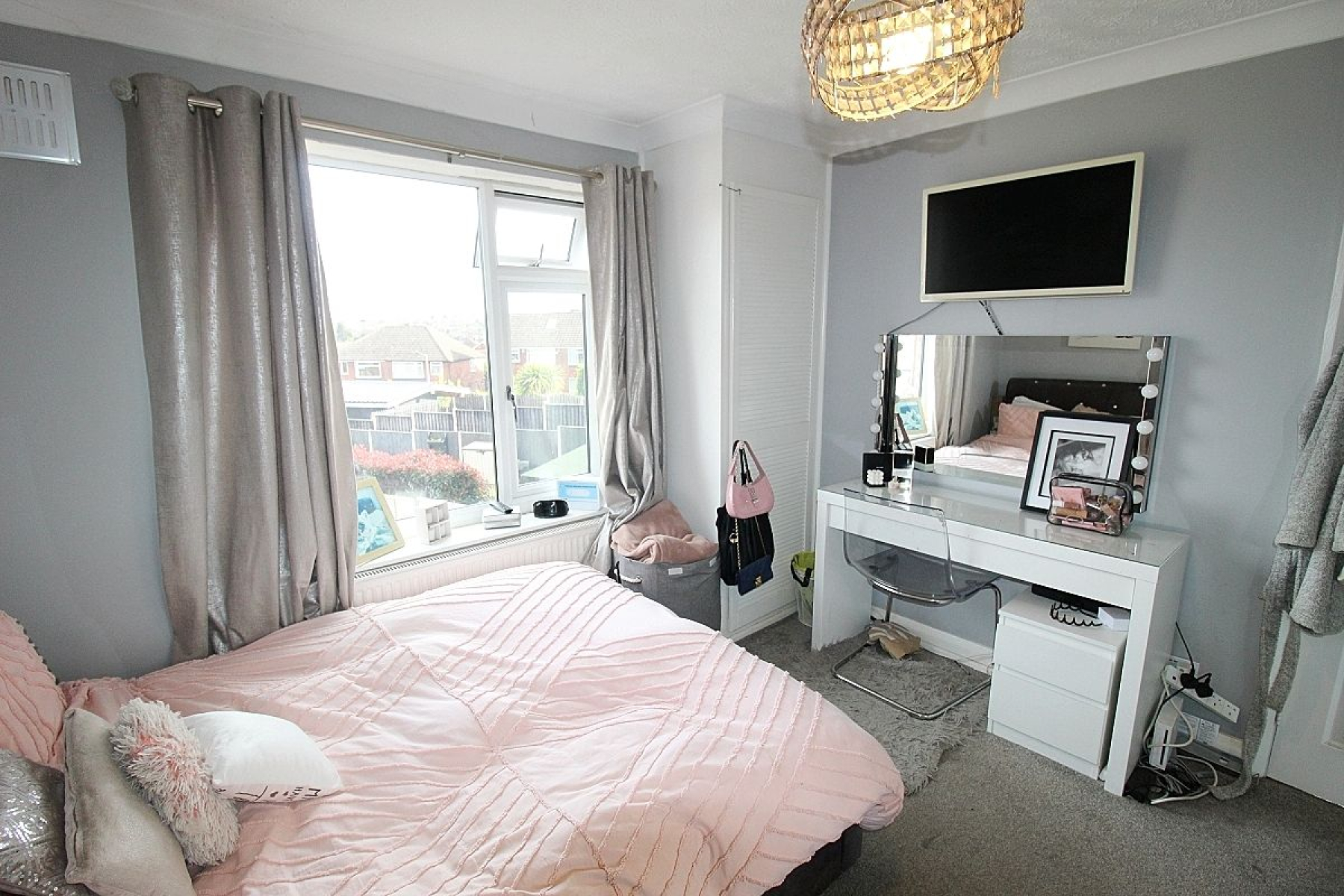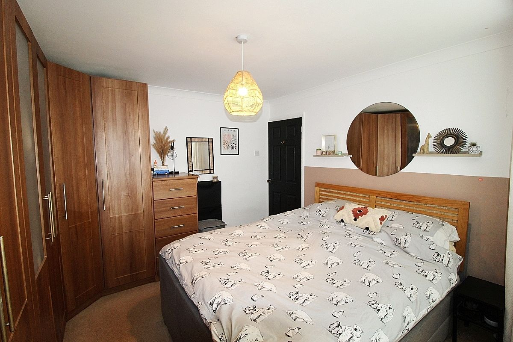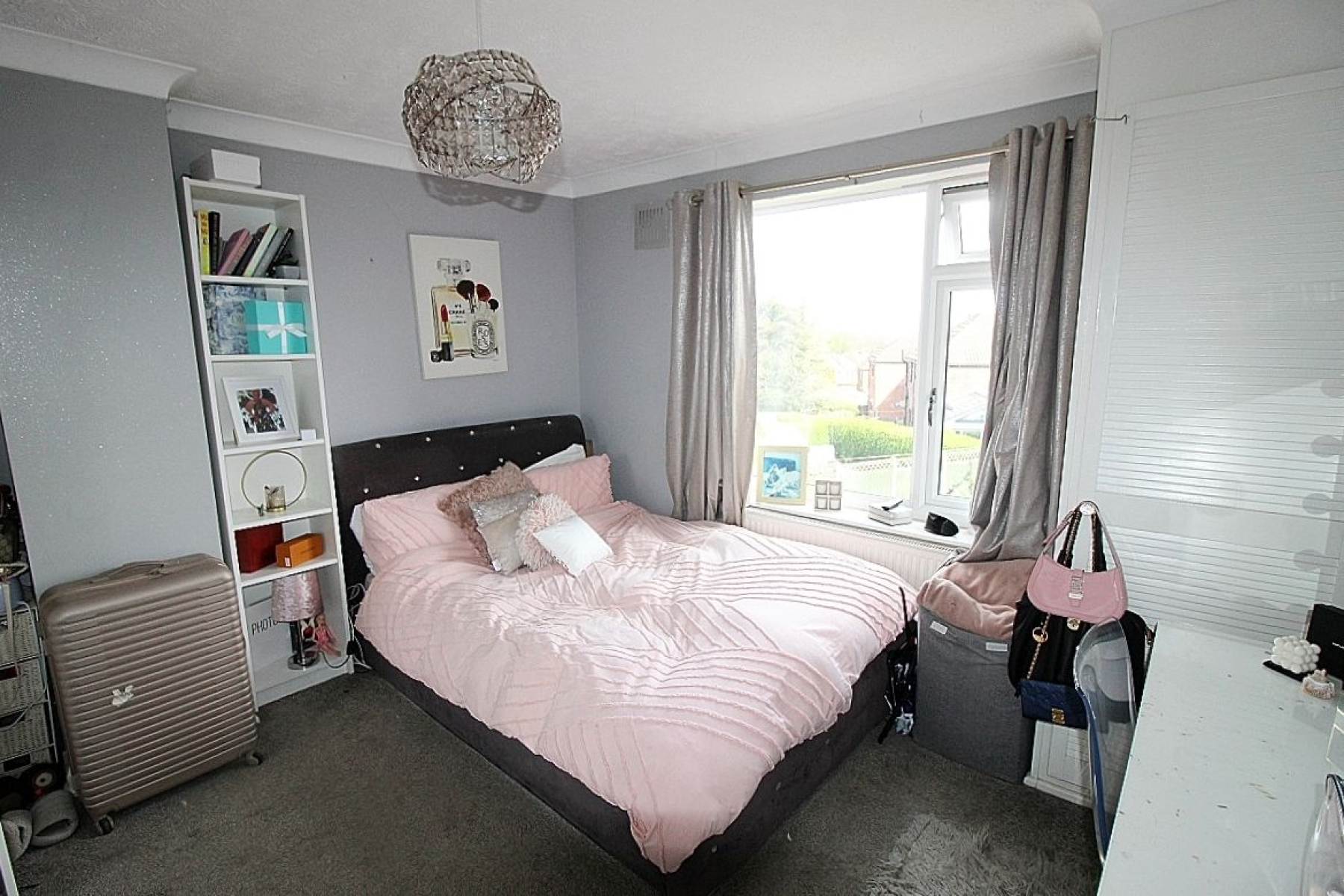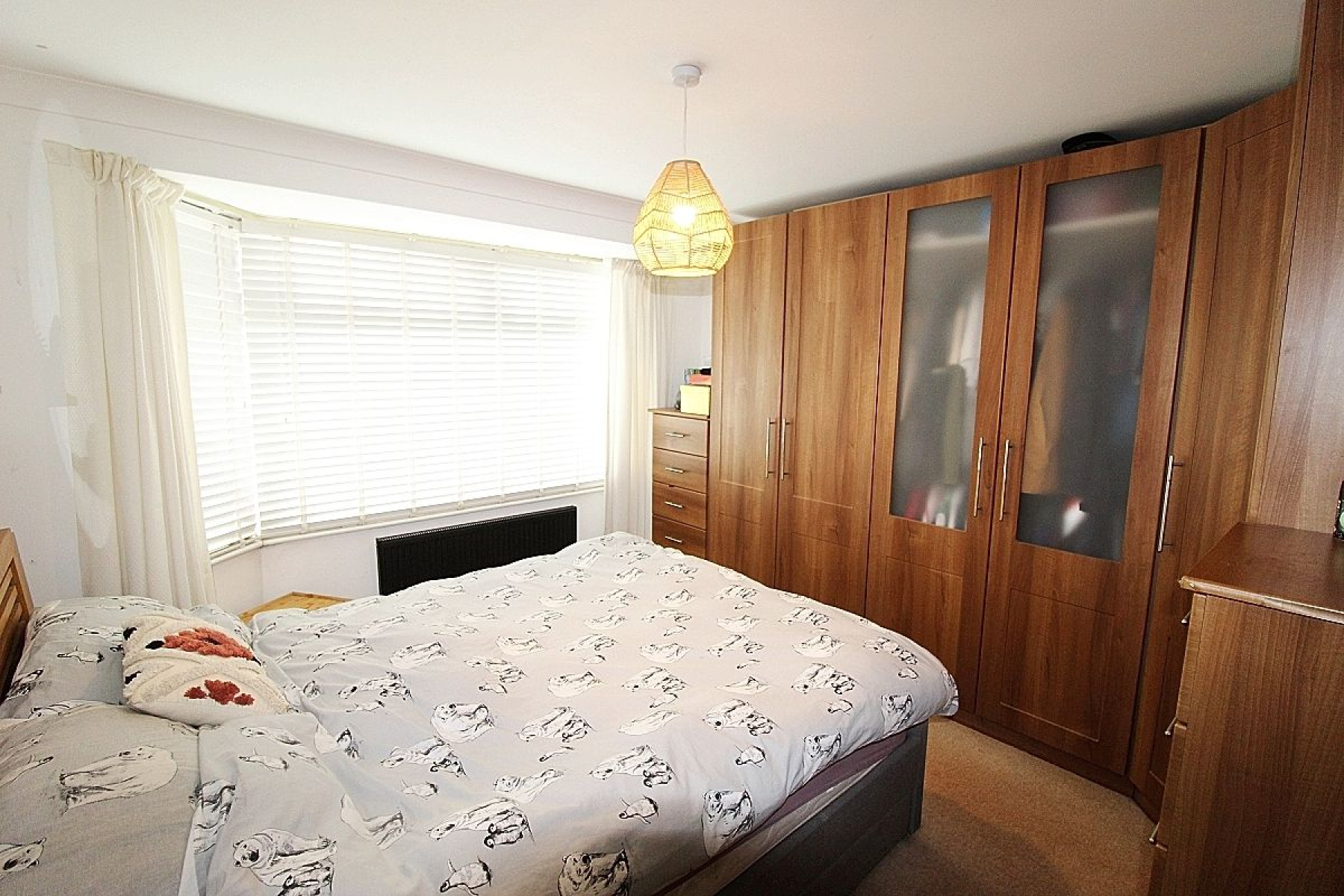 A double bedroom with carpeted flooring, radiator and a front facing upvc bay window,