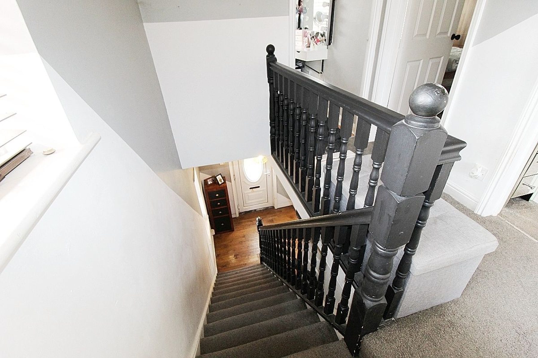 A carpeted landing with spindled banister rail, loft hatch providing additional storage, side facing upvc window and doors giving access to three bedrooms and the family bathroom.