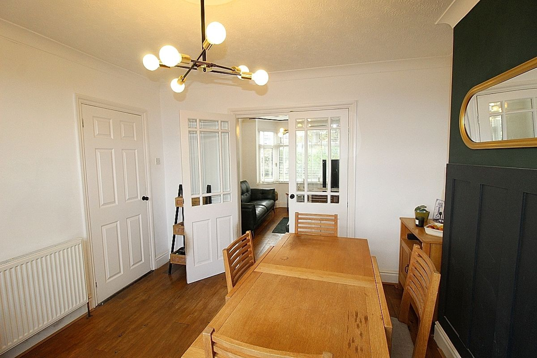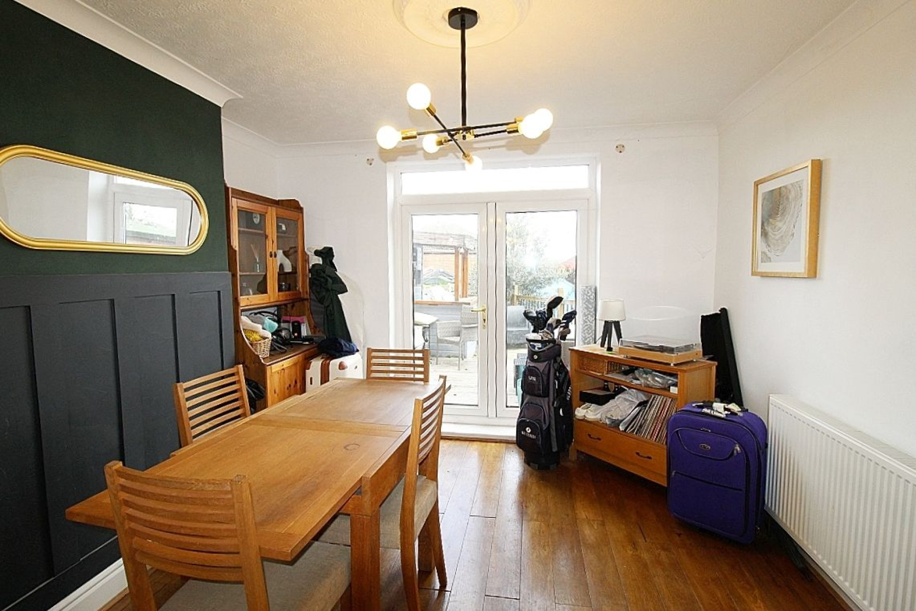 With a continuation of the solid wood flooring, further radiator and French doors to the garden.