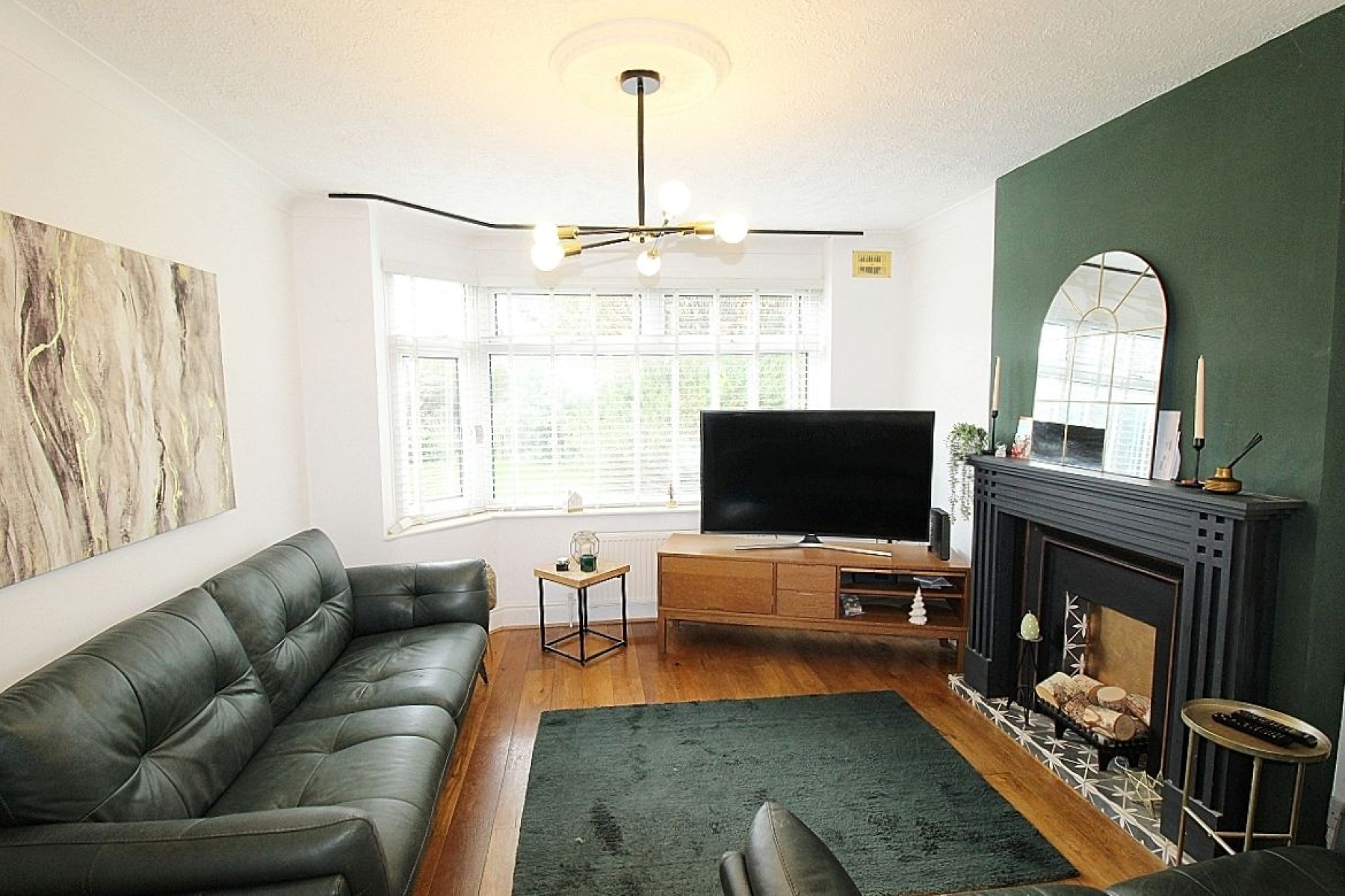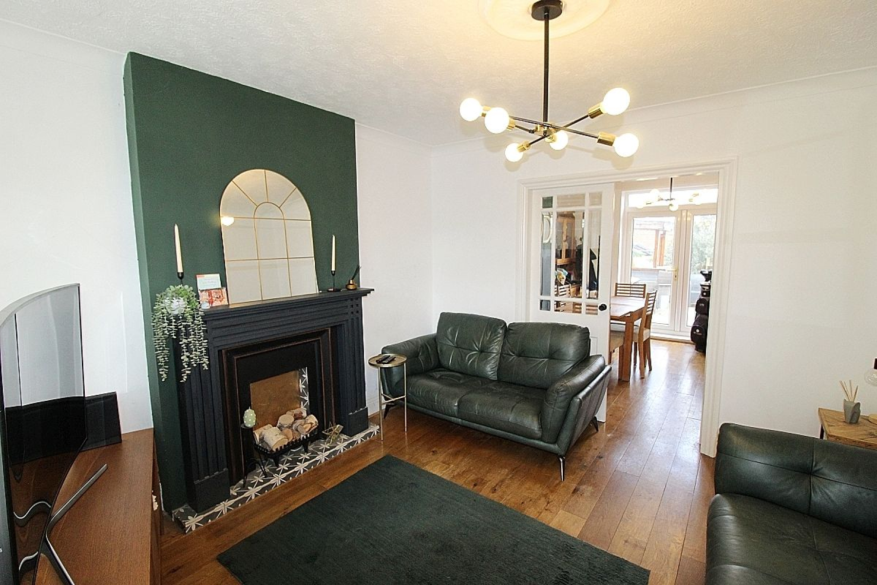An attractive focal feature fire with tiled bed complements the chimney breast, solid wood flooring flows throughout this area, radiator, a front facing upvc bay window allows light to illuminate this space and French doors open to the dining area.
