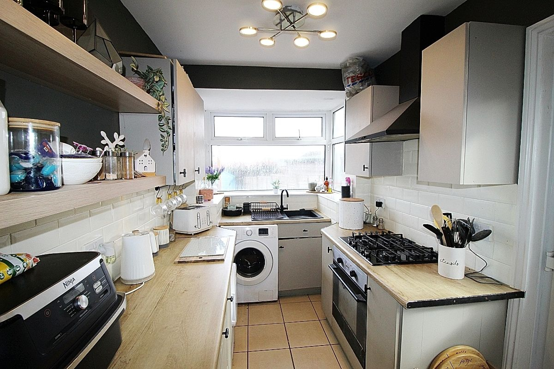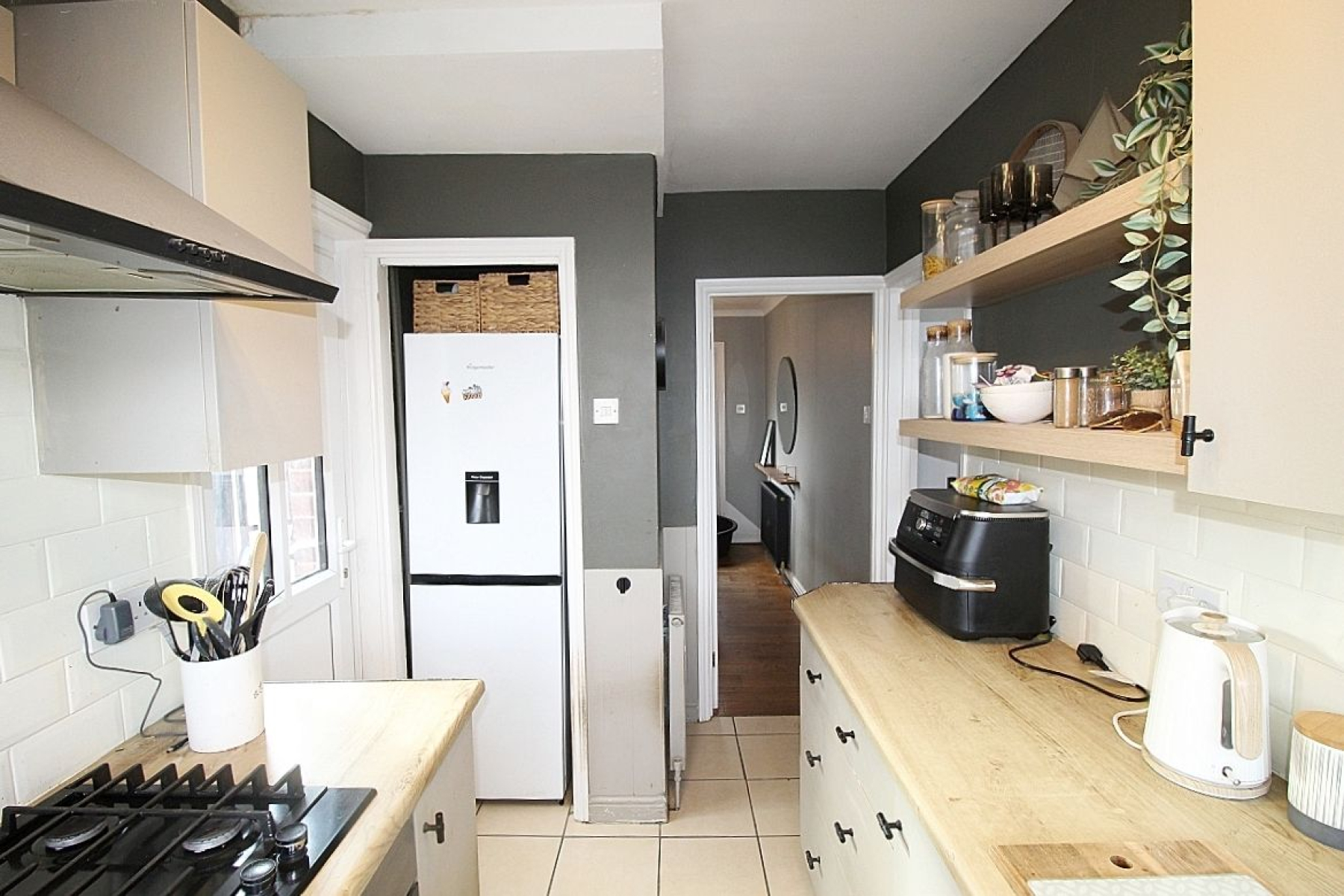 Featuring a range of wall and base units with complimentary worksurface areas and tiled back panels. Appliances to include a built in oven, gas hob, extractor fan with plumbing for further utilities, tiled flooring, the sink adopts a rear bay cleverly utilising space, radiator, a side facing glazed upvc door and a door to the dining room.
