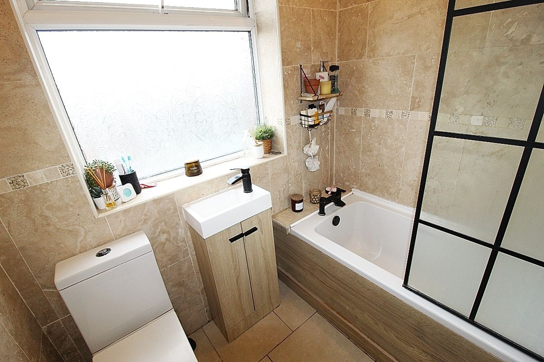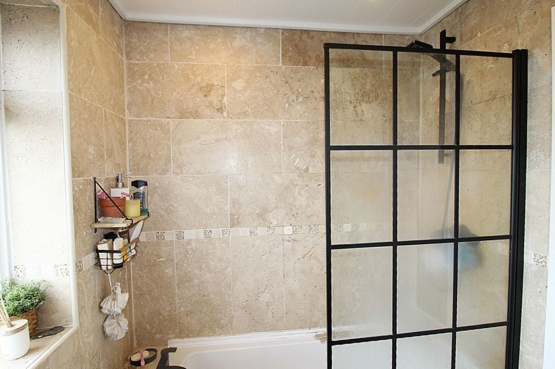 Comprising of a paneled bath with overhead shower and screen, vanity wash hand basin, low level wc and a heated towel rail. Fully tiled walls with contrasting tiled flooring, paneled ceiling with spot lighting, and a rear facing upvc window.