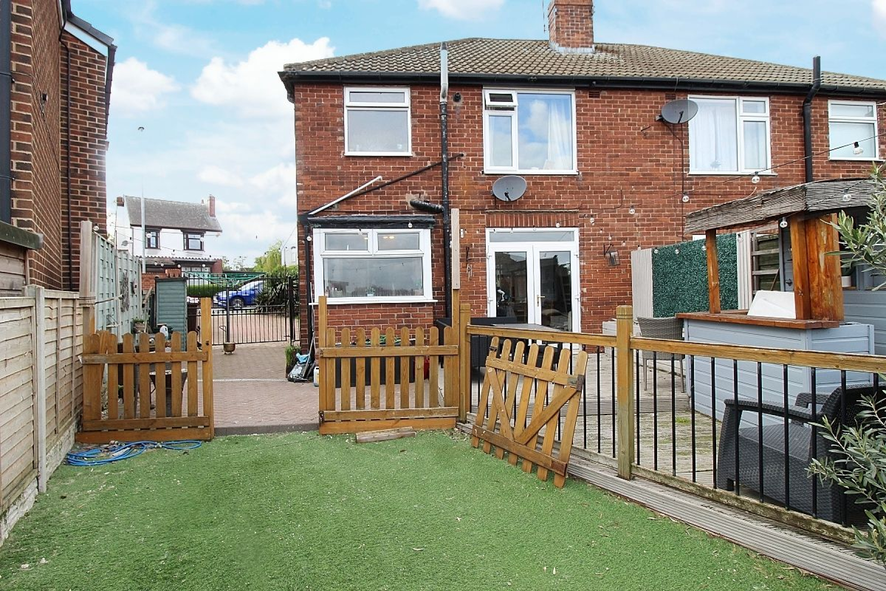 To the front of the property a delicate stone wall protects a lawned garden with manicured borders and a block paved driveway provides ample off-road parking and double gates open to extend the driveway. To the rear the block paving seamlessly wraps around the property to form a patio area adjacent to a bespoke decked patio area with balustrades and a quirky bar this leads to a low maintenance Astro turf garden all enclosed.
