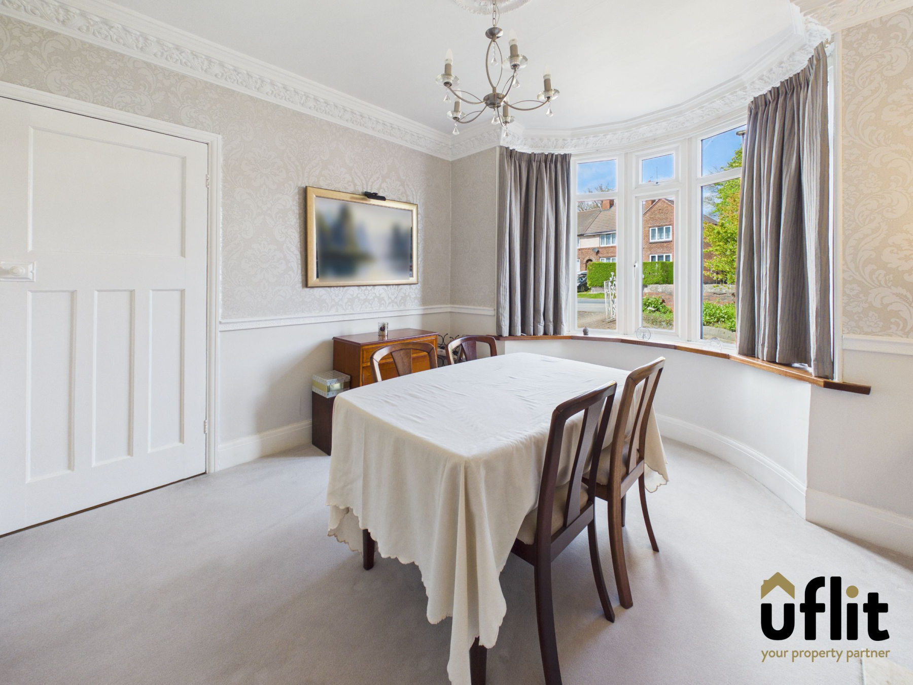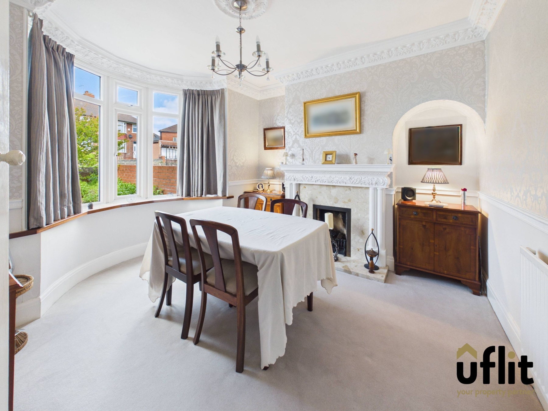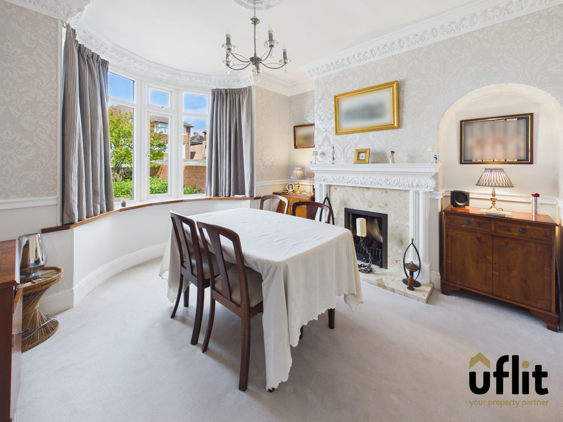 The property boasts multiple reception spaces, including a spacious lounge featuring a striking open marble gas fire with log effect, creating a cosy yet stylish focal point, complemented by a charming bay window overlooking the rear. A separate dining room to the front provides further flexibility, complete with a bay window, elegant marble fireplace and decorative features such as dado rail and coving, adding character and charm.