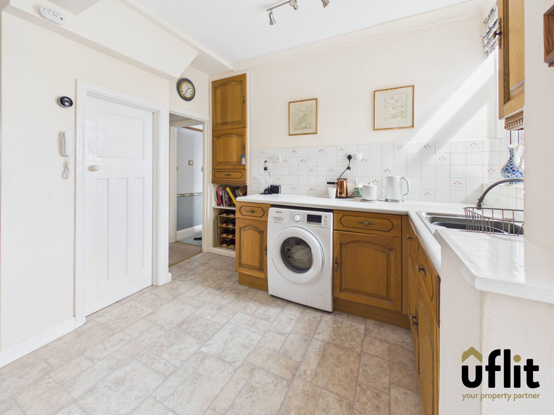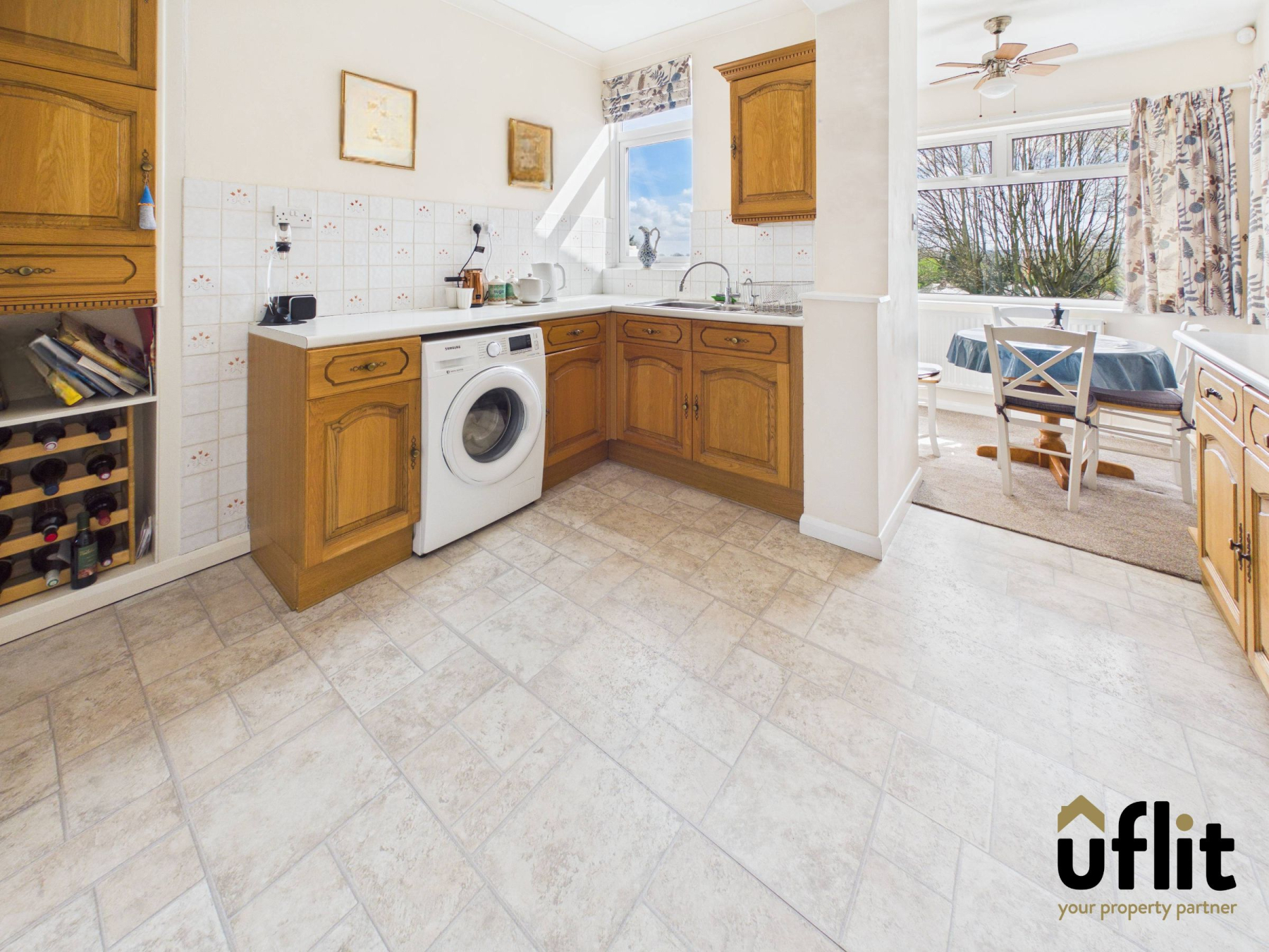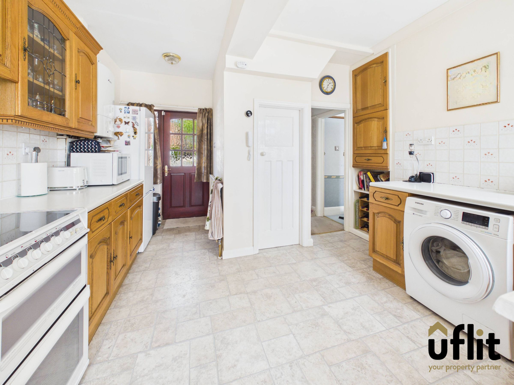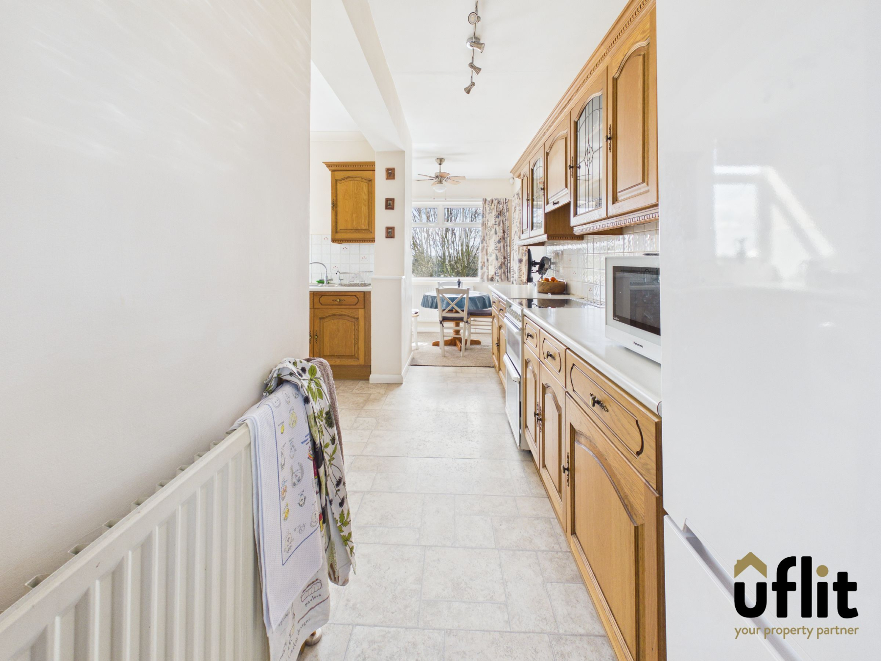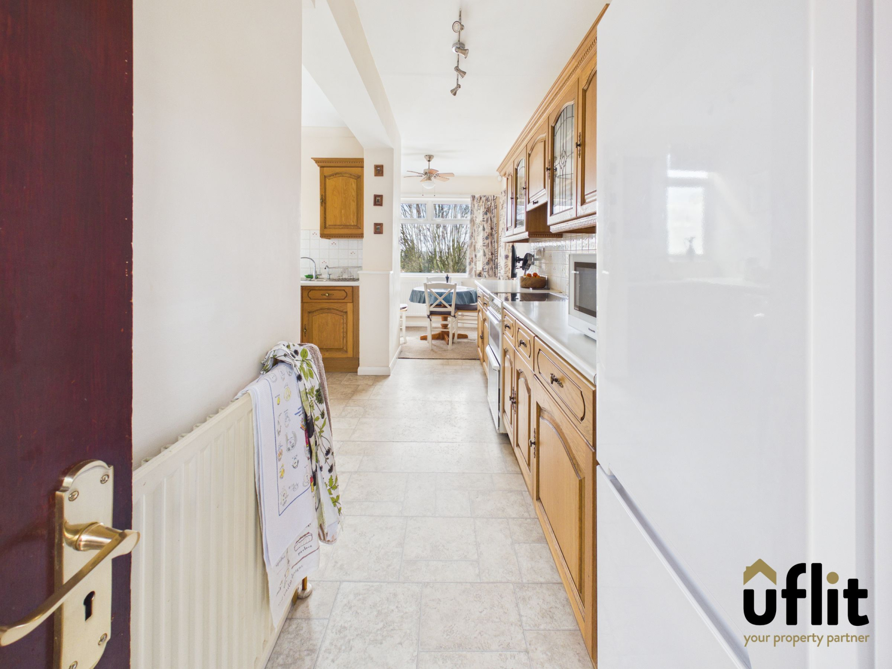 A spacious and sociable area forming the heart of the home, fitted with vinyl flooring and a radiator. The kitchen provides ample space for a washer, fridge freezer and gas oven with gas hob, catering perfectly to modern family living. A window to the rear allows natural light to flow through, while a walk-in pantry offers excellent additional storage. The dining area enjoys views over the rear garden, creating a pleasant setting for everyday meals and entertaining.