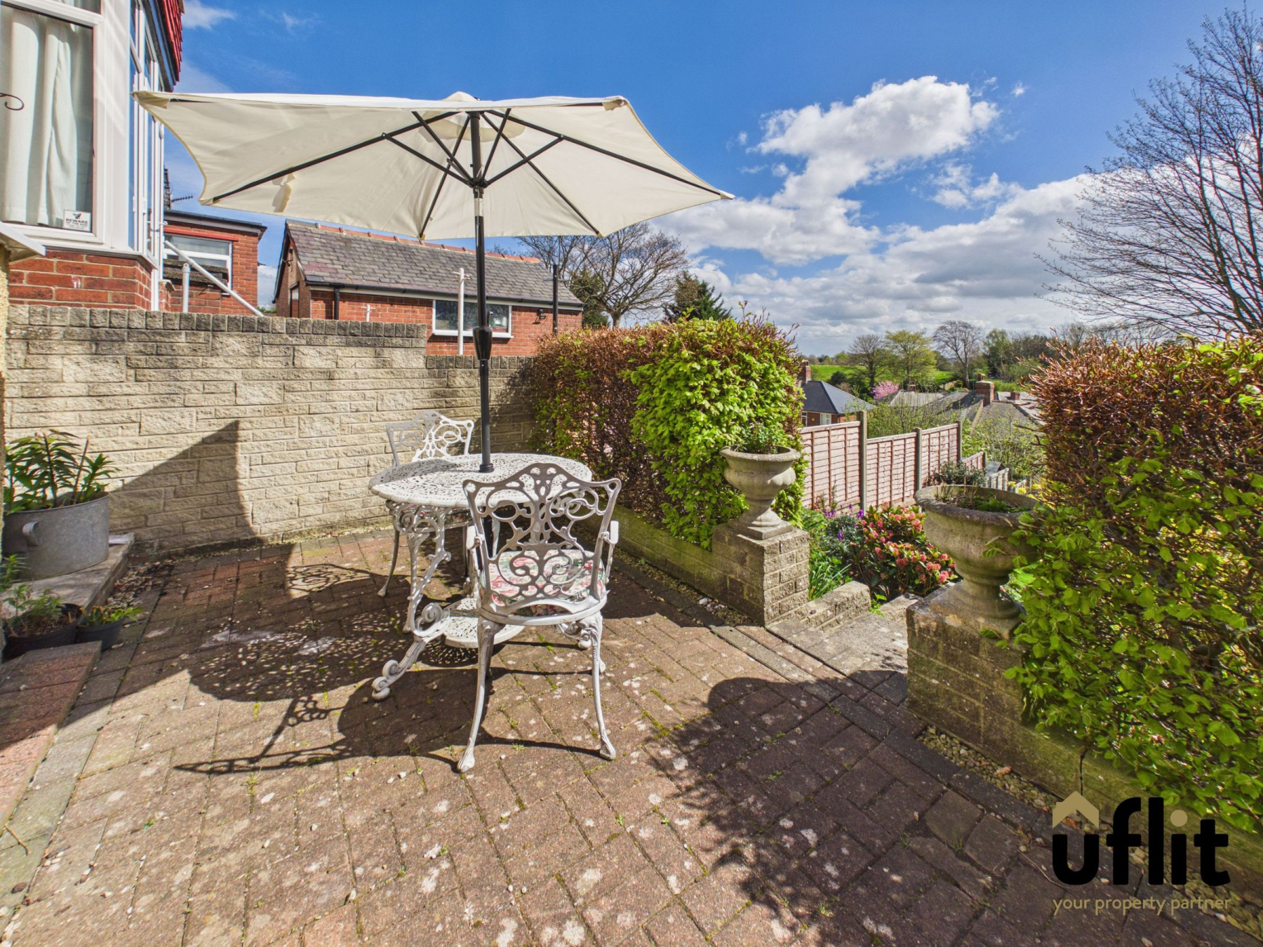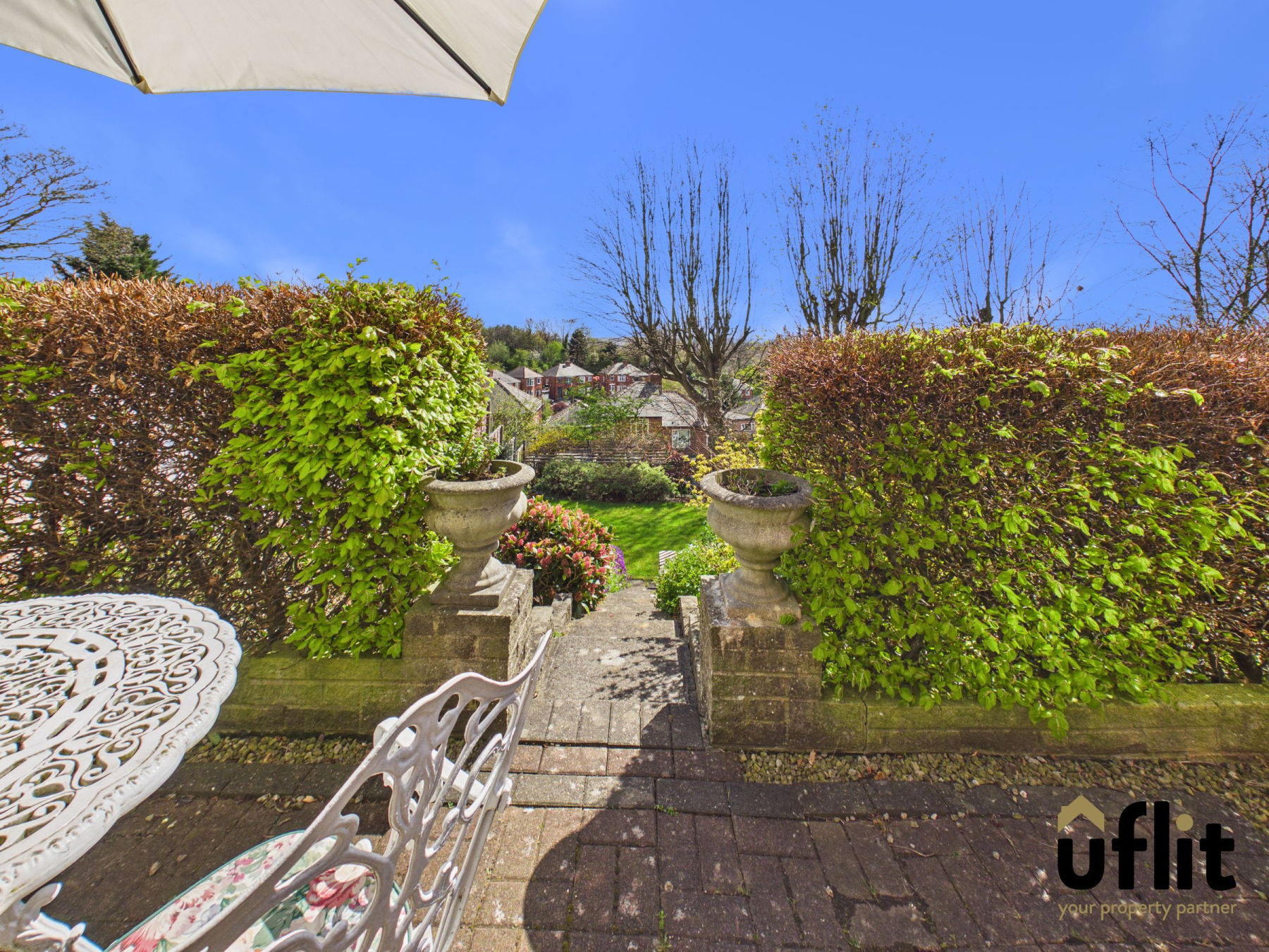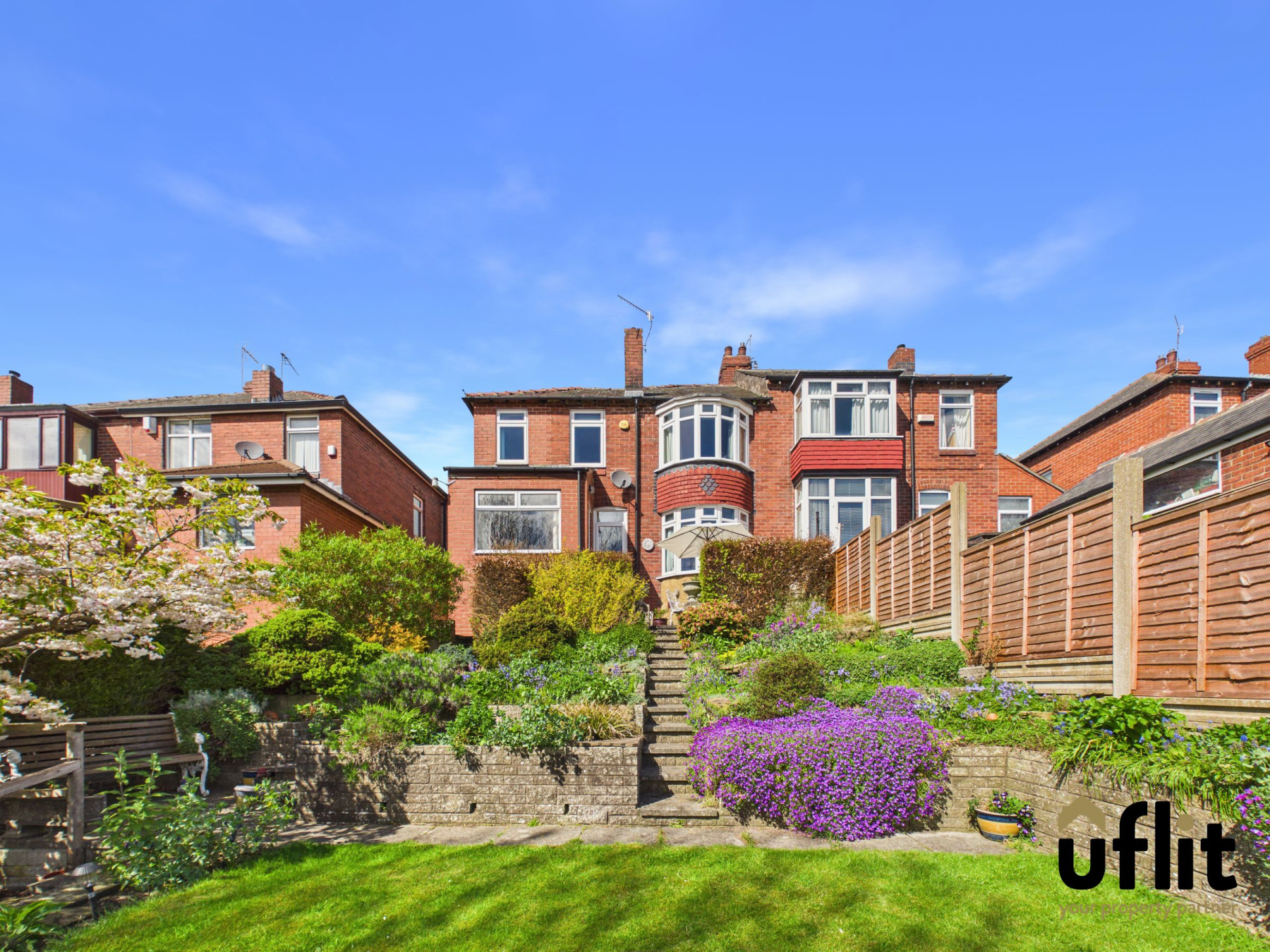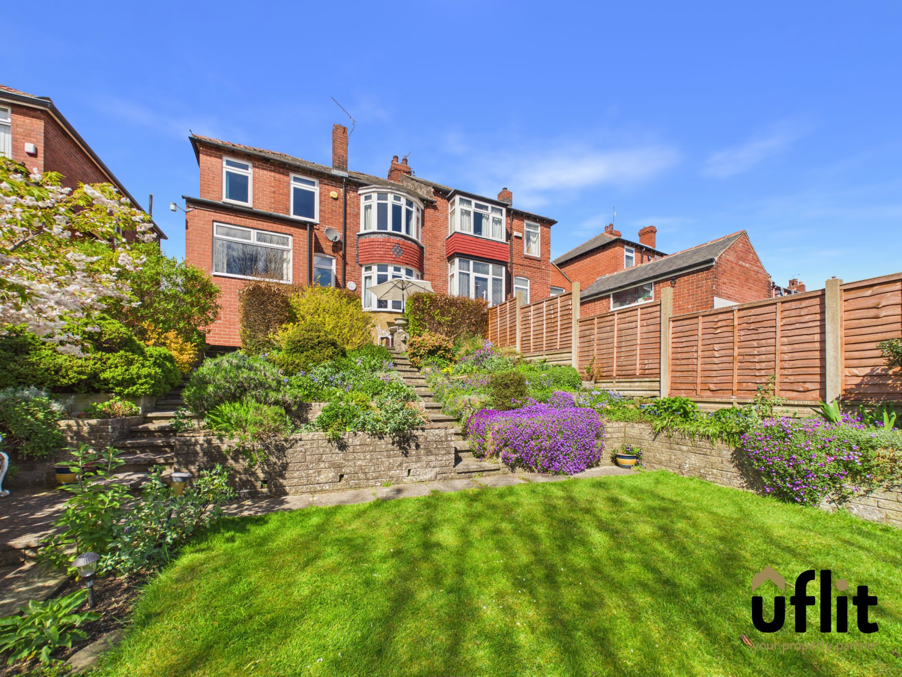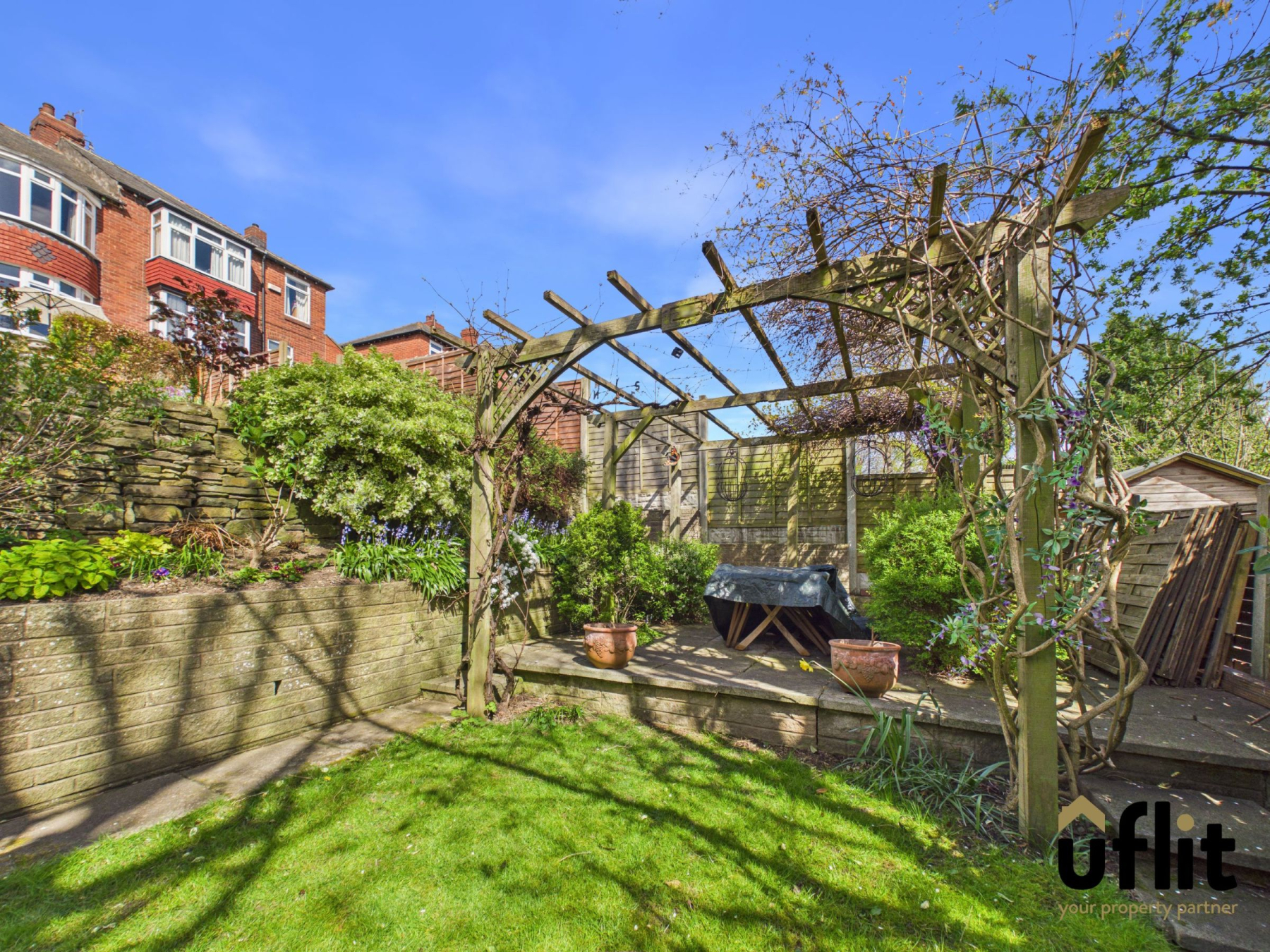 Externally, the property benefits from an enclosed, south-facing garden arranged over three tiers. A patio area provides the perfect space for outdoor seating and entertaining, with steps leading down to a lawned garden surrounded by mature trees and shrubbery. Further steps lead to a third tier, offering an additional lawned area with a patio and a wooden pergola, creating a private and relaxing outdoor retreat. The views from the top and middle of the garden across Longley park and beyond are simply stunning. At night the twinkling lights of Sheffield city centre are visible in the distance .