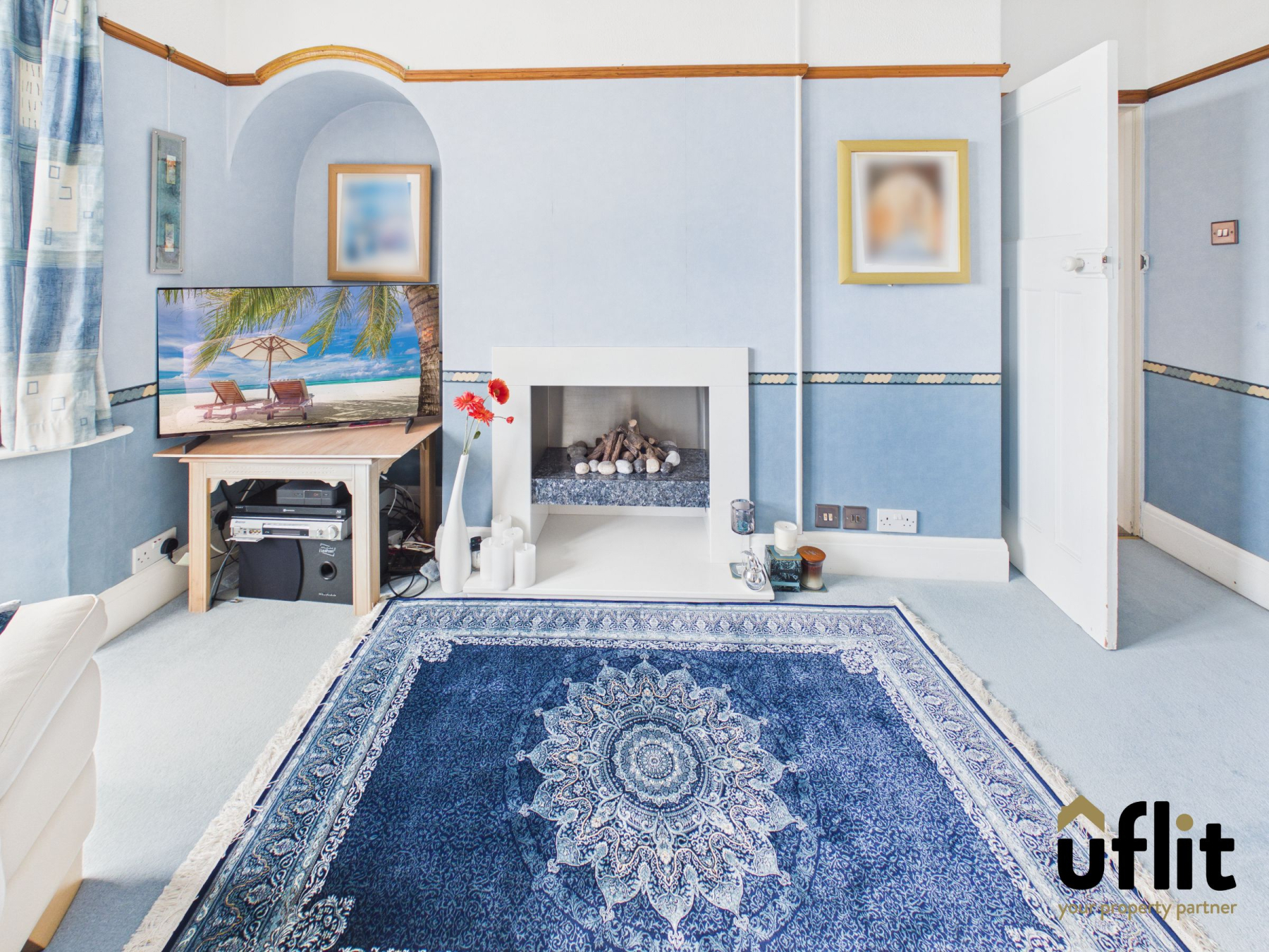 Positioned to the front of the property, this charming second reception room features carpet flooring and a radiator. A bay window to the front adds character and light, while a gas fire with marble surround creates a warm and inviting atmosphere. Decorative touches including dado rail and coving further enhance the room's traditional appeal.